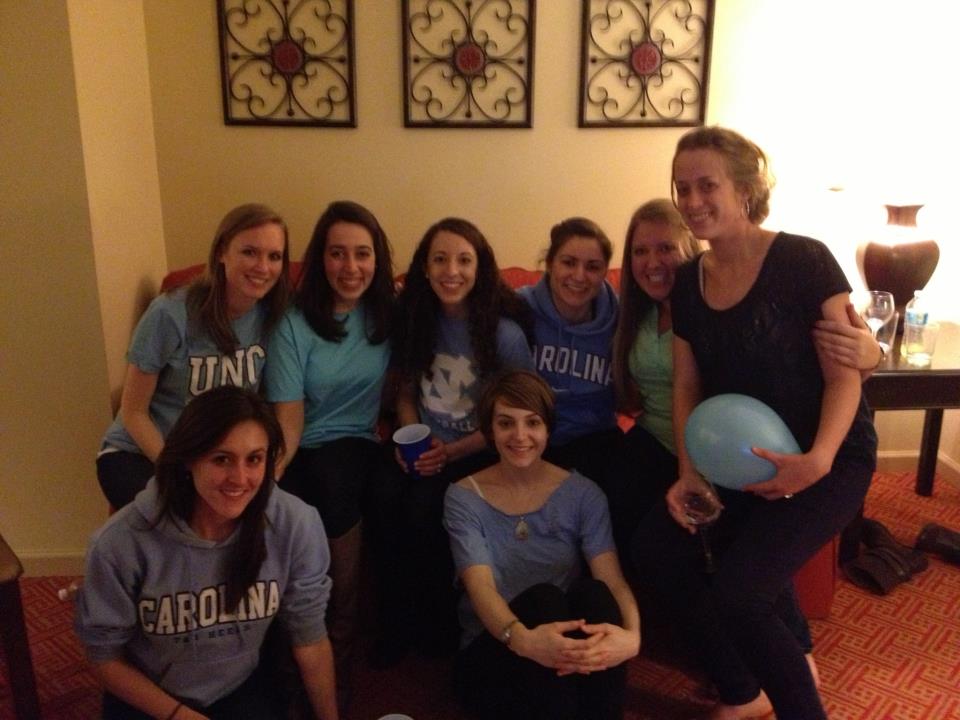 So last weekend, two of my best friends from UNC, Jenny & Christine, were coming into town for a weekend visit. We’d had this weekend planned since early January, and it wasn’t even a birthday related trip. As you know about me, I’m a huge planner… but I refrained for the weekend & made myself be spontaneous with their trip. I guess this worked into their plans quite well, because I didn’t suspect a thing or ask any questions. Saturday morning, five minutes after Jenny arrived (as planned), my doorbell rang. I told Jenny that I never answer the door at our house, but she insisted I do. To my complete and utter surprise, all eight of my very best friends from UNC were standing on my doorstep. Seriously, wow.