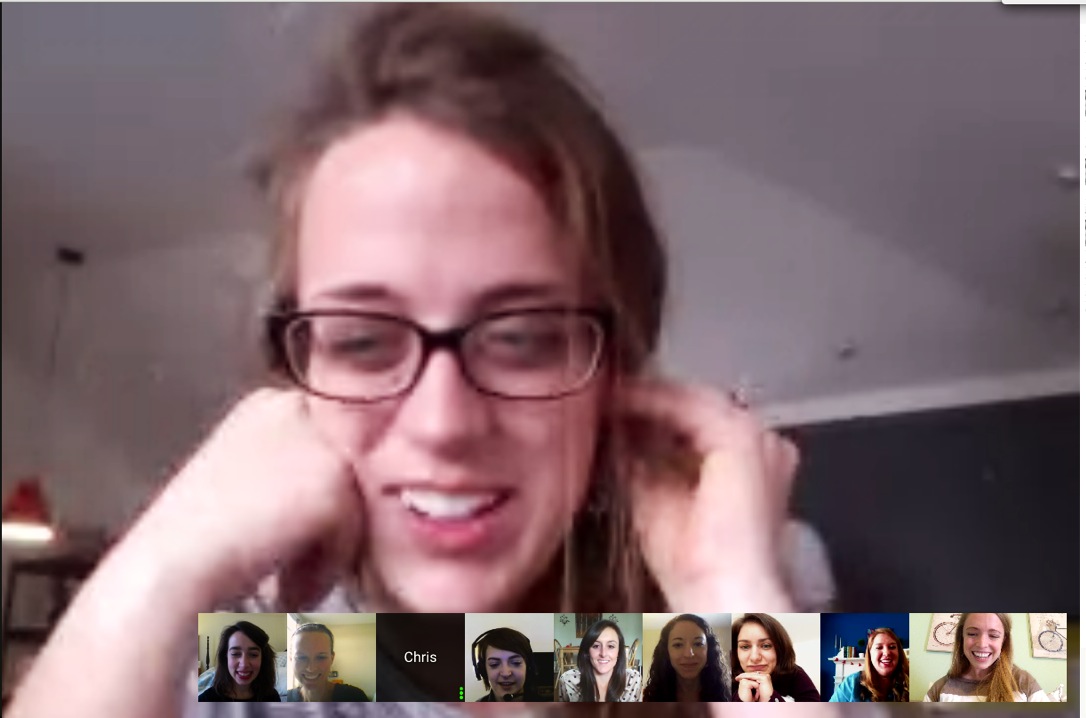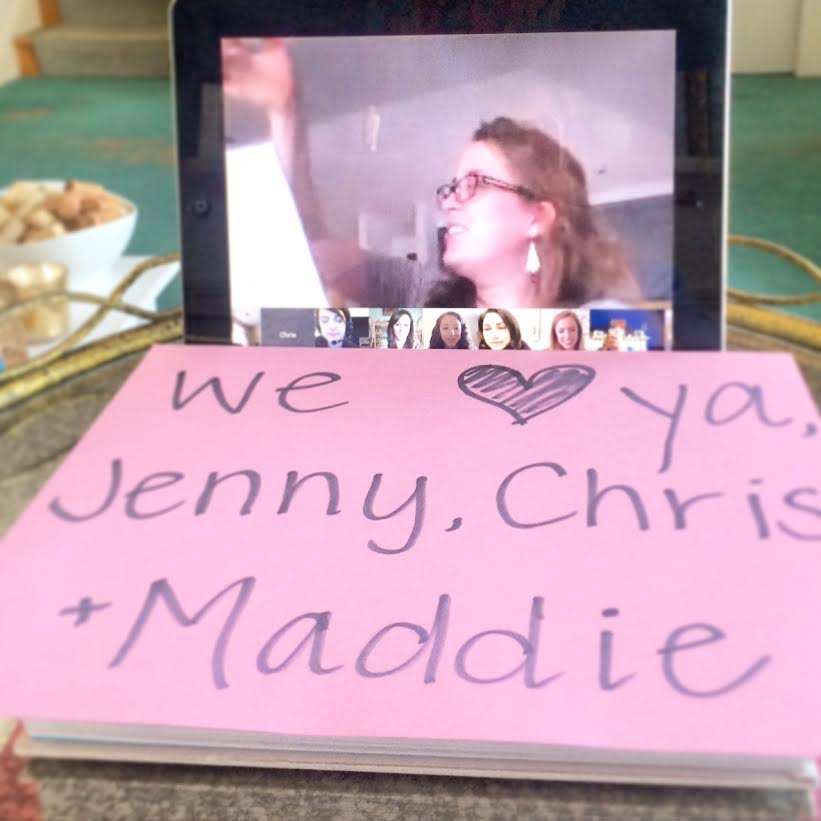 Our friend Jenny is pregnant and is due with her baby girl in a few weeks! While we couldn’t all journey to Tennessee, as much as we all want to, for a baby shower, we threw her the next best thing: a surprise, international, virtual baby shower! Using Google hangout (thank you, technology!), together we were able to more properly celebrate the impending arrival of her bundle of joy! We had her husband reserve the time (2:00pm on a Sunday, planned months in advance!) and he hid the presents and card that we shipped her way. We all joined the Google hangout right on time (we had a trial run earlier in the week!), and Jenny popped in at 2:05 to her surprise – seeing so many of her best friends in one place!