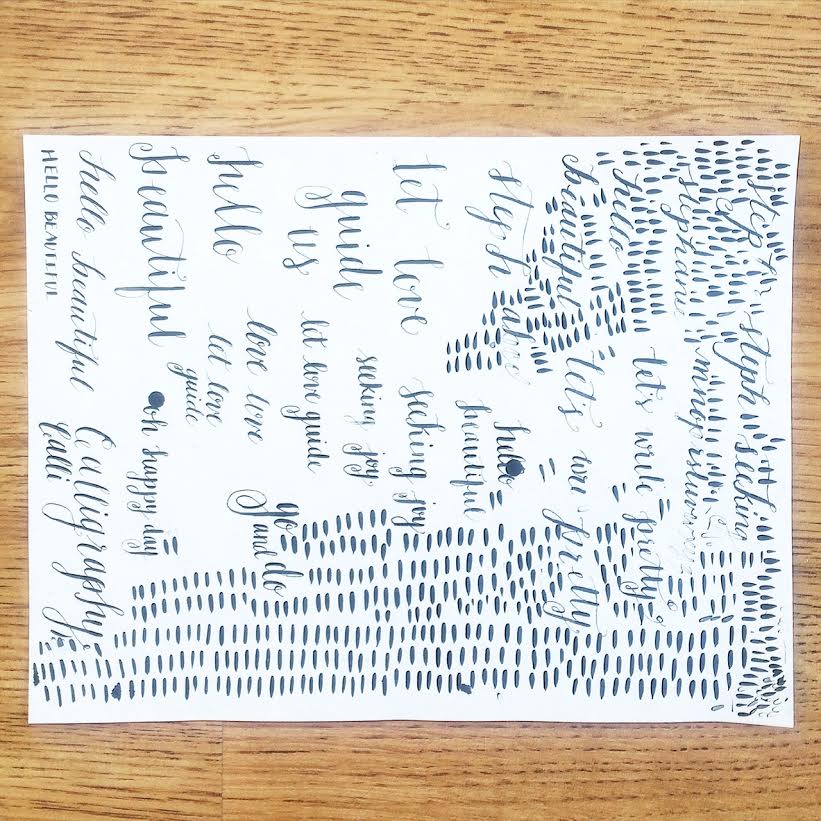The more I look at it, the more I love this snapshot of a piece of paper during a big calligraphy order recently. It’s pretty, in a way, and it makes me smile, too! This piece of paper shows the less than pretty side of calligraphy… dabbing ink off of your nib every few letters, ink splotches & drips & spills, testing out new styles, cramped hands, ink stained fingers.
