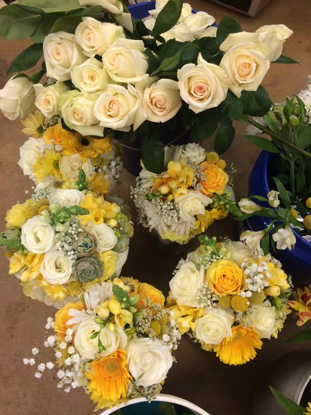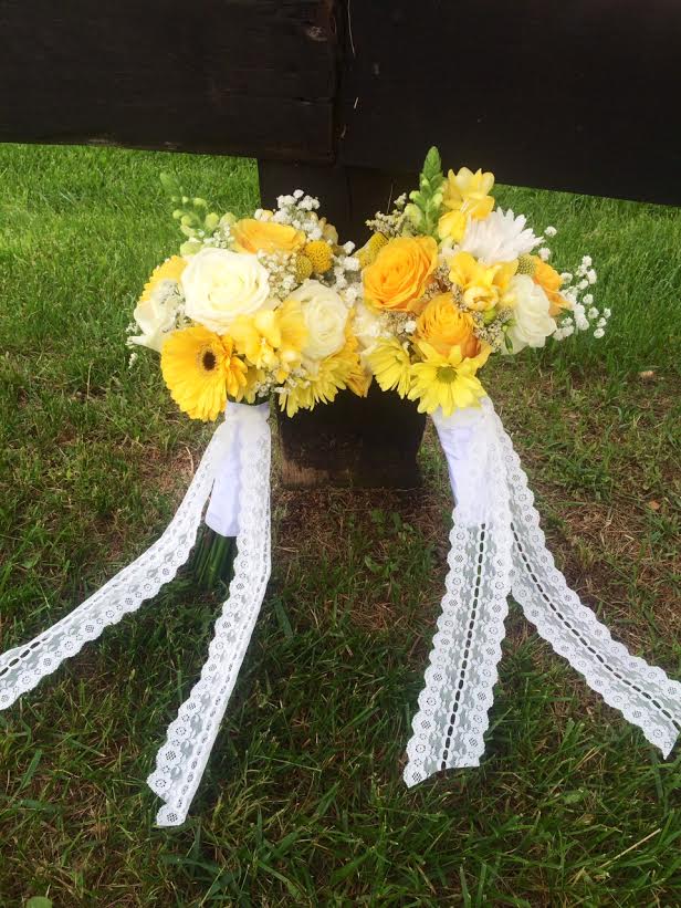 I had the honor of doing all of the florals for my May bride’s wedding at Wolftrap Farm in Charlottesville, Virginia! Beth Anne and her now-husband Chris were fully on board and excited about having me do all of the floral design and floral arranging for their wedding, and needless to say, I was so incredibly excited! I love that they trusted me enough to do it all for them, and it was such a thrill for me to pick out flowers, process the thousand stems, and design the bouquets, boutonnieres, and centerpieces. Beth Anne definitely wanted yellow and white flowers to complement the design of their wedding, and billy balls were decided upon early in the process. She also loves the look of succulents, which I had never worked with before in wedding flowers, and I love how the contrasted – but complemented – the yellow and white flowers in the bouquets. I selected a mix of yellow and white roses, freesia, billy balls, snapdragons, daisies, baby’s breath, and billy balls. Some of the white roses arrived a little sad looking, so we were able to get a new shipment of white roses delivered the day before the wedding. With those roses, we had hundreds upon hundreds of roses to use in bouquets and arrangements, and I actually didn’t even end up using them all! I guess that’s not necessarily a bad problem to have… but I sure did try to use as many as I possibly could!