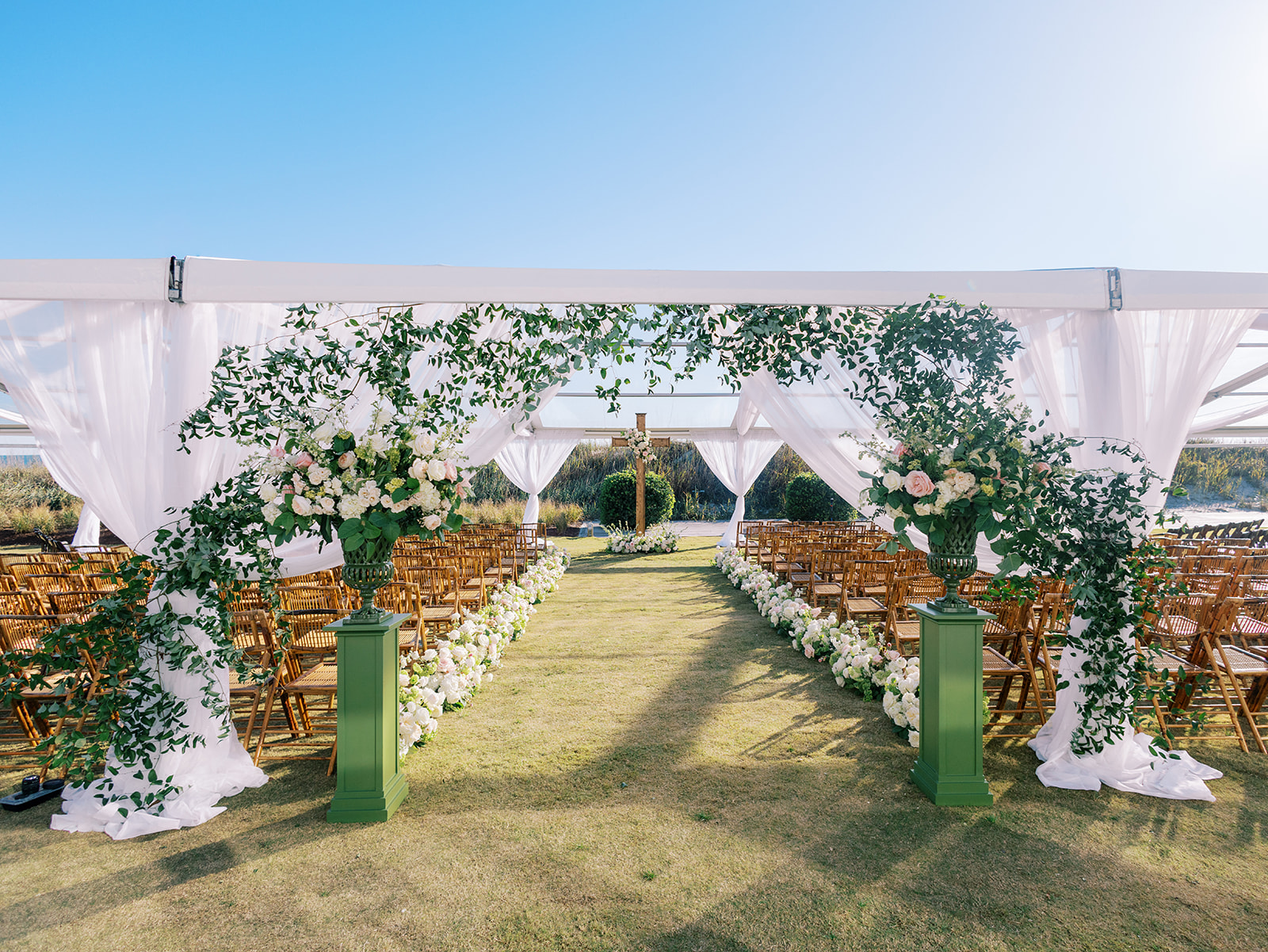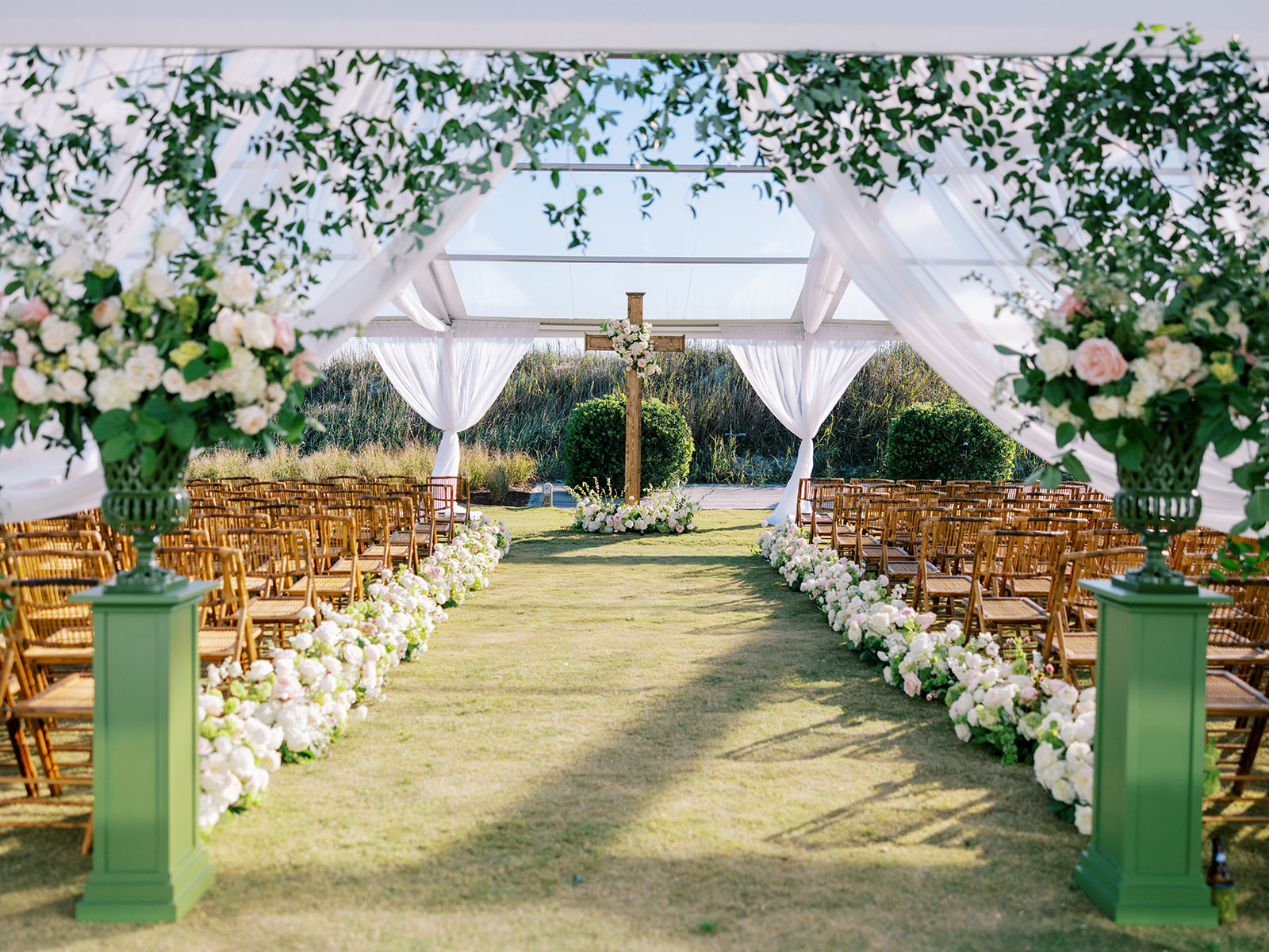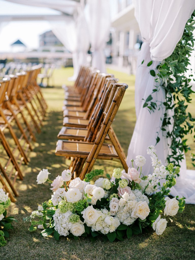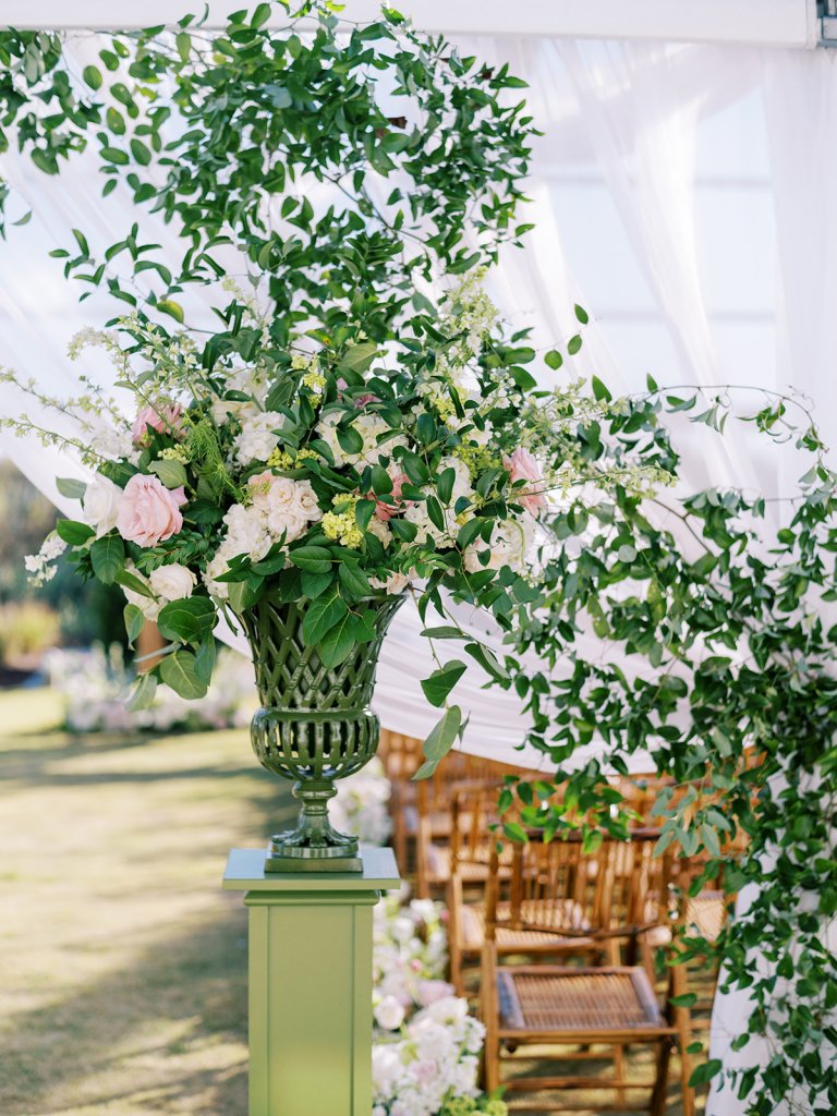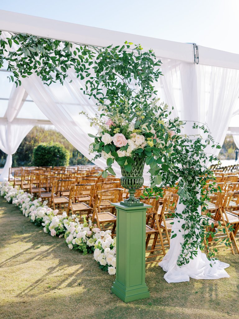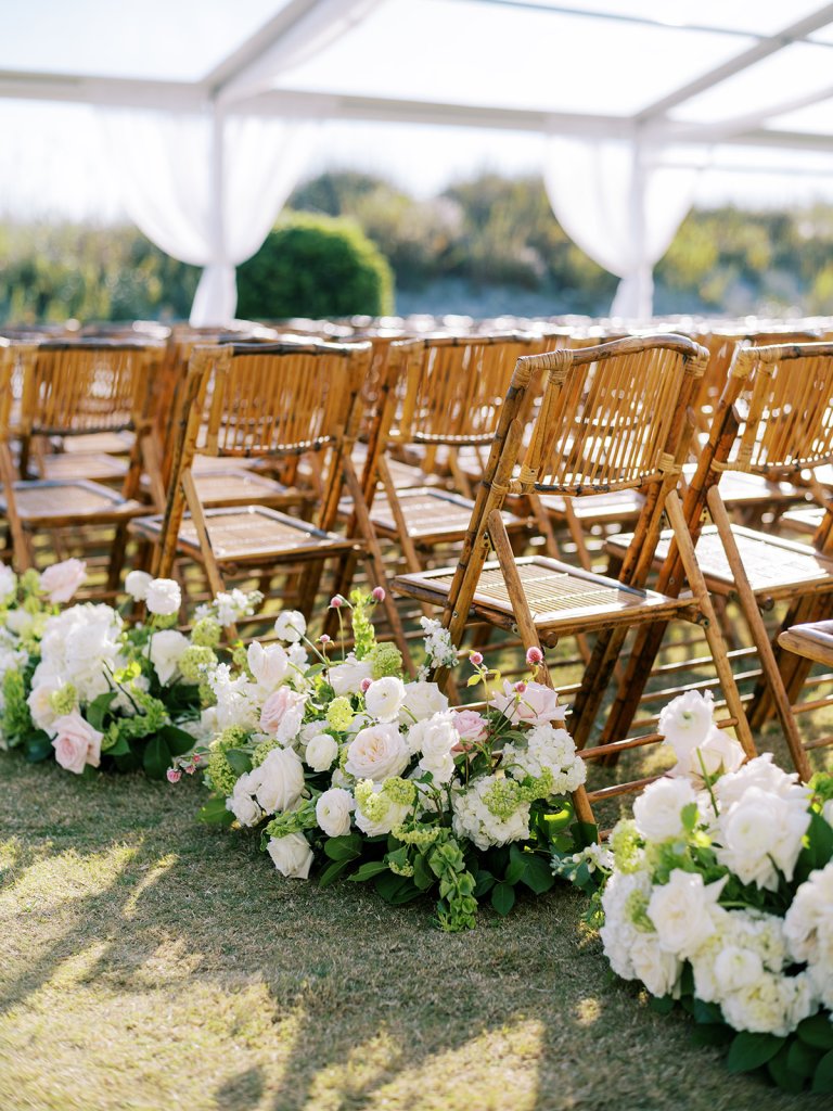 We had the wonderful Hathaway Floral Design team build a custom wooden cross for us (not one bit rustic!) that was the focal point of Shields and David’s ceremony, and the cross and base of the cross were both adorned in lush flowers. We also had two towering pedestal urns (custom color-matched, of course!) framing the entryway of the ceremony tent to make a dramatic and memorable entrance alongside romantic draping and organic greenery on the tent entrance. And, of course, those bamboo chairs were further highlighted with the most beautiful aisle floral runners that were the perfect backdrop for Shields to walk down the aisle to her groom.