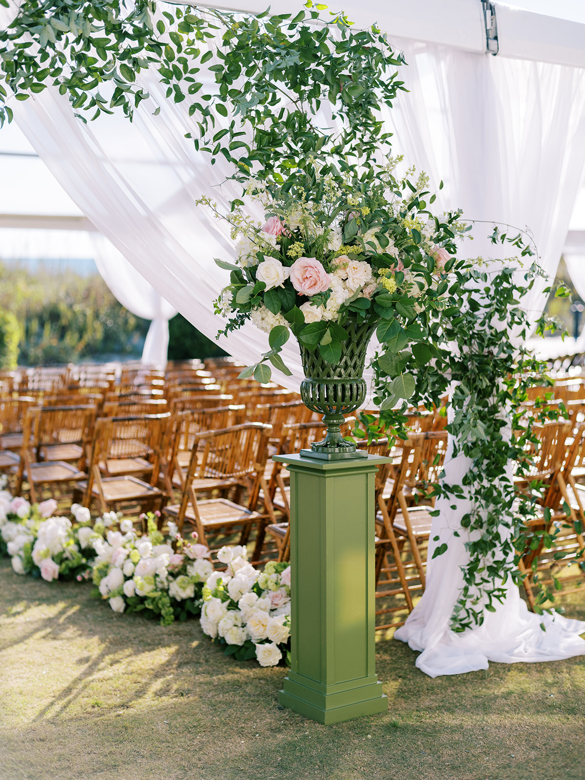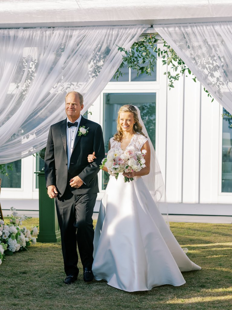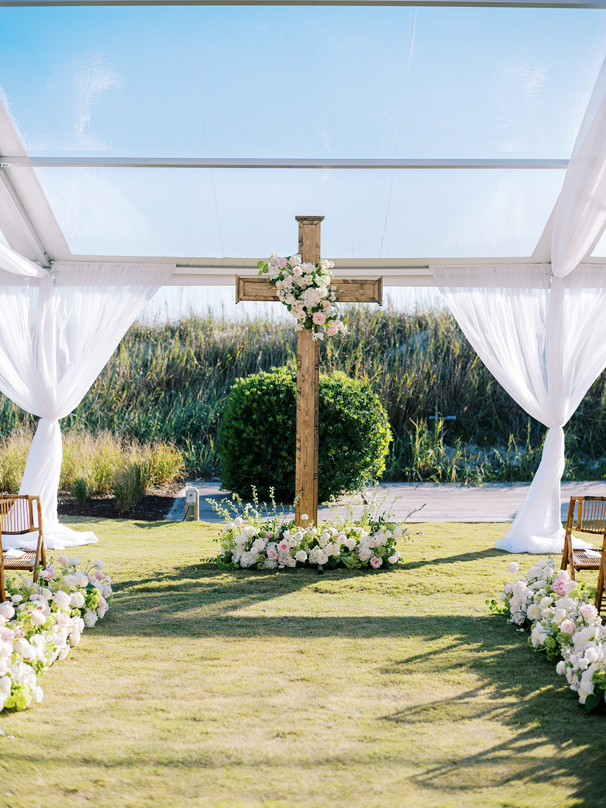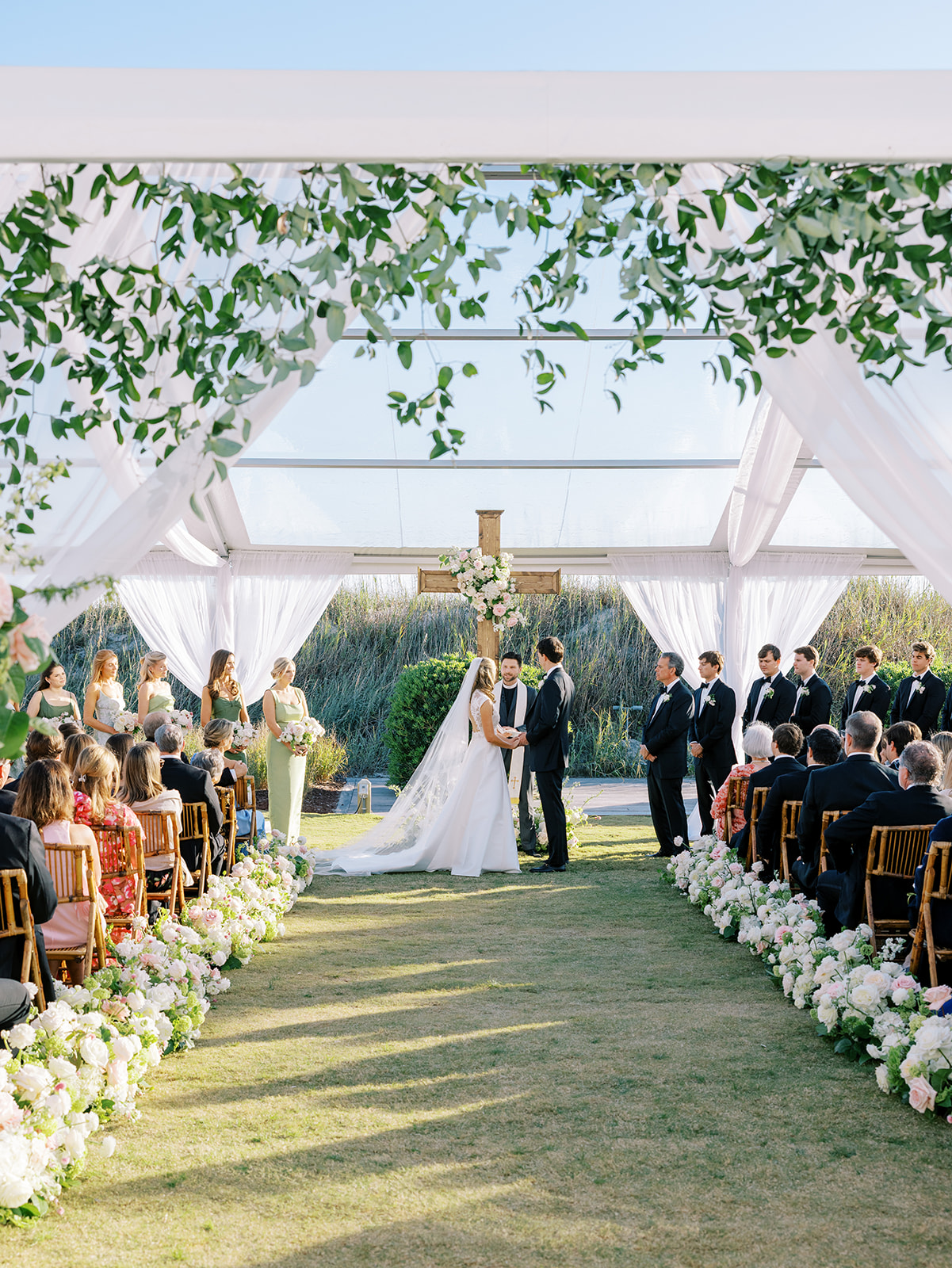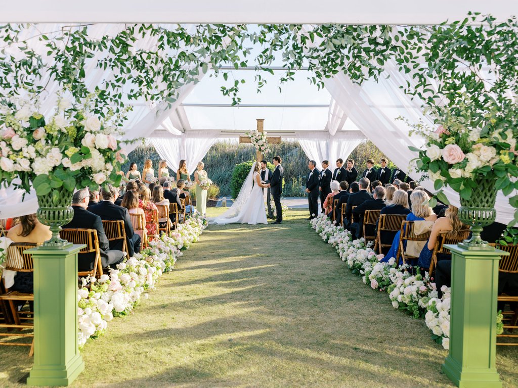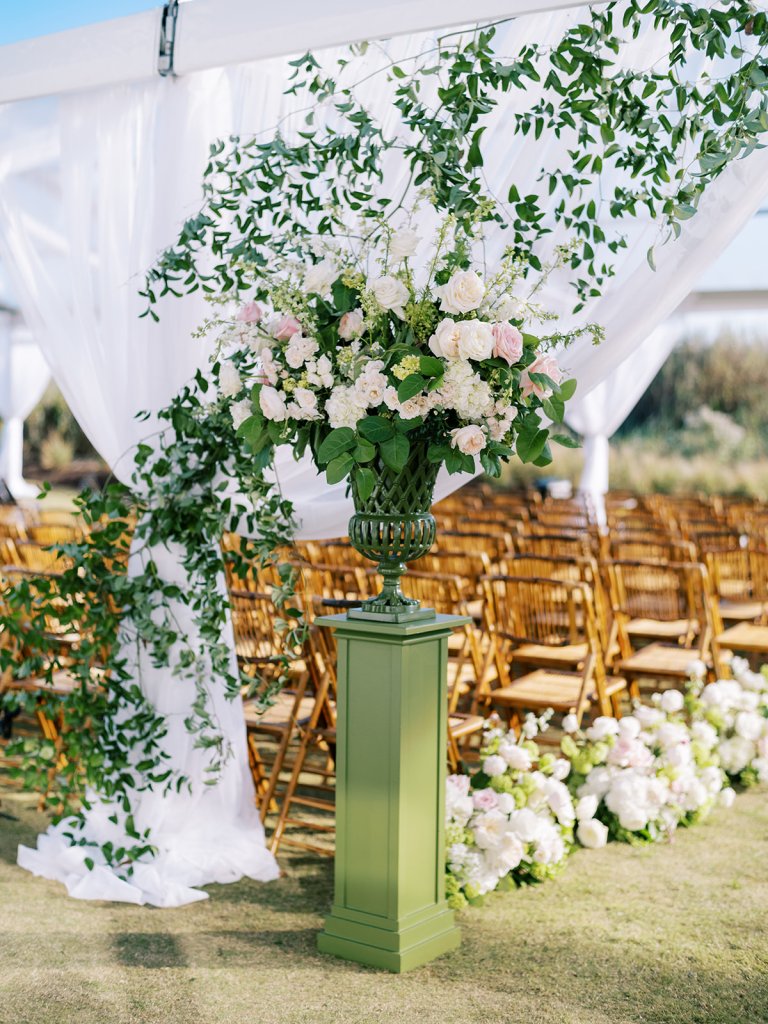 We had the wonderful Hathaway Floral Design team build a custom wooden cross for us (not one bit rustic!) that was the focal point of Shields and David’s ceremony, and the cross and base of the cross were both adorned in lush flowers. We also had two towering pedestal urns (custom color-matched, of course!) framing the entryway of the ceremony tent to make a dramatic and memorable entrance alongside romantic draping and organic greenery on the tent entrance. And, of course, those bamboo chairs were further highlighted with the most beautiful aisle floral runners that were the perfect backdrop for Shields to walk down the aisle to her groom.