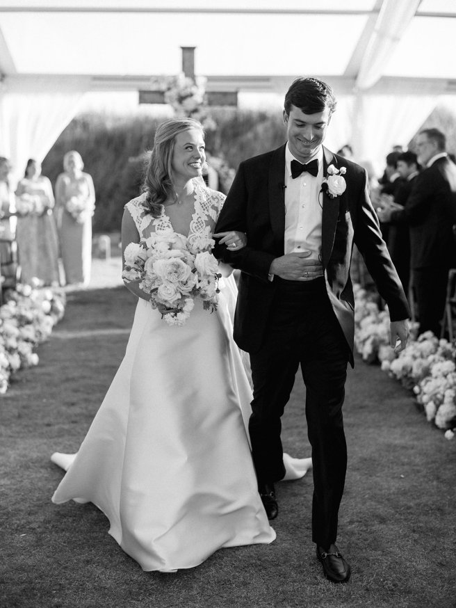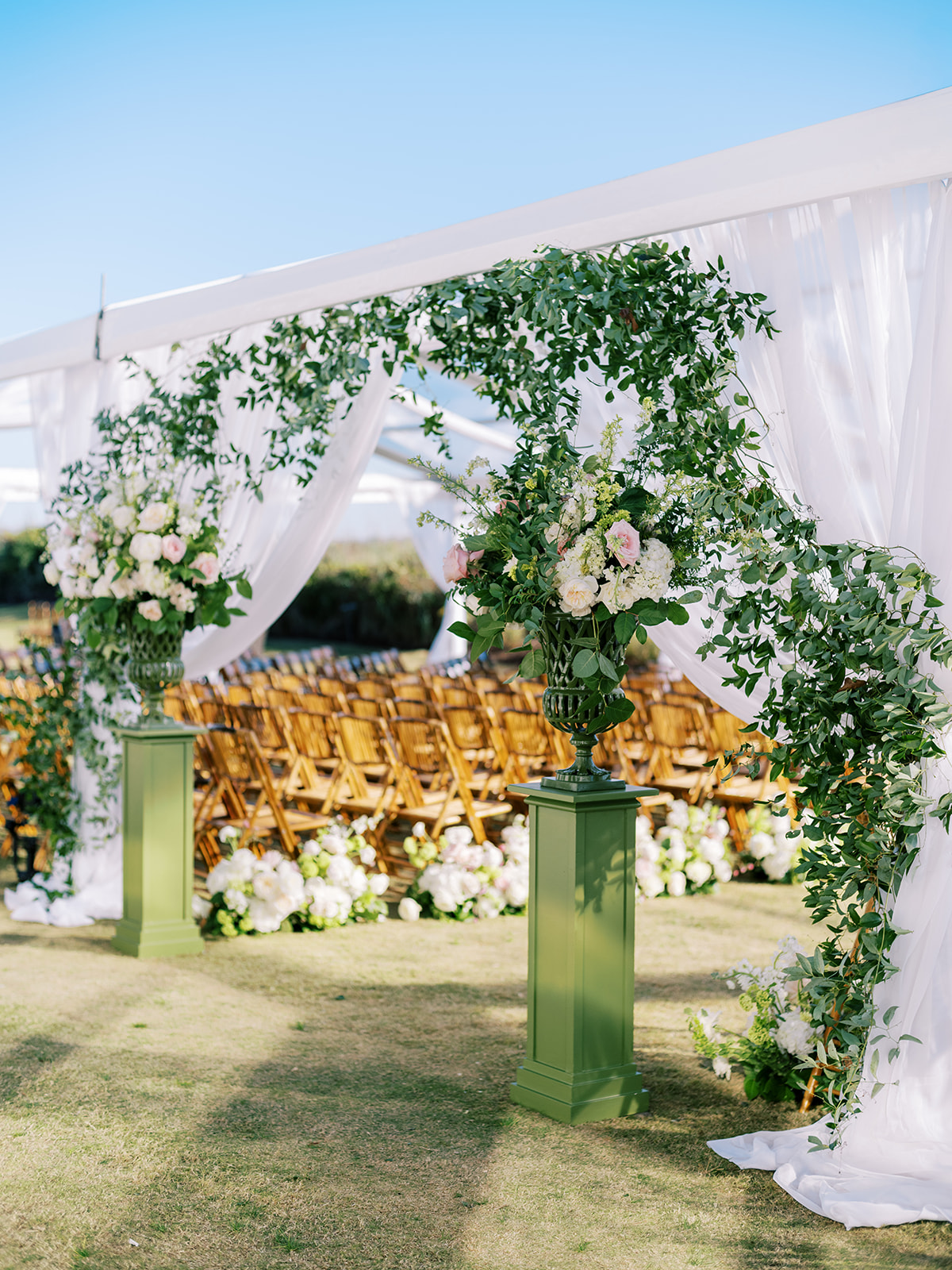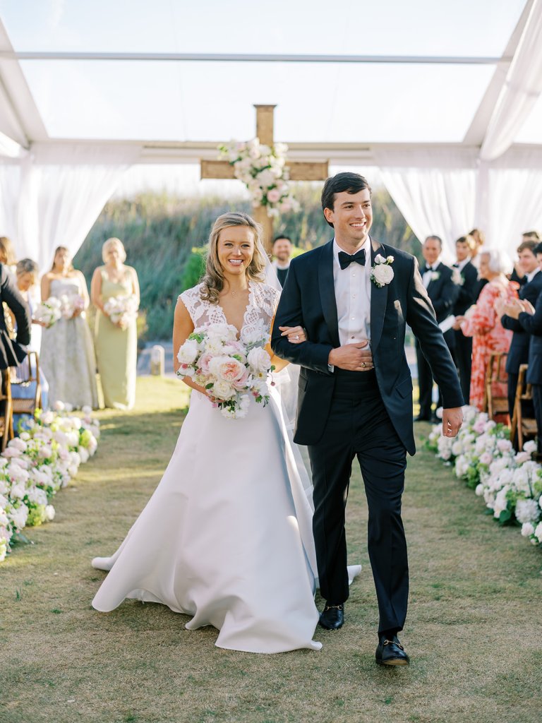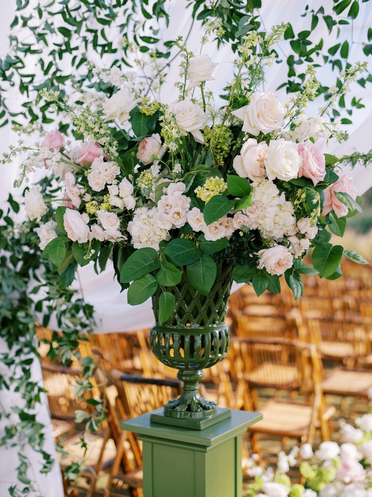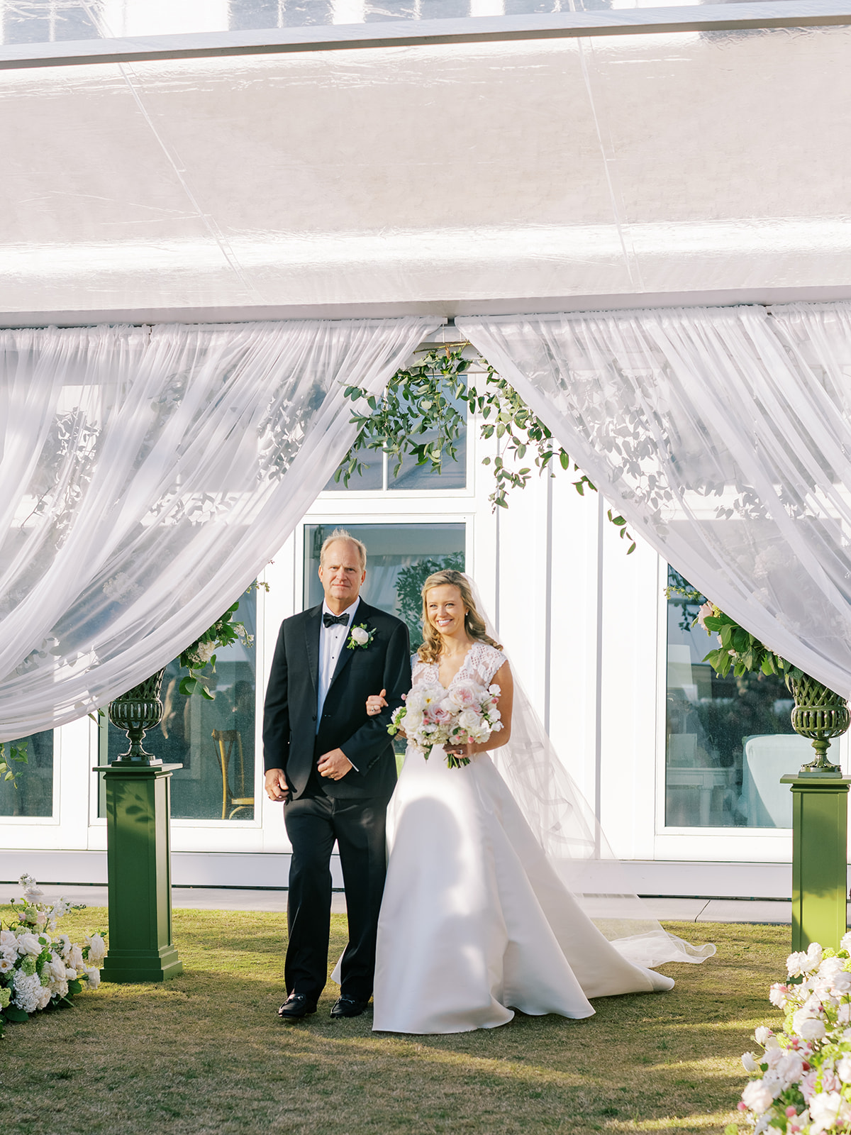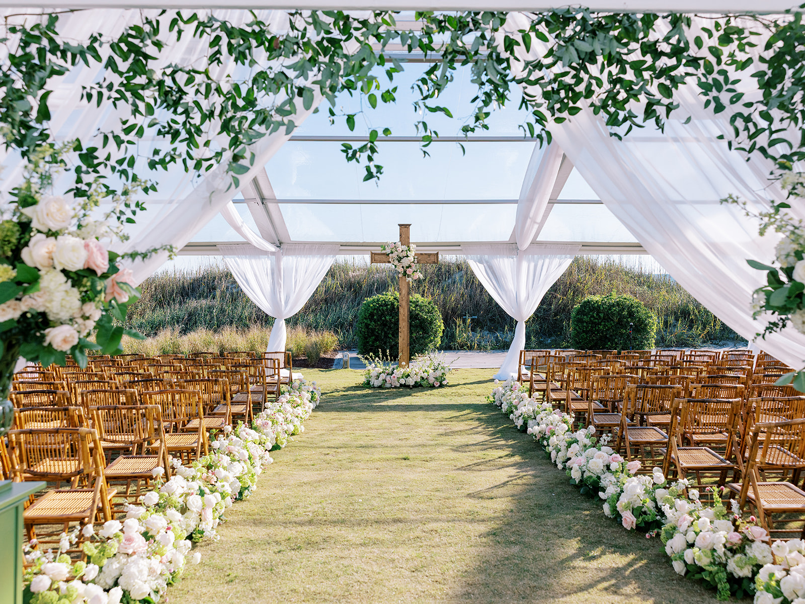 We had the wonderful Hathaway Floral Design team build a custom wooden cross for us (not one bit rustic!) that was the focal point of Shields and David’s ceremony, and the cross and base of the cross were both adorned in lush flowers. We also had two towering pedestal urns (custom color-matched, of course!) framing the entryway of the ceremony tent to make a dramatic and memorable entrance alongside romantic draping and organic greenery on the tent entrance. And, of course, those bamboo chairs were further highlighted with the most beautiful aisle floral runners that were the perfect backdrop for Shields to walk down the aisle to her groom.