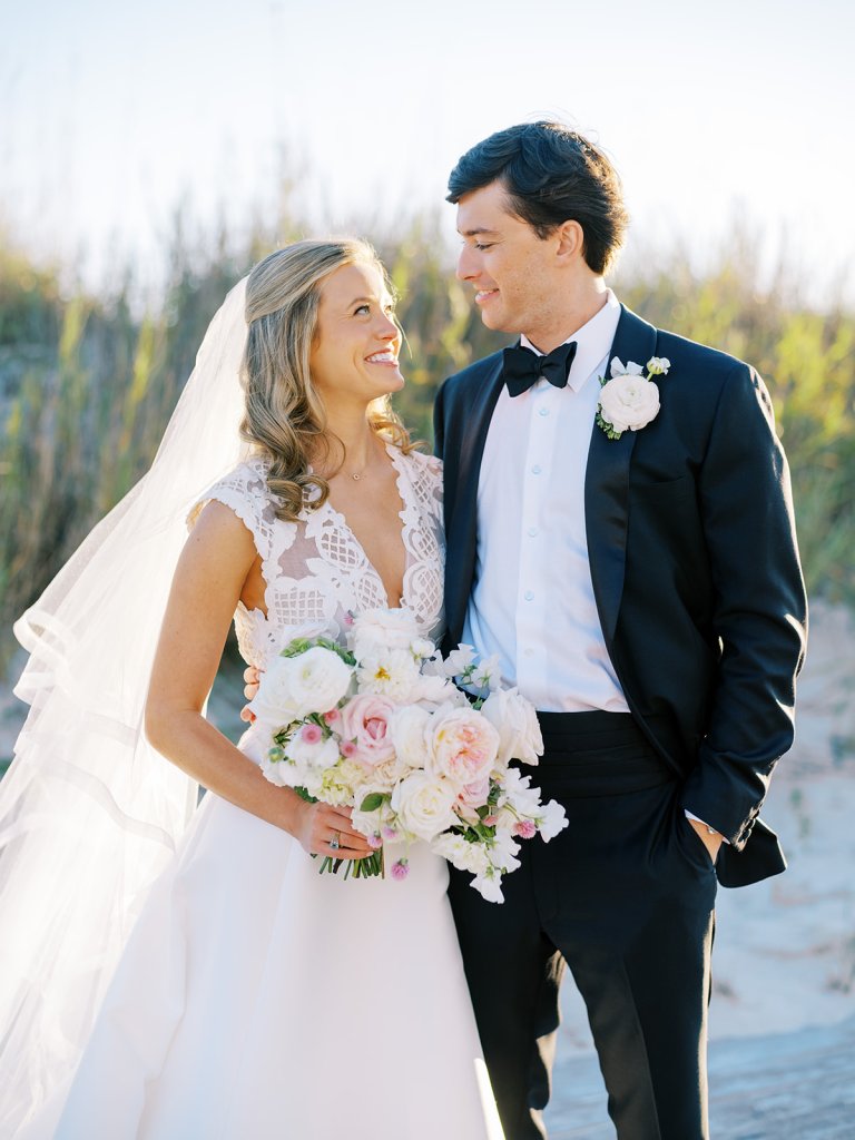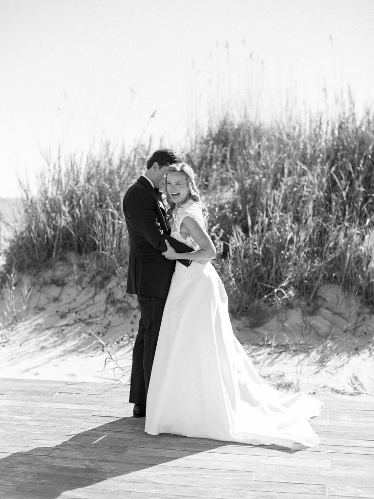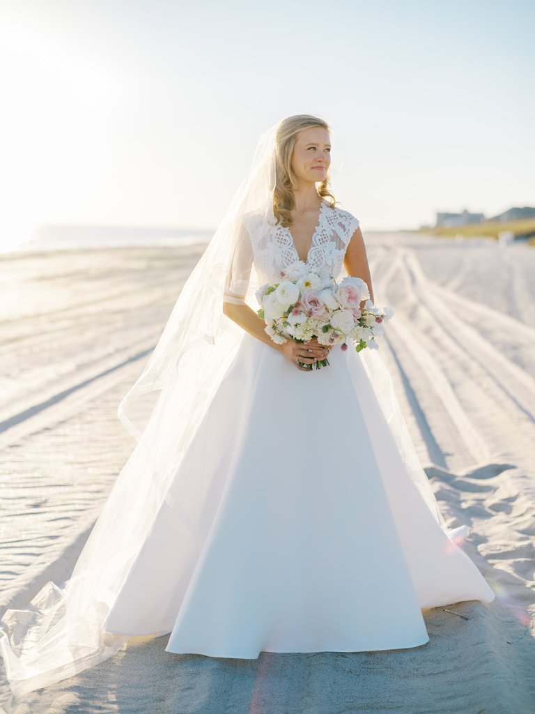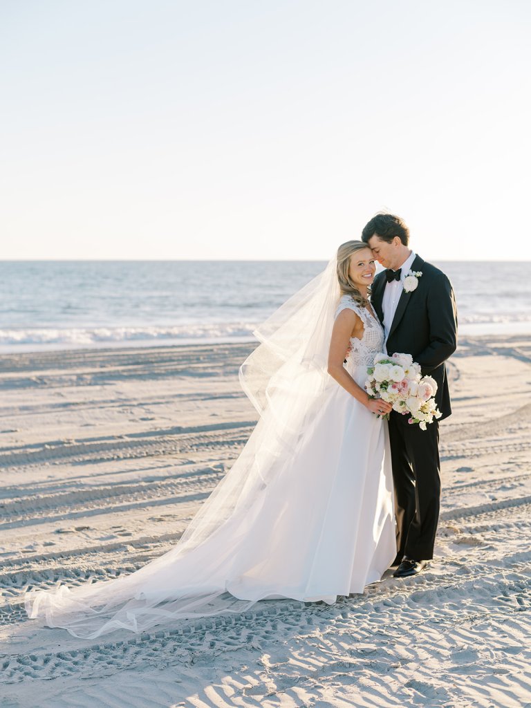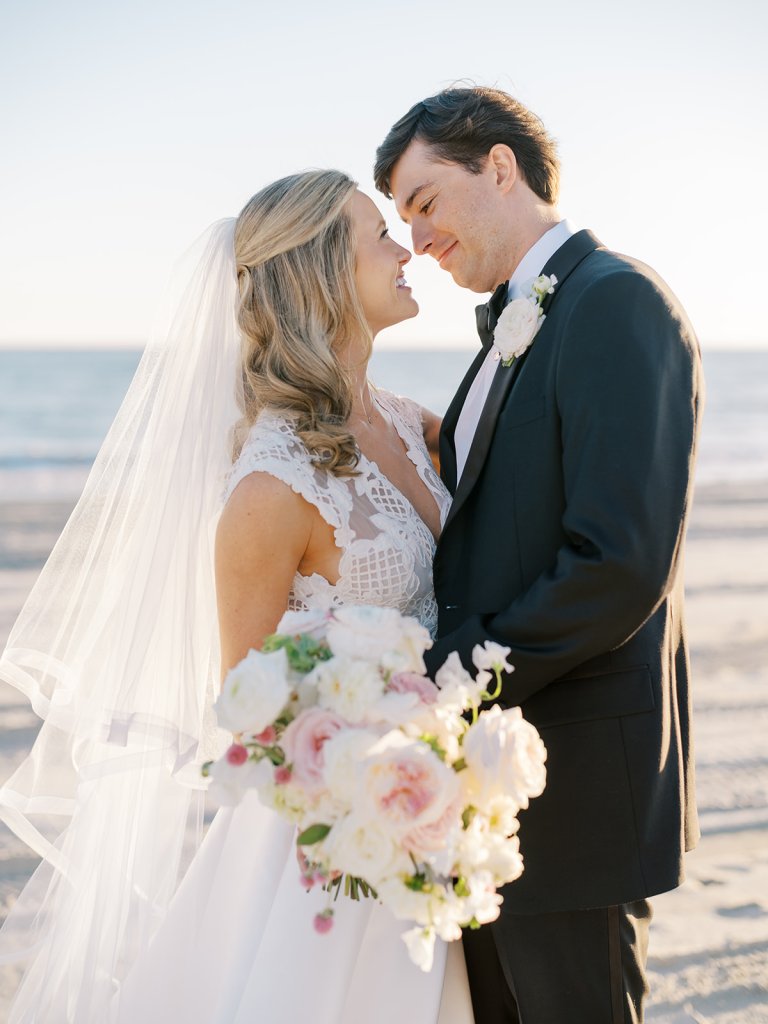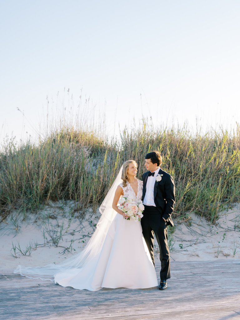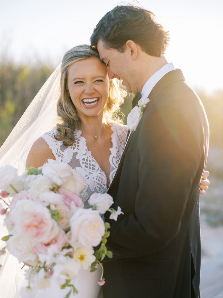 I can’t get over the radiance of these two and their unparalleled joy, their unabashed love for one another, and the excitement and celebration that exuded from every single moment of this magical day. It was spectacular in every way. And sneaking away to the sand for a few minutes of dreamy golden hour photos was just icing on the cake as these two got to bask in their new marriage and the anticipation of all the fun continuing to unfold at their wedding. Simply stunning in every single way! Shields’s gown! Her veil! That bouquet! The light! Their love & joy!