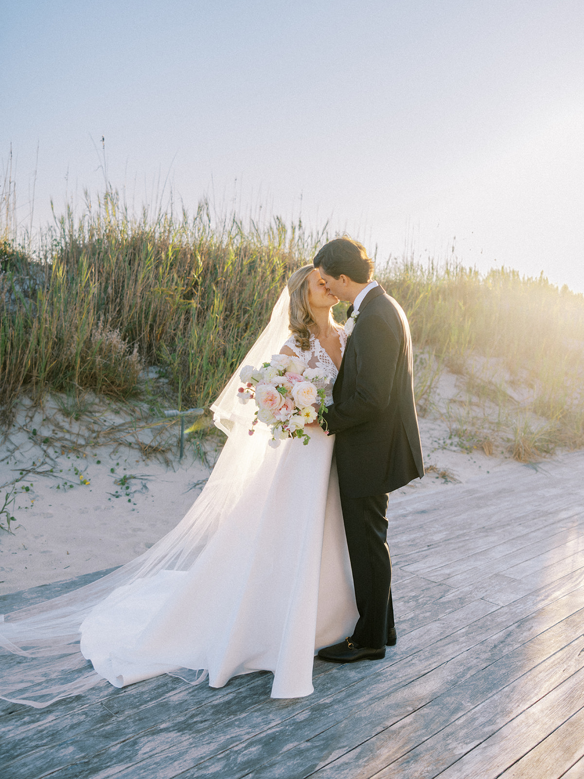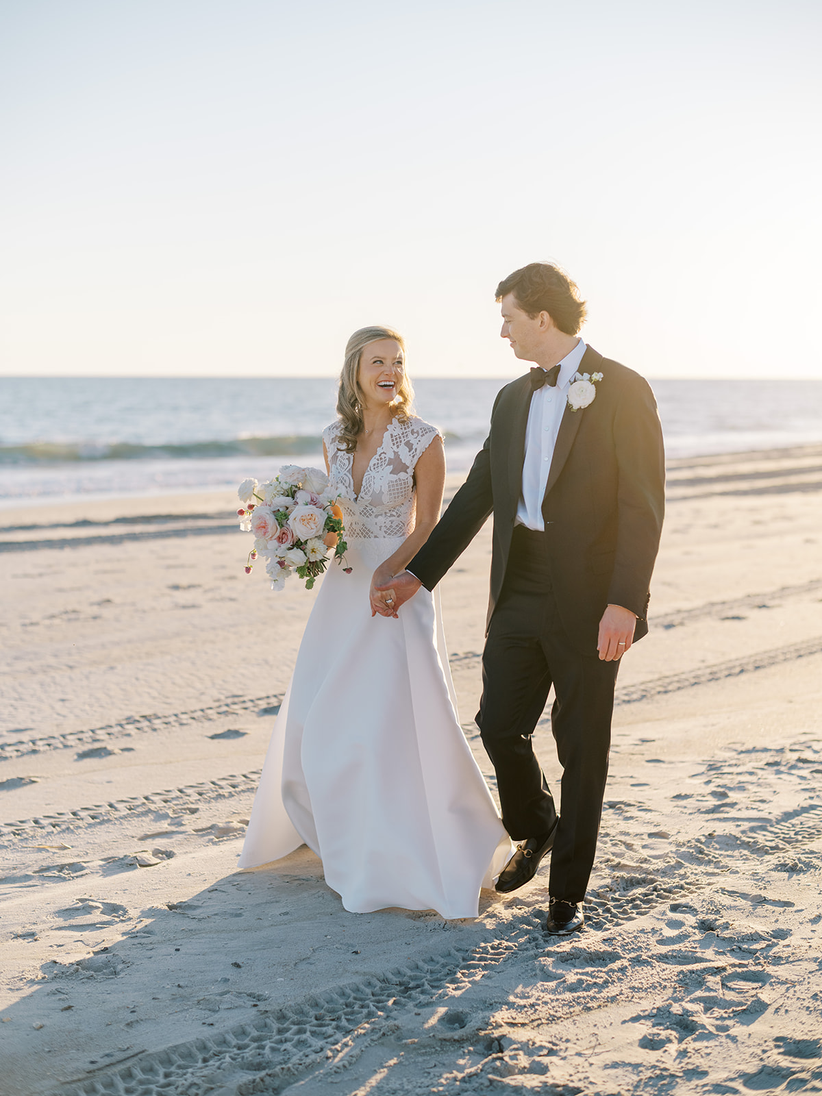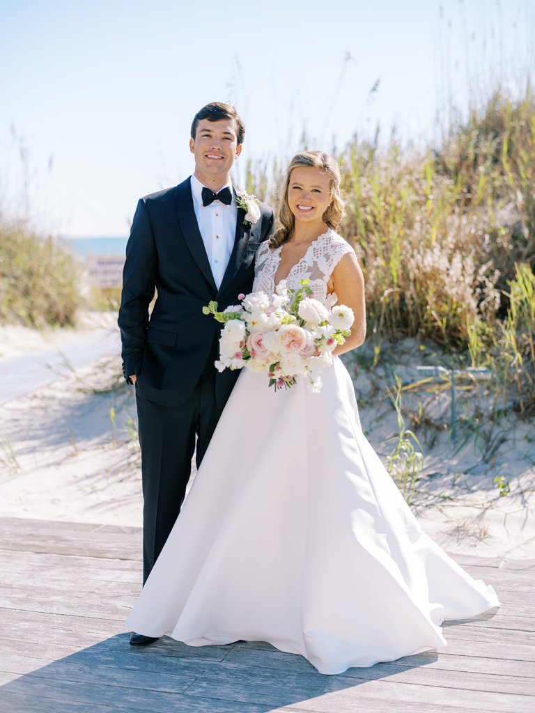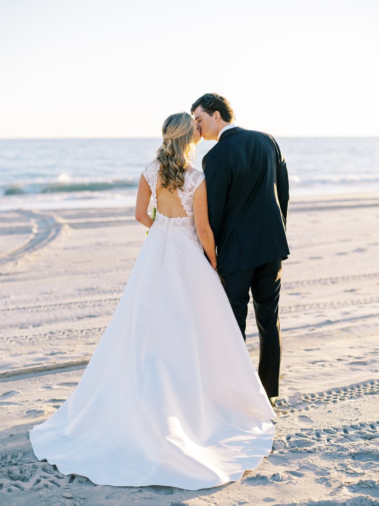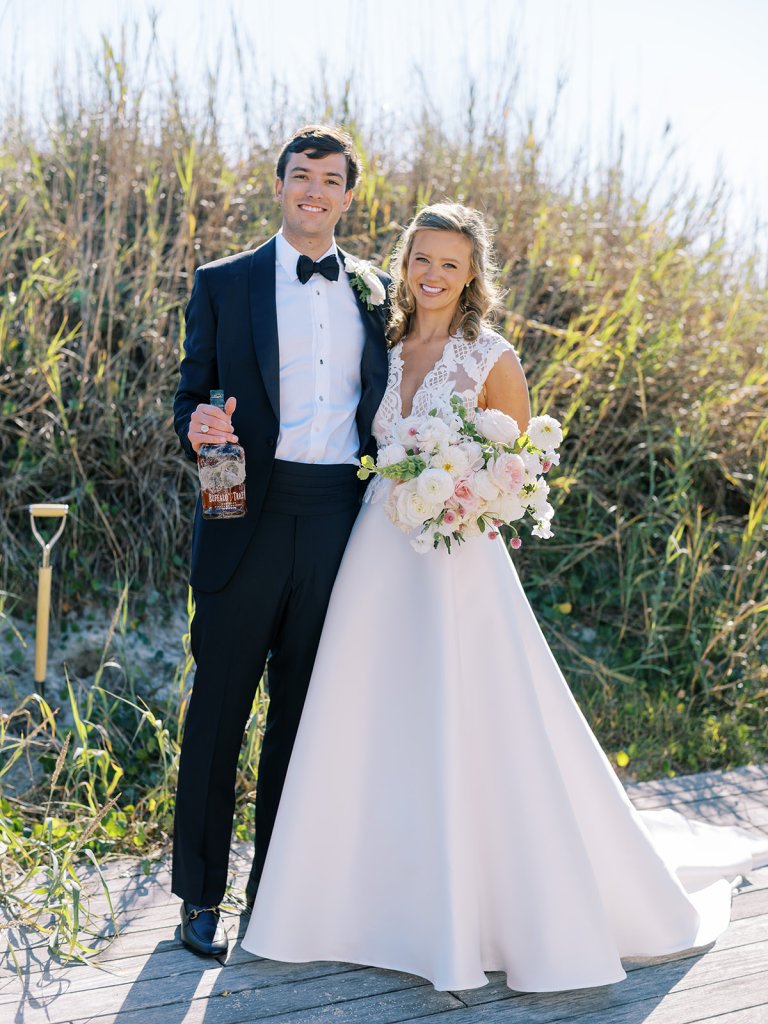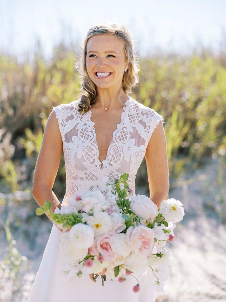 I can’t get over the radiance of these two and their unparalleled joy, their unabashed love for one another, and the excitement and celebration that exuded from every single moment of this magical day. It was spectacular in every way. And sneaking away to the sand for a few minutes of dreamy golden hour photos was just icing on the cake as these two got to bask in their new marriage and the anticipation of all the fun continuing to unfold at their wedding. Simply stunning in every single way! Shields’s gown! Her veil! That bouquet! The light! Their love & joy!
