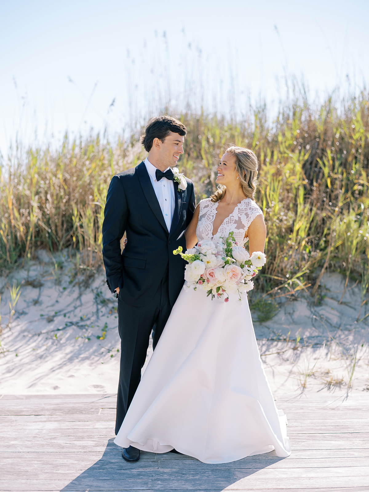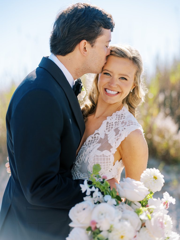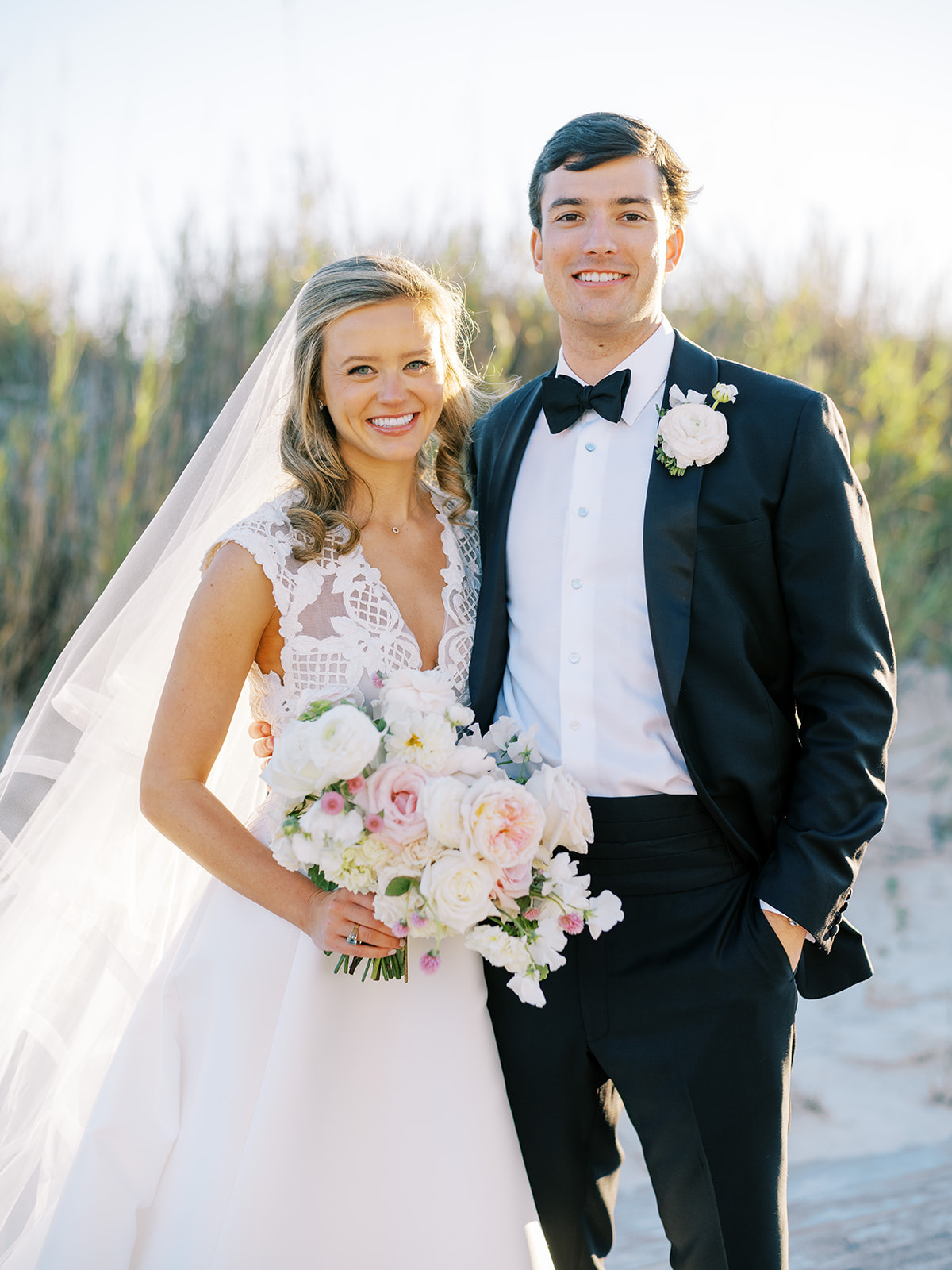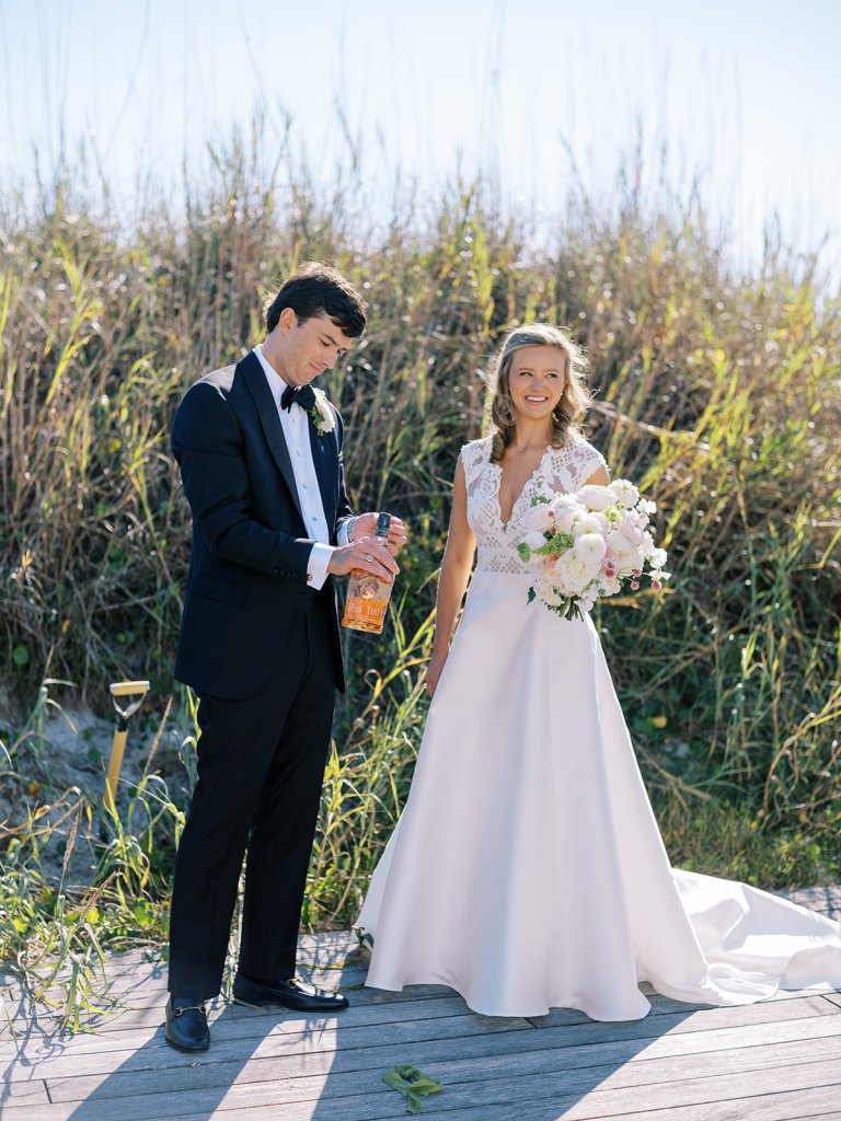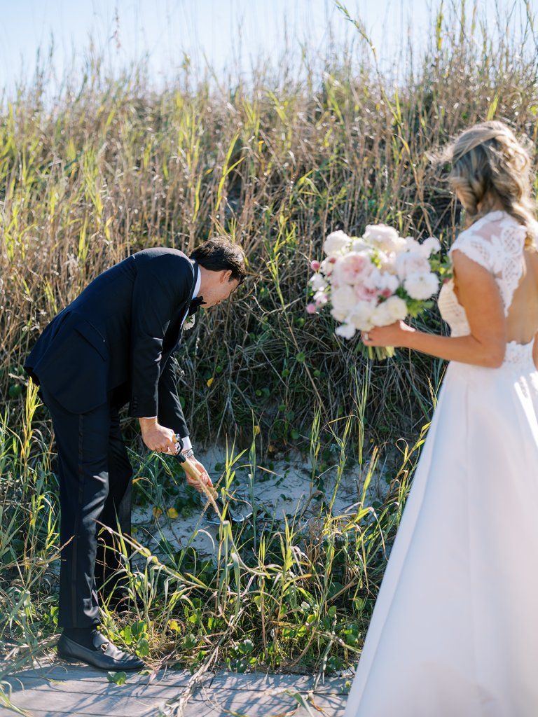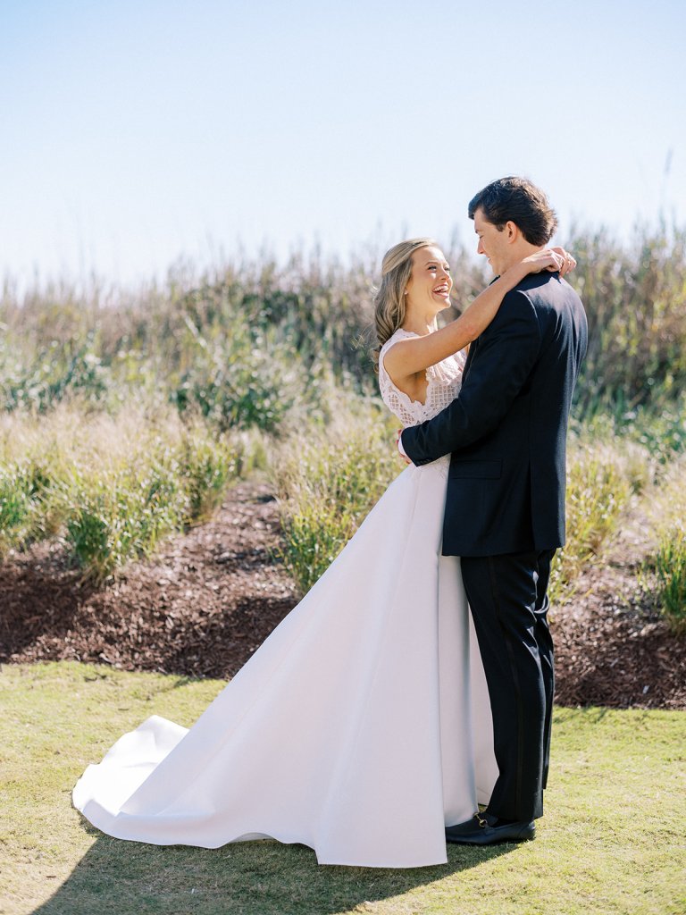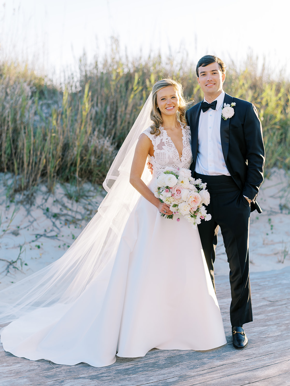 I can’t get over the radiance of these two and their unparalleled joy, their unabashed love for one another, and the excitement and celebration that exuded from every single moment of this magical day. It was spectacular in every way. And sneaking away to the sand for a few minutes of dreamy golden hour photos was just icing on the cake as these two got to bask in their new marriage and the anticipation of all the fun continuing to unfold at their wedding. Simply stunning in every single way! Shields’s gown! Her veil! That bouquet! The light! Their love & joy!