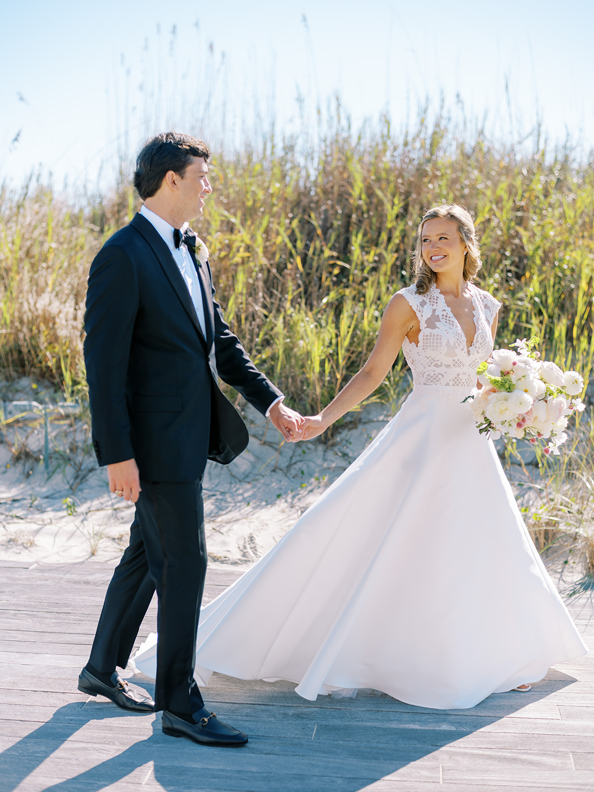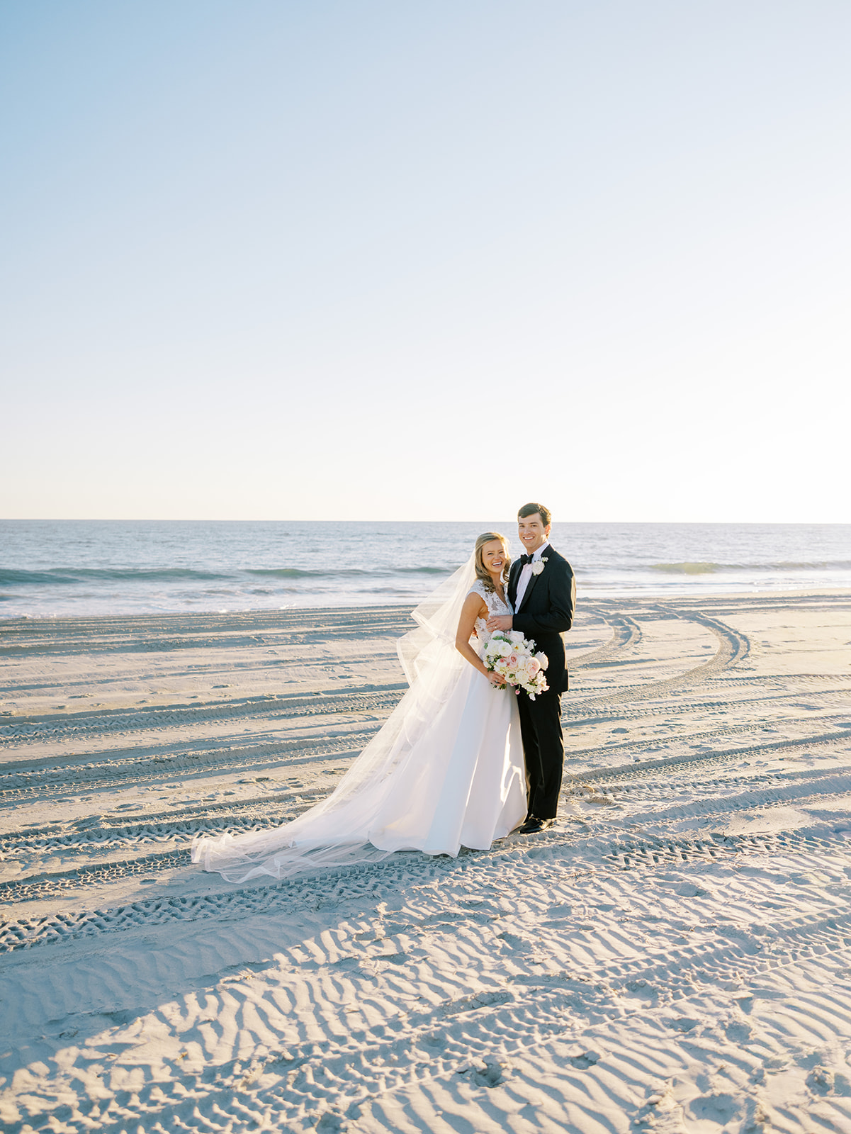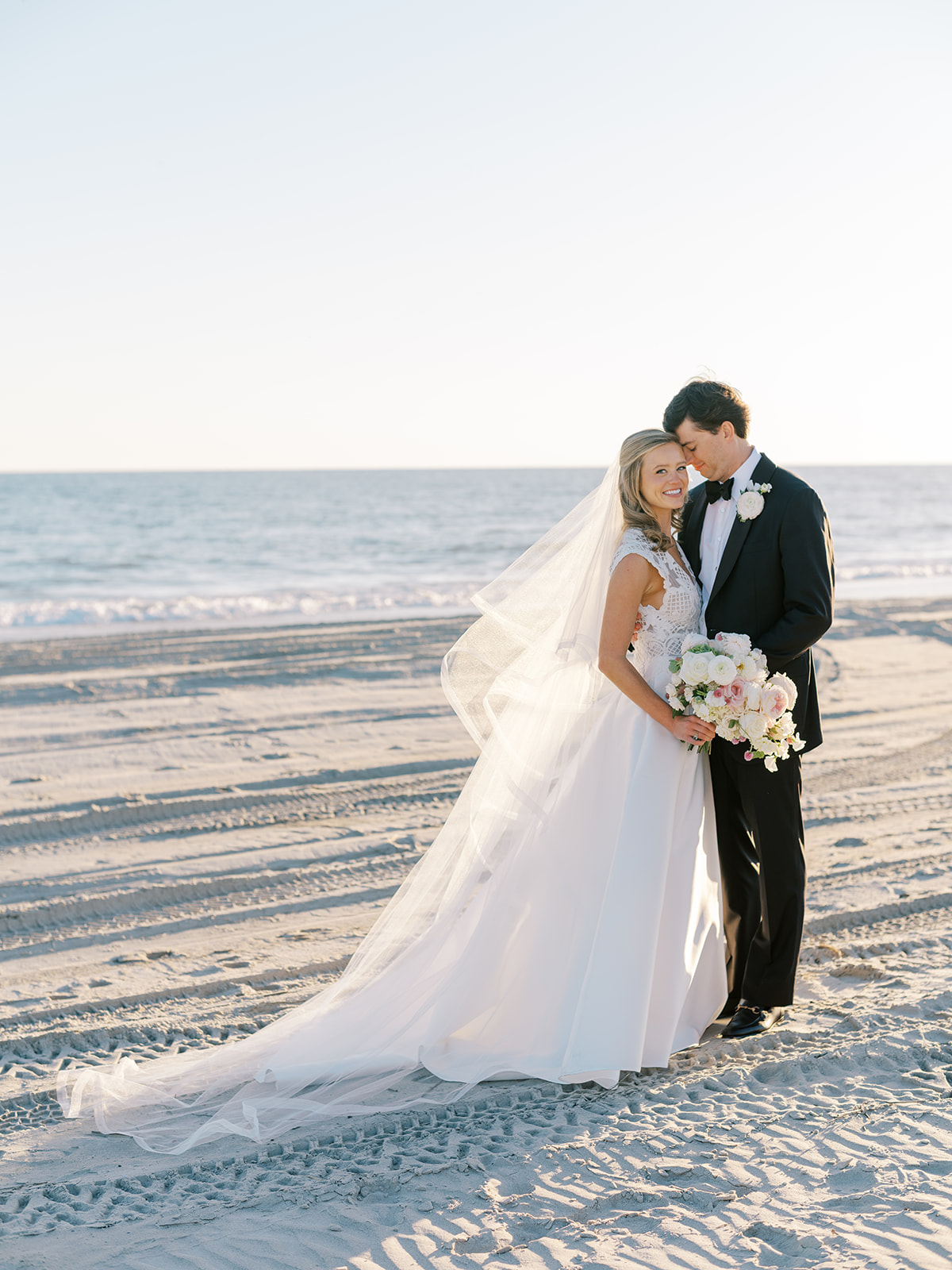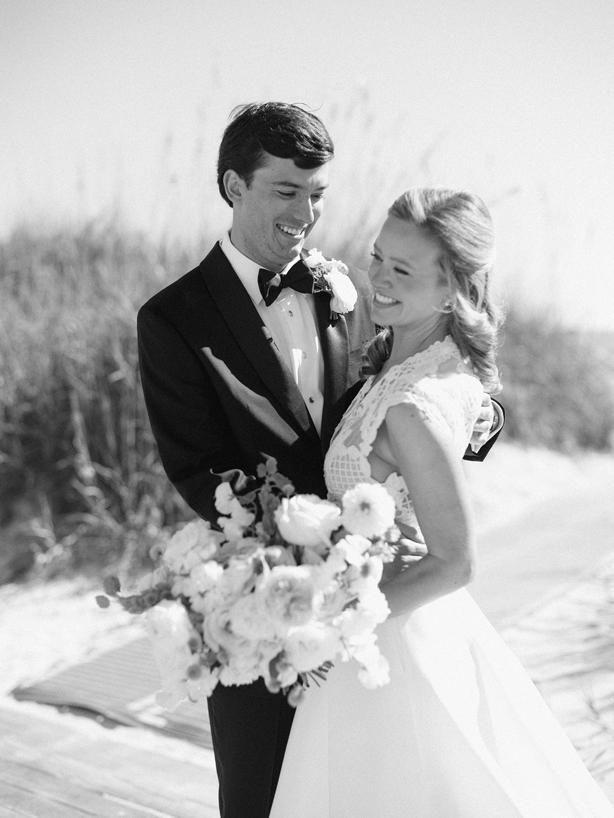 I can’t get over the radiance of these two and their unparalleled joy, their unabashed love for one another, and the excitement and celebration that exuded from every single moment of this magical day. It was spectacular in every way. And sneaking away to the sand for a few minutes of dreamy golden hour photos was just icing on the cake as these two got to bask in their new marriage and the anticipation of all the fun continuing to unfold at their wedding. Simply stunning in every single way! Shields’s gown! Her veil! That bouquet! The light! Their love & joy!