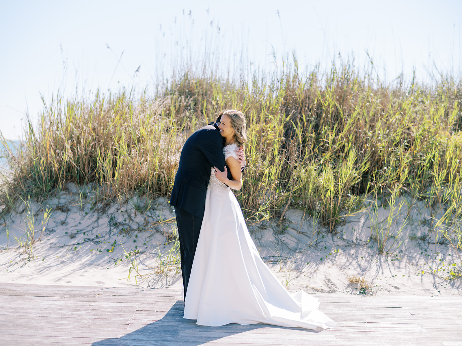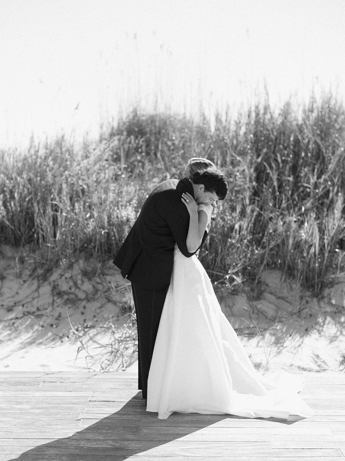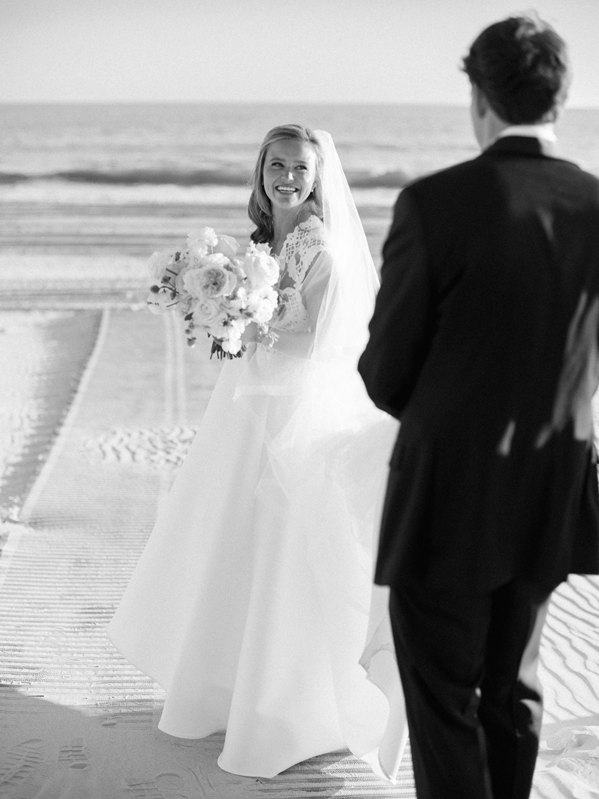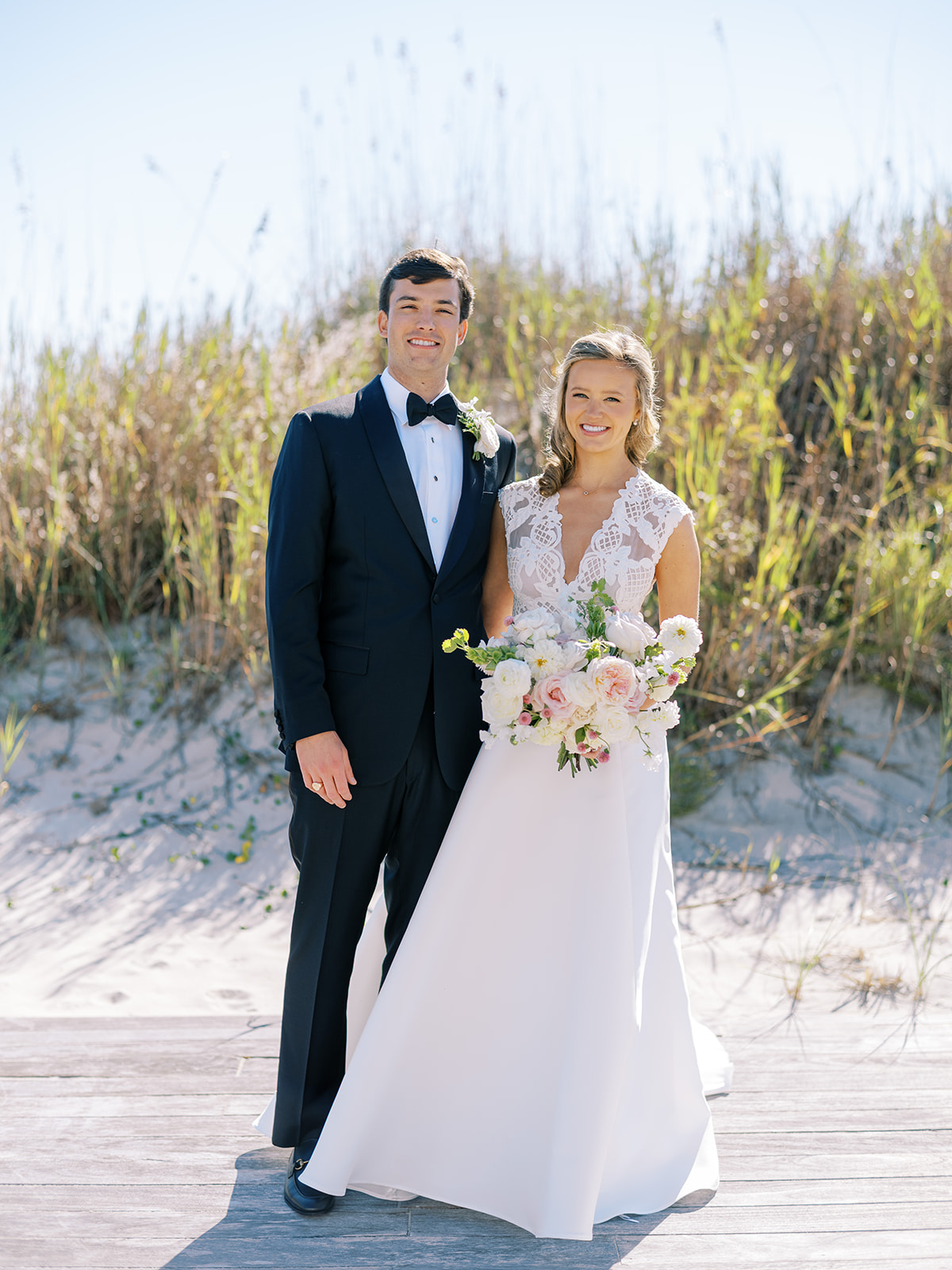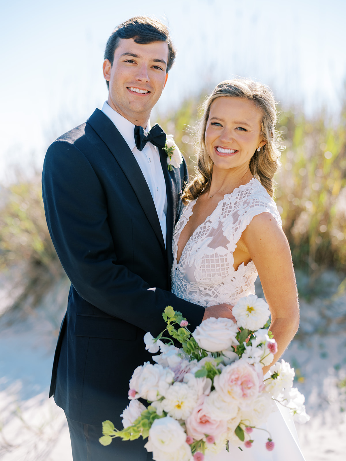 I can’t get over the radiance of these two and their unparalleled joy, their unabashed love for one another, and the excitement and celebration that exuded from every single moment of this magical day. It was spectacular in every way. And sneaking away to the sand for a few minutes of dreamy golden hour photos was just icing on the cake as these two got to bask in their new marriage and the anticipation of all the fun continuing to unfold at their wedding. Simply stunning in every single way! Shields’s gown! Her veil! That bouquet! The light! Their love & joy!