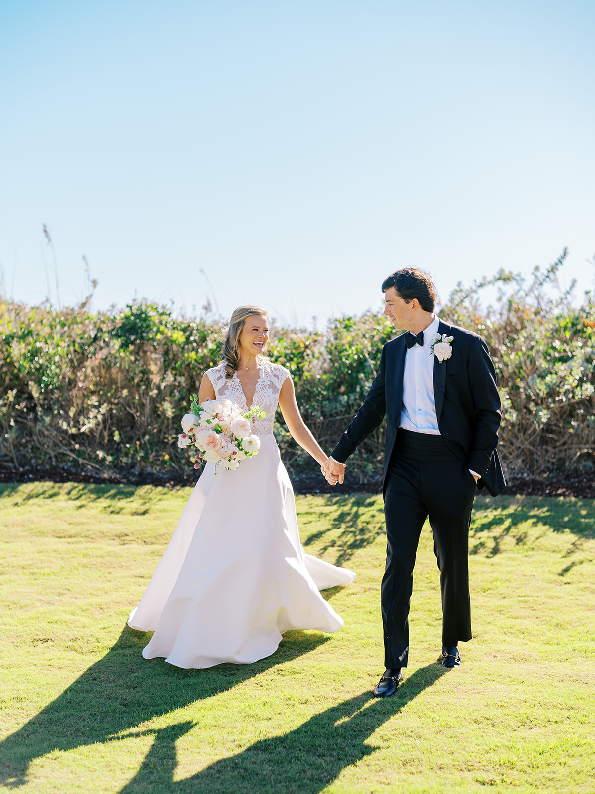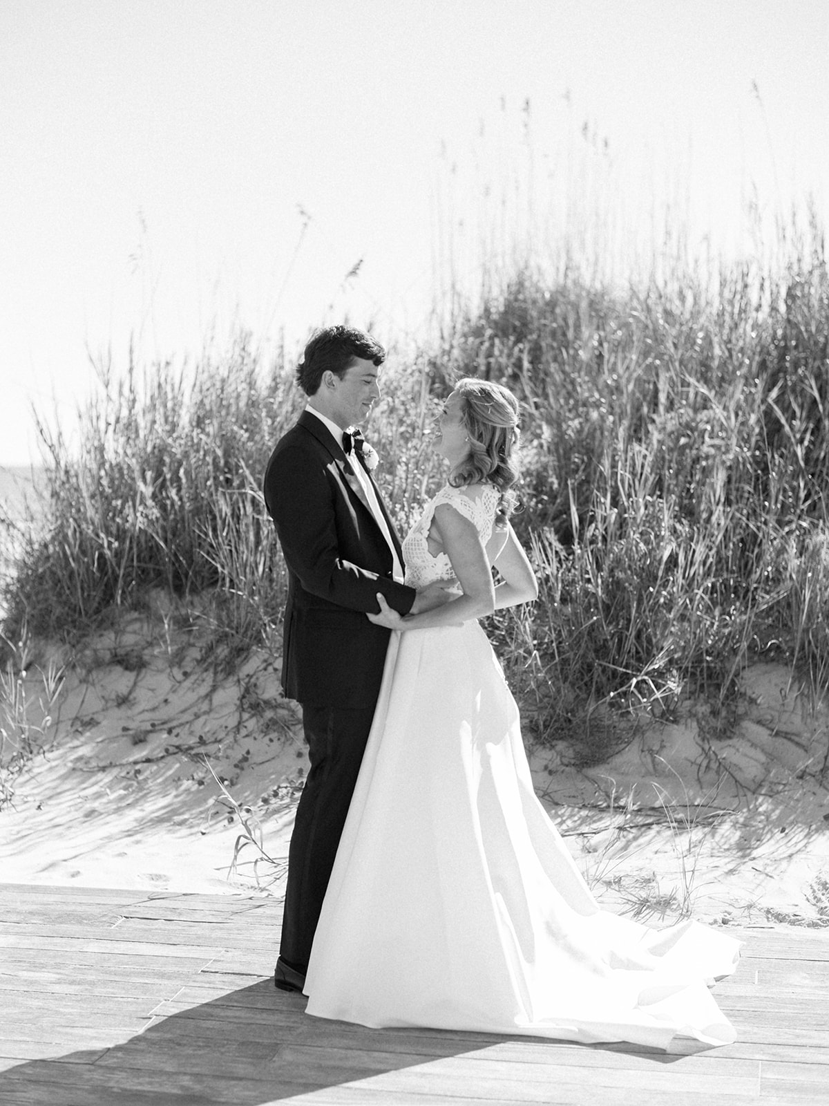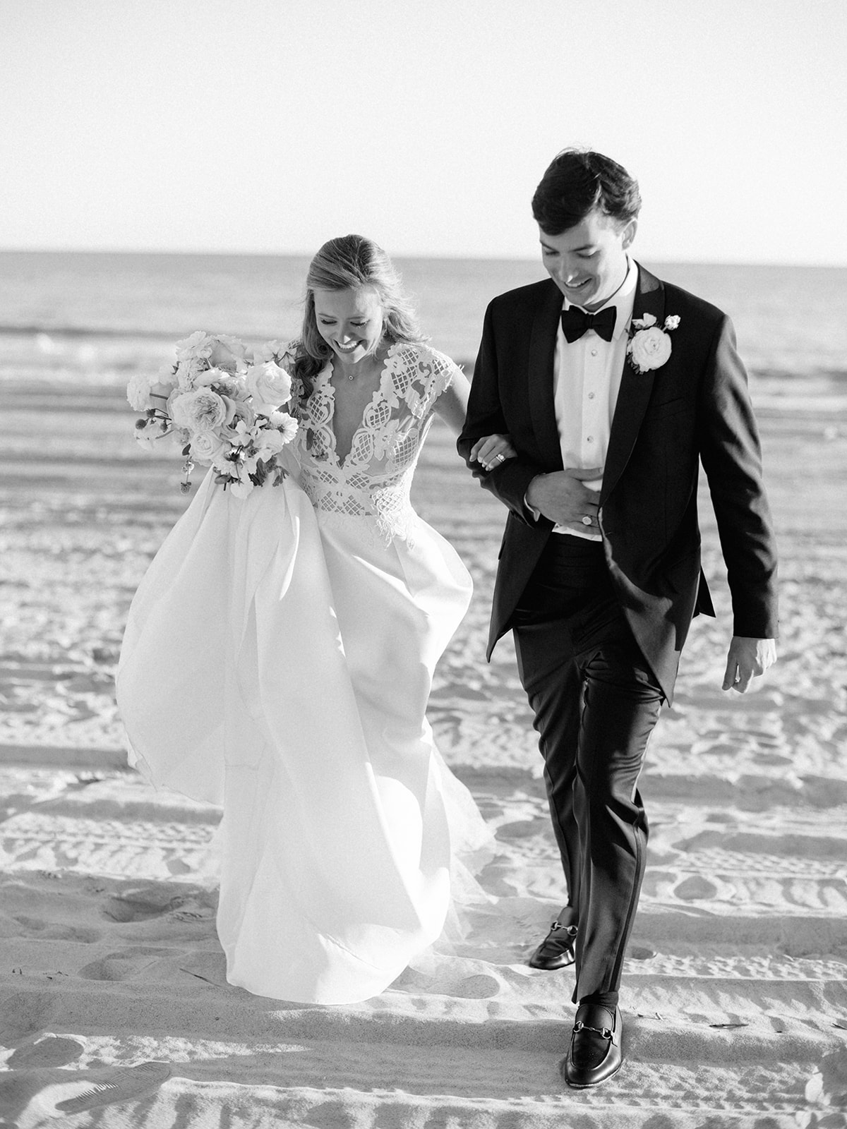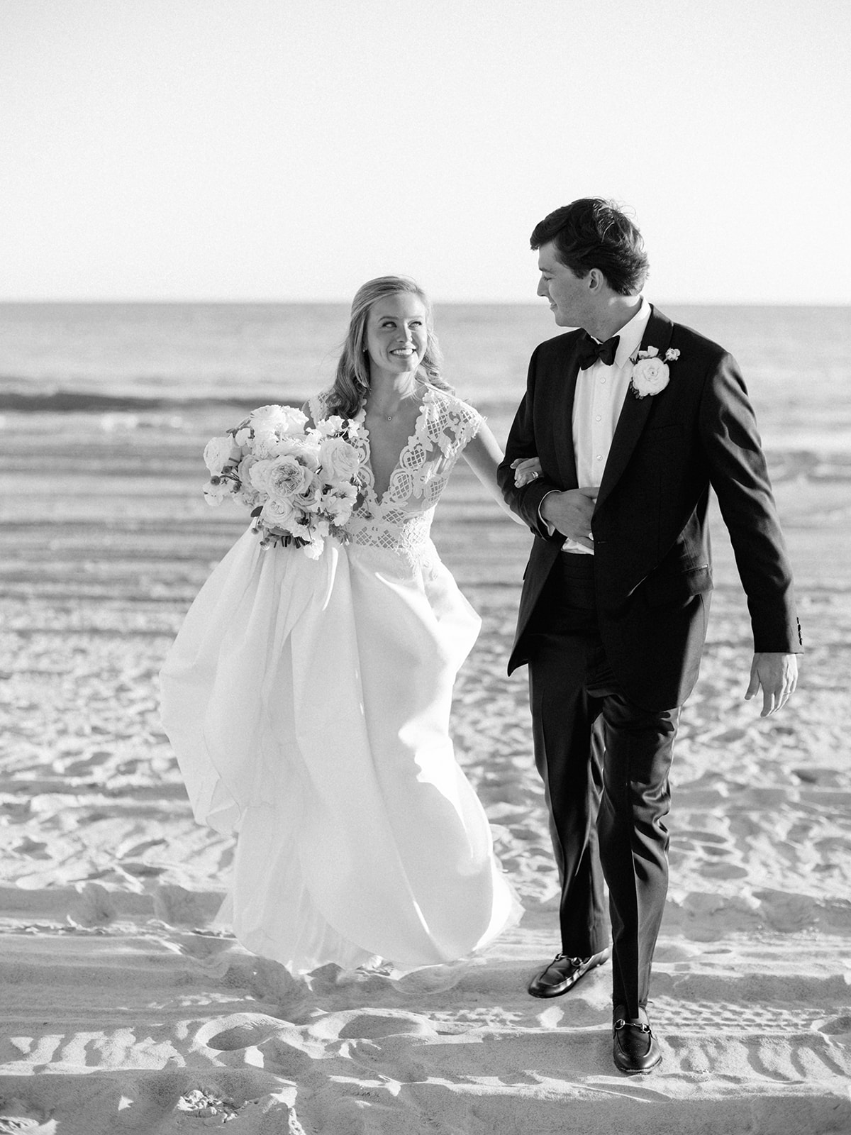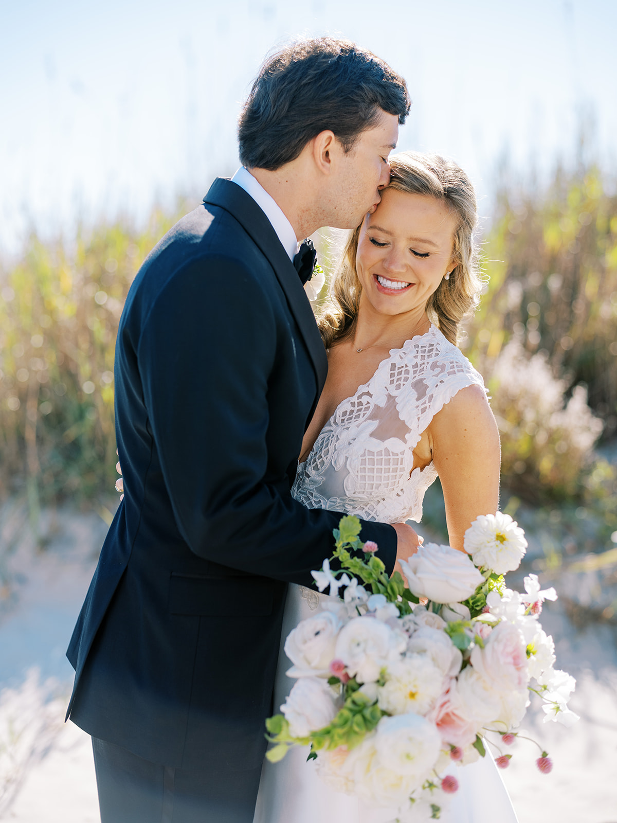 I can’t get over the radiance of these two and their unparalleled joy, their unabashed love for one another, and the excitement and celebration that exuded from every single moment of this magical day. It was spectacular in every way. And sneaking away to the sand for a few minutes of dreamy golden hour photos was just icing on the cake as these two got to bask in their new marriage and the anticipation of all the fun continuing to unfold at their wedding. Simply stunning in every single way! Shields’s gown! Her veil! That bouquet! The light! Their love & joy!