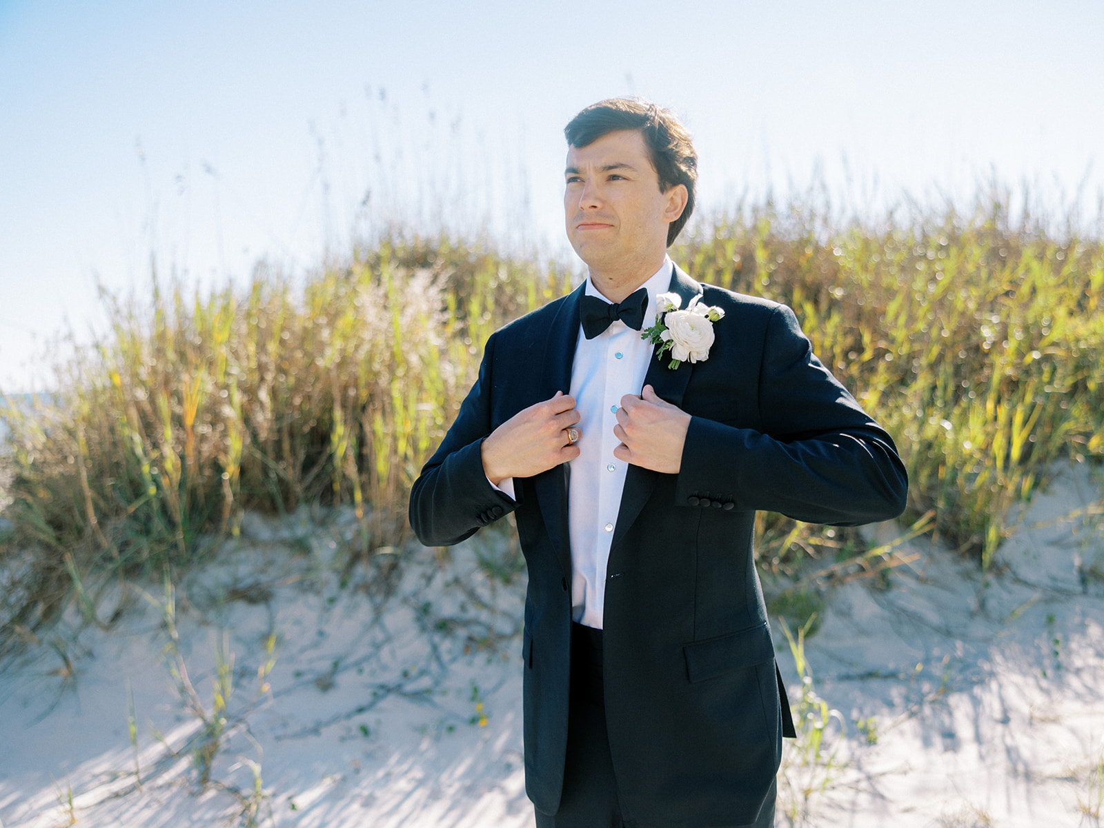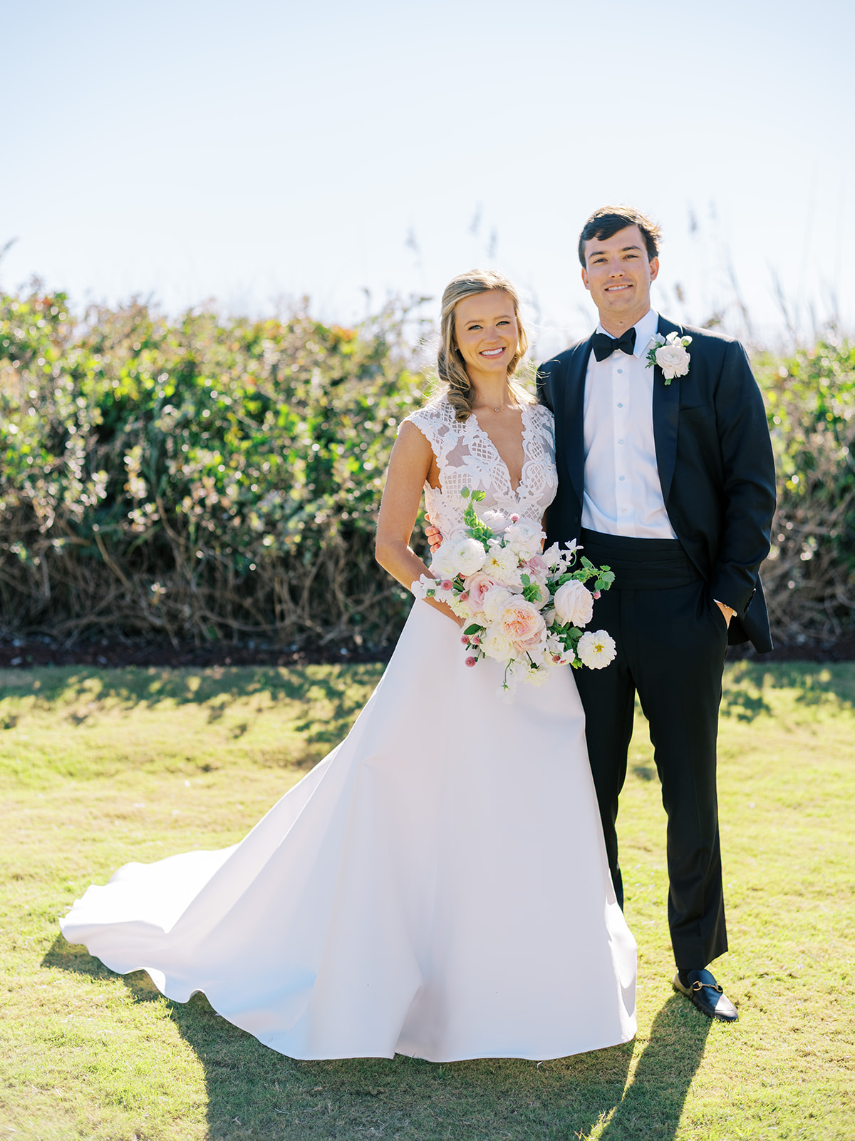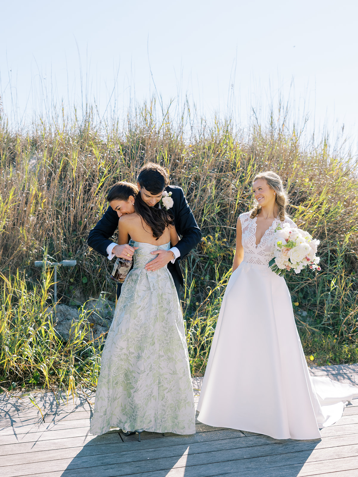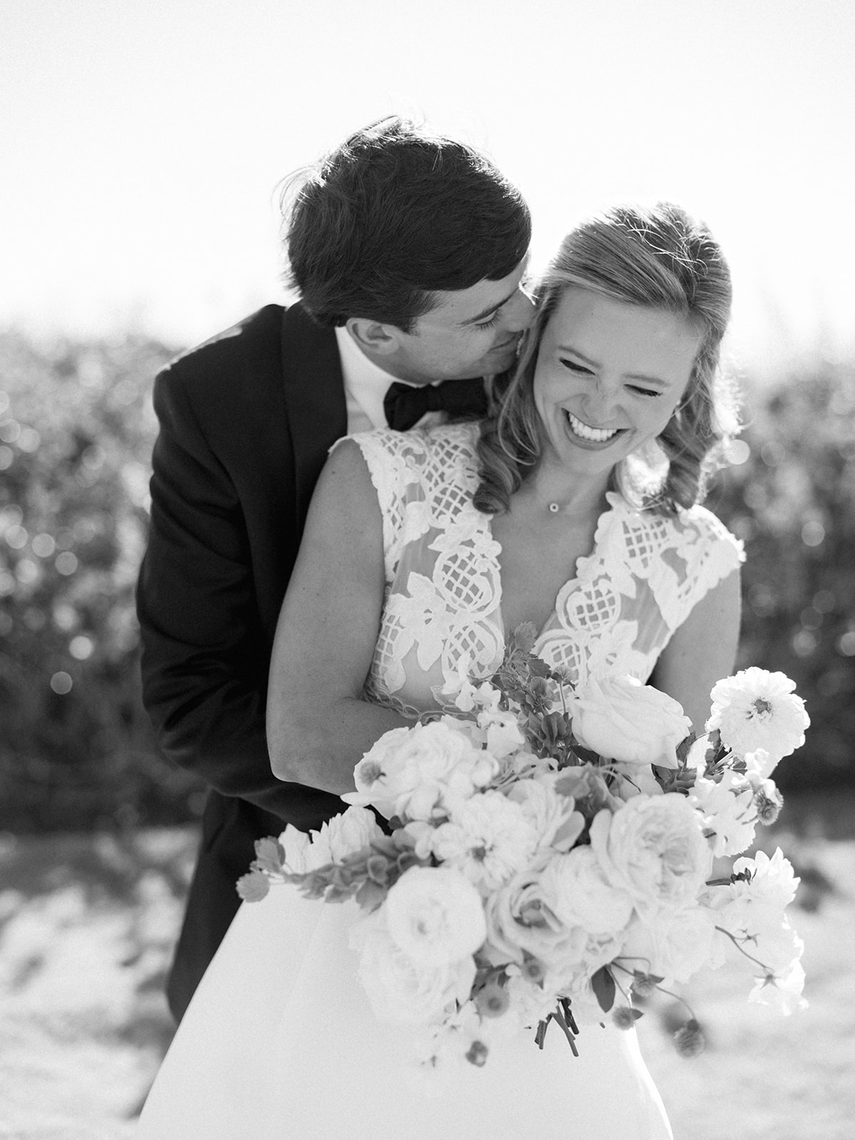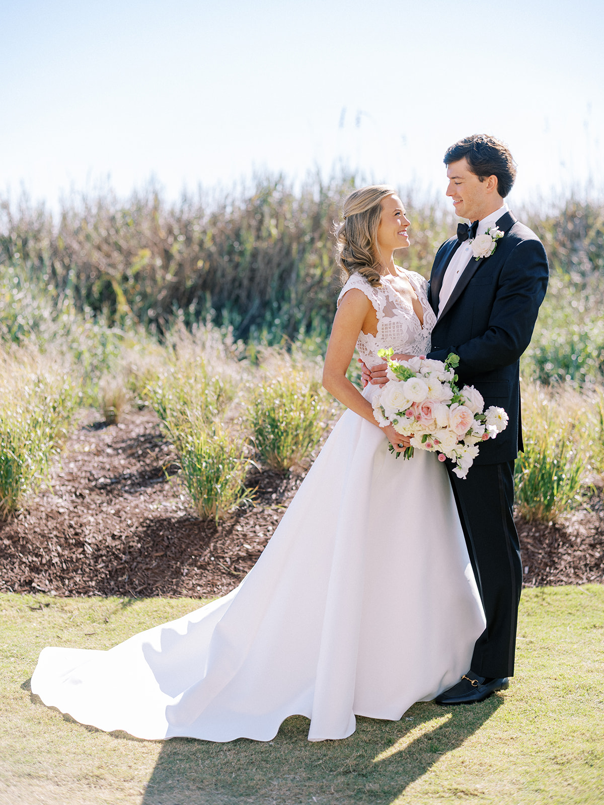 I can’t get over the radiance of these two and their unparalleled joy, their unabashed love for one another, and the excitement and celebration that exuded from every single moment of this magical day. It was spectacular in every way. And sneaking away to the sand for a few minutes of dreamy golden hour photos was just icing on the cake as these two got to bask in their new marriage and the anticipation of all the fun continuing to unfold at their wedding. Simply stunning in every single way! Shields’s gown! Her veil! That bouquet! The light! Their love & joy!