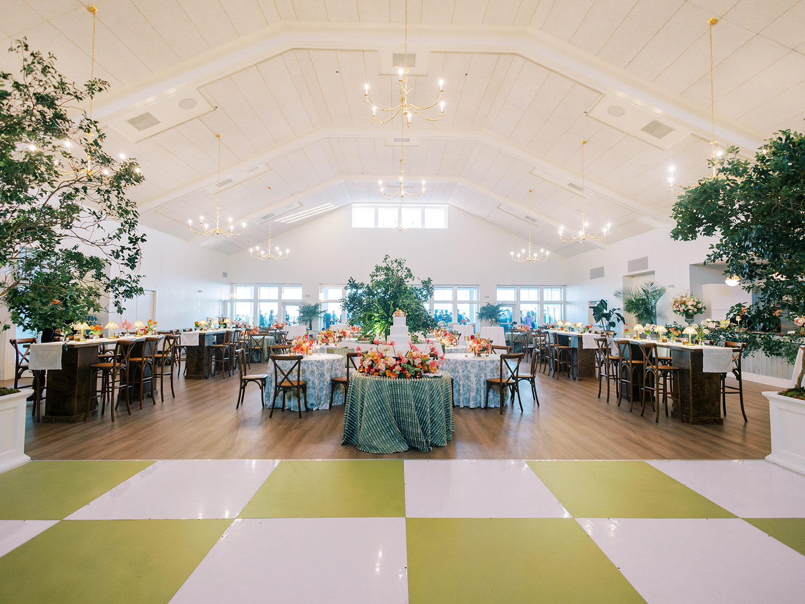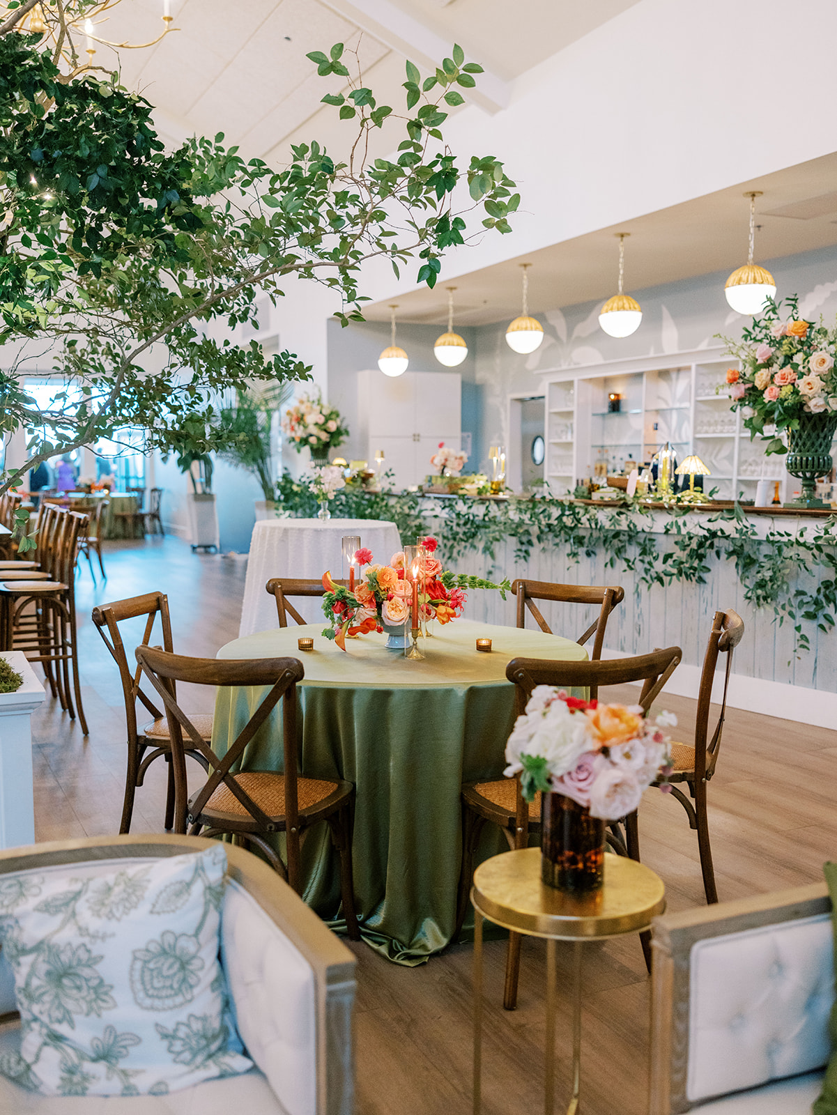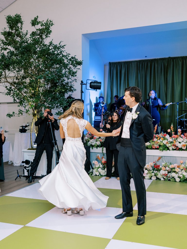 We enlisted Hathaway Floral Design to really fill the space, height-wise, with four towering trees on each corner of the statement olive green and white checkered dance floor, along with two magnificent, lush urns of greenery inside the center of two groupings of banquette seating. Beaufort Event Rentals brought so much to life for us perfectly, and we even had them create several custom pieces specifically for this wedding. All of these teams were utterly phenomenal, as the reception design was fairly complex, intricate, and bespoke. We framed the Coral Bay Club’s built-in stage with custom olive green dupioni draping (which perfectly matched the custom pillows), had a custom green and white checkered dance floor, brought in several lounges to flank the dance floor and outside lawn, had custom dark wood bar tables built for high top seating, had banquette seating created to maximize both comfort, style, and function, had ample tables throughout in a variety of sizes, brought in four gorgeous and complementary linens, had four stations (with the most delicious menu ever!) scattered purposefully all around the ballroom, utilized the Coral Bay Club’s new built-in twenty foot bar and adorned it with organic greenery, tortoiseshell vases, lush towering urns, and all the bar accoutrements like framed signage, cocktail napkins, matchboxes, koozies, and drink stirrers. There were striking layered vignettes and personalized details aplenty!