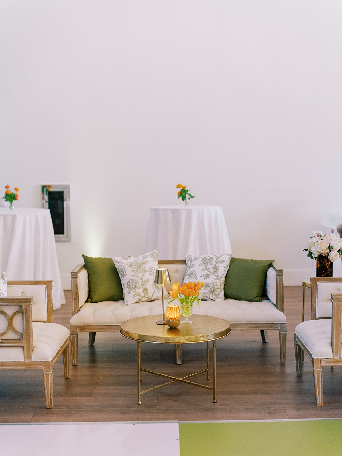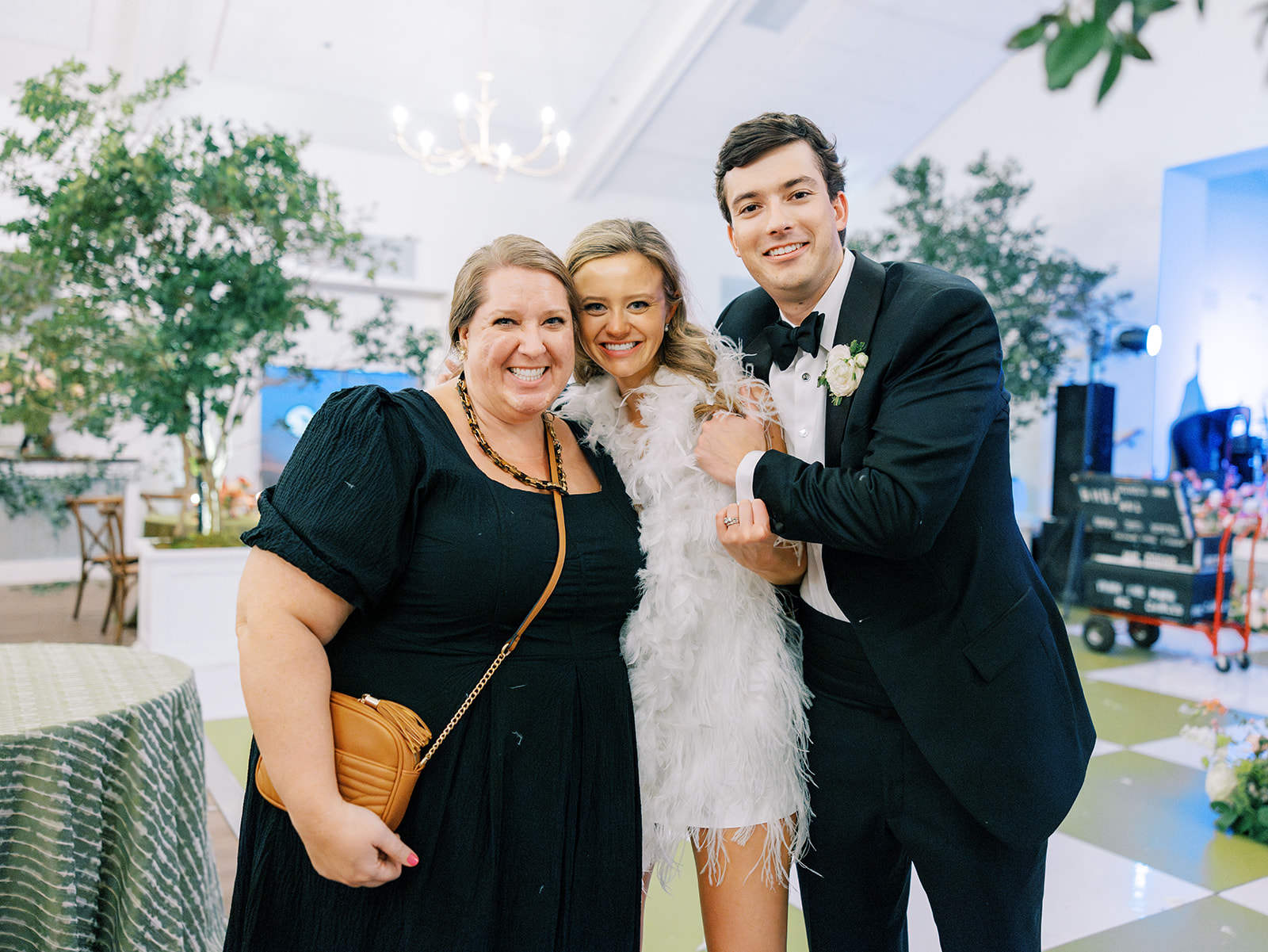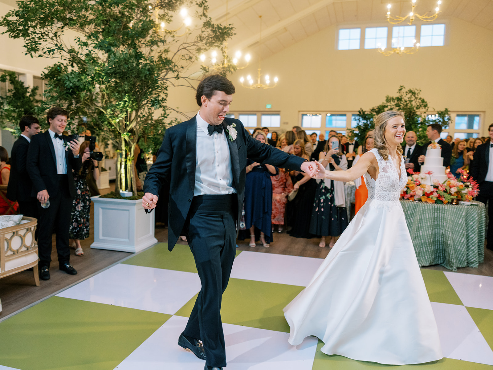 We enlisted Hathaway Floral Design to really fill the space, height-wise, with four towering trees on each corner of the statement olive green and white checkered dance floor, along with two magnificent, lush urns of greenery inside the center of two groupings of banquette seating. Beaufort Event Rentals brought so much to life for us perfectly, and we even had them create several custom pieces specifically for this wedding. All of these teams were utterly phenomenal, as the reception design was fairly complex, intricate, and bespoke. We framed the Coral Bay Club’s built-in stage with custom olive green dupioni draping (which perfectly matched the custom pillows), had a custom green and white checkered dance floor, brought in several lounges to flank the dance floor and outside lawn, had custom dark wood bar tables built for high top seating, had banquette seating created to maximize both comfort, style, and function, had ample tables throughout in a variety of sizes, brought in four gorgeous and complementary linens, had four stations (with the most delicious menu ever!) scattered purposefully all around the ballroom, utilized the Coral Bay Club’s new built-in twenty foot bar and adorned it with organic greenery, tortoiseshell vases, lush towering urns, and all the bar accoutrements like framed signage, cocktail napkins, matchboxes, koozies, and drink stirrers. There were striking layered vignettes and personalized details aplenty!