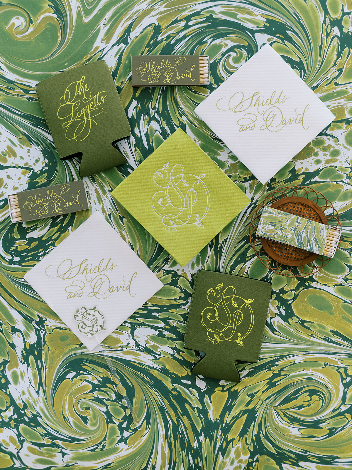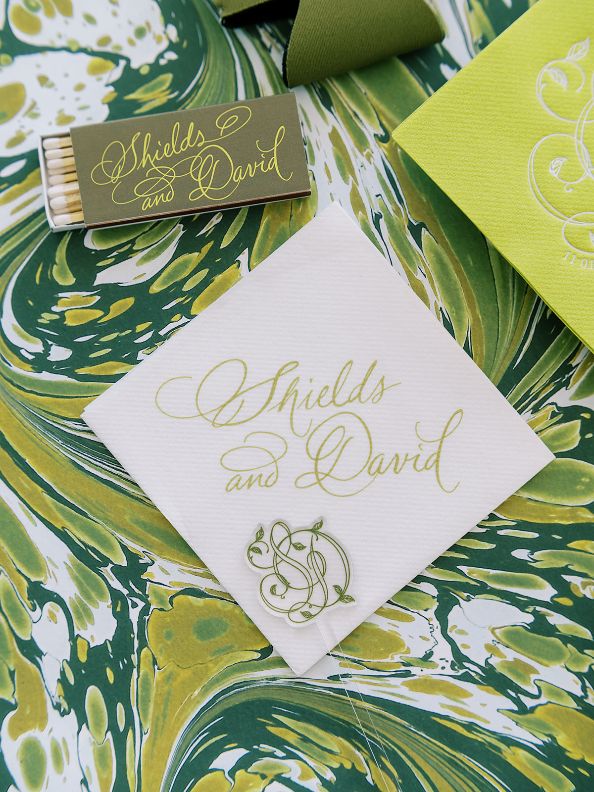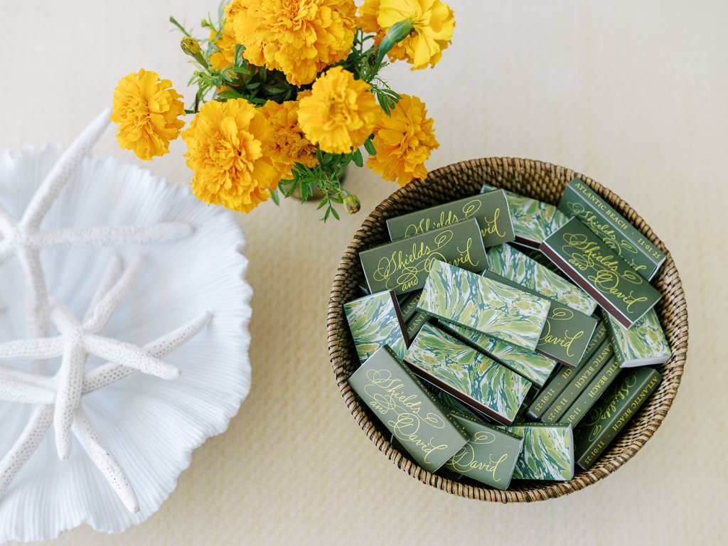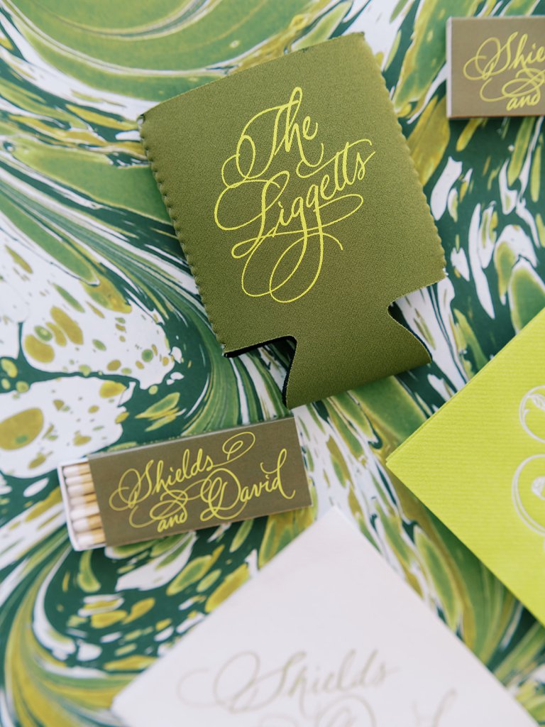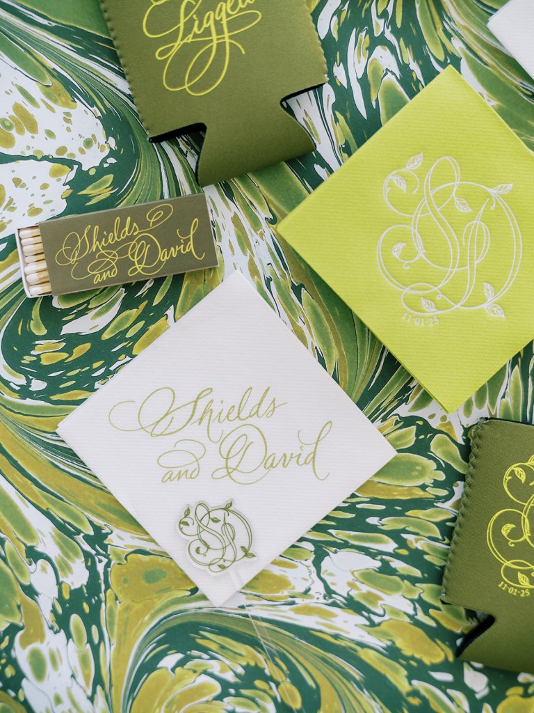 From the invitation suite to the bar menus to the matchboxes to the tambourines for the dance floor to to all of the design details, thoughtfully keeping things cohesive, seamless, unique, and memorable is a top priority! We adored Shields and David’s bold, green marbled envelope liner on their invitation suite (that marbling truly was unexpected yet elegant perfection!), and I intentionally wove this same pattern into other elements of their wedding day, like their matchboxes, their styling backgrounds, the dance floor tambourines, the bridesmaid gifts, & more! I’m not sure too many guests noticed (I hope they did!) but those of us who designed Shields and David’s wedding details and brought it all to life certainly did!