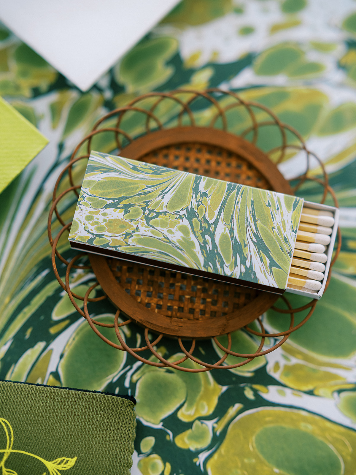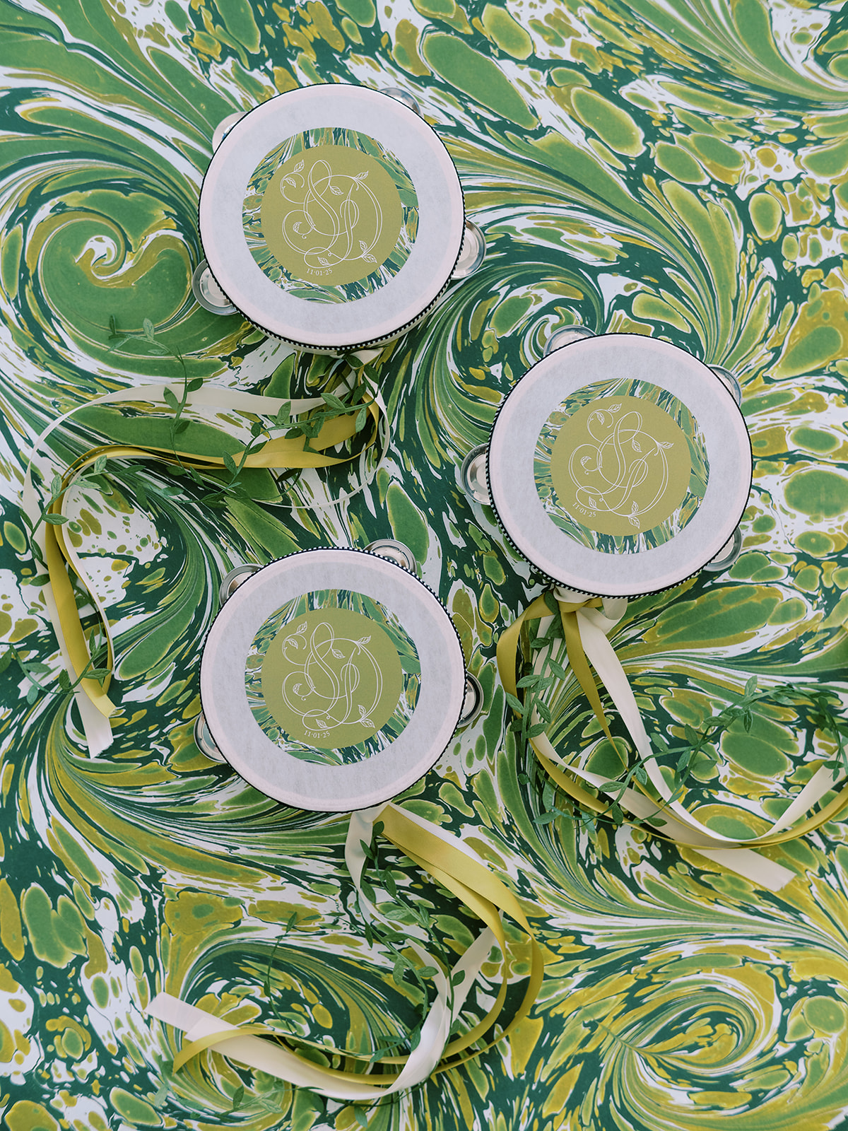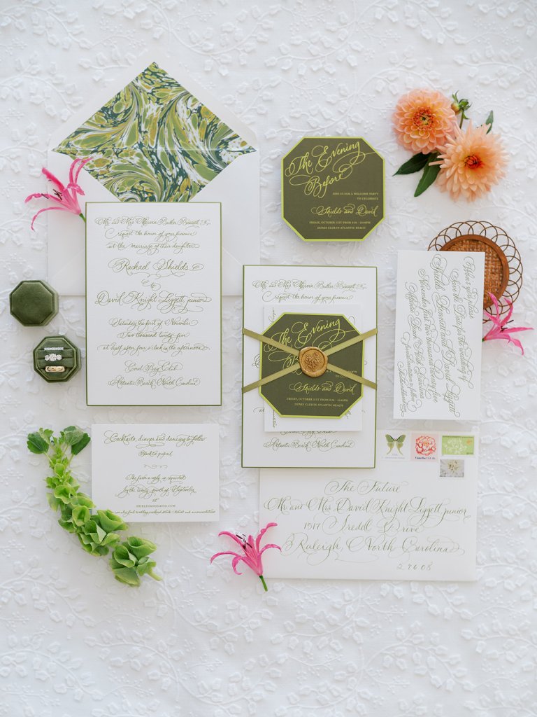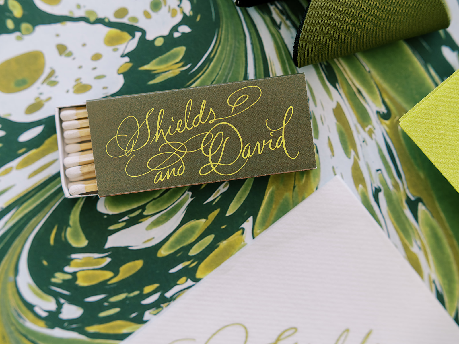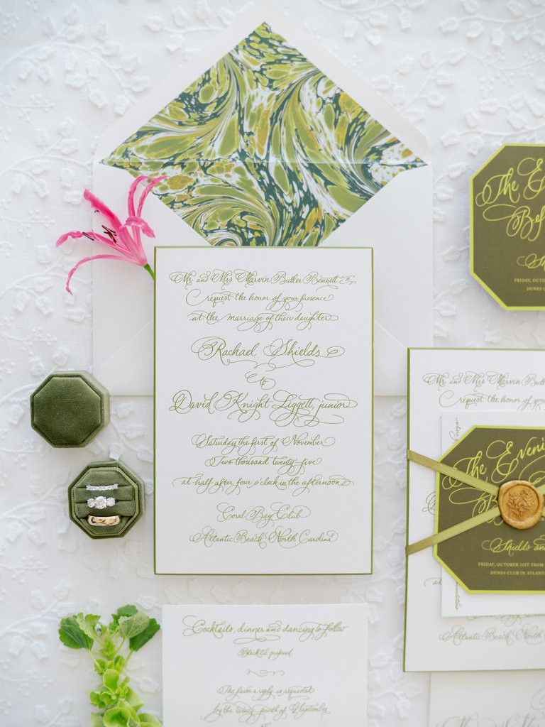 From the invitation suite to the bar menus to the matchboxes to the tambourines for the dance floor to to all of the design details, thoughtfully keeping things cohesive, seamless, unique, and memorable is a top priority! We adored Shields and David’s bold, green marbled envelope liner on their invitation suite (that marbling truly was unexpected yet elegant perfection!), and I intentionally wove this same pattern into other elements of their wedding day, like their matchboxes, their styling backgrounds, the dance floor tambourines, the bridesmaid gifts, & more! I’m not sure too many guests noticed (I hope they did!) but those of us who designed Shields and David’s wedding details and brought it all to life certainly did!