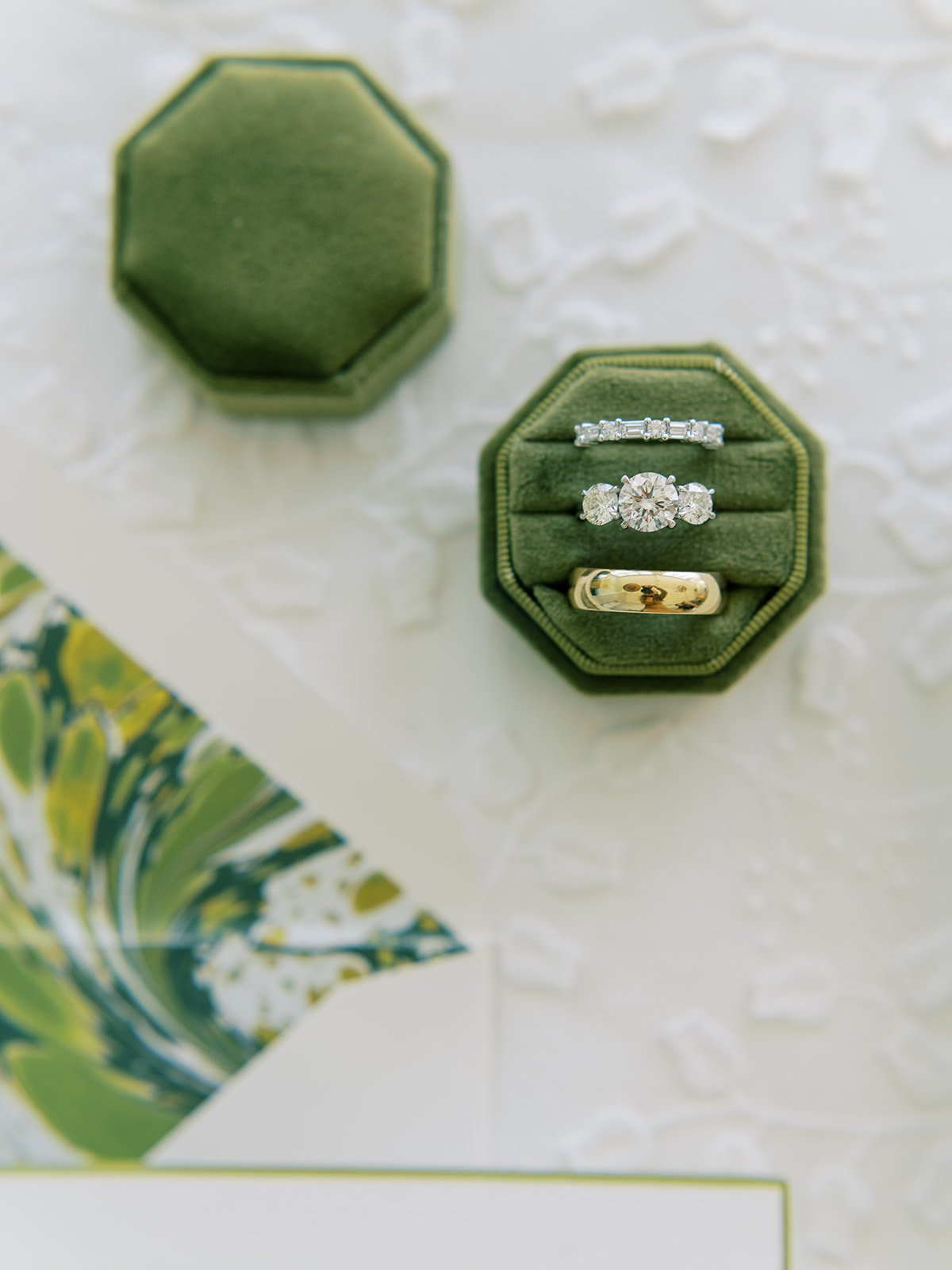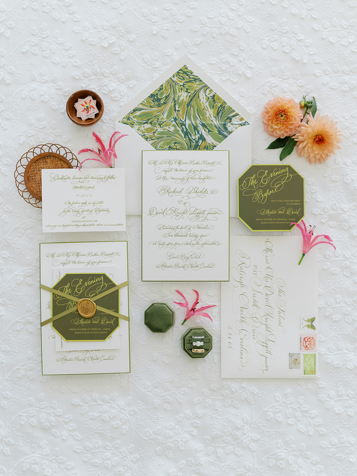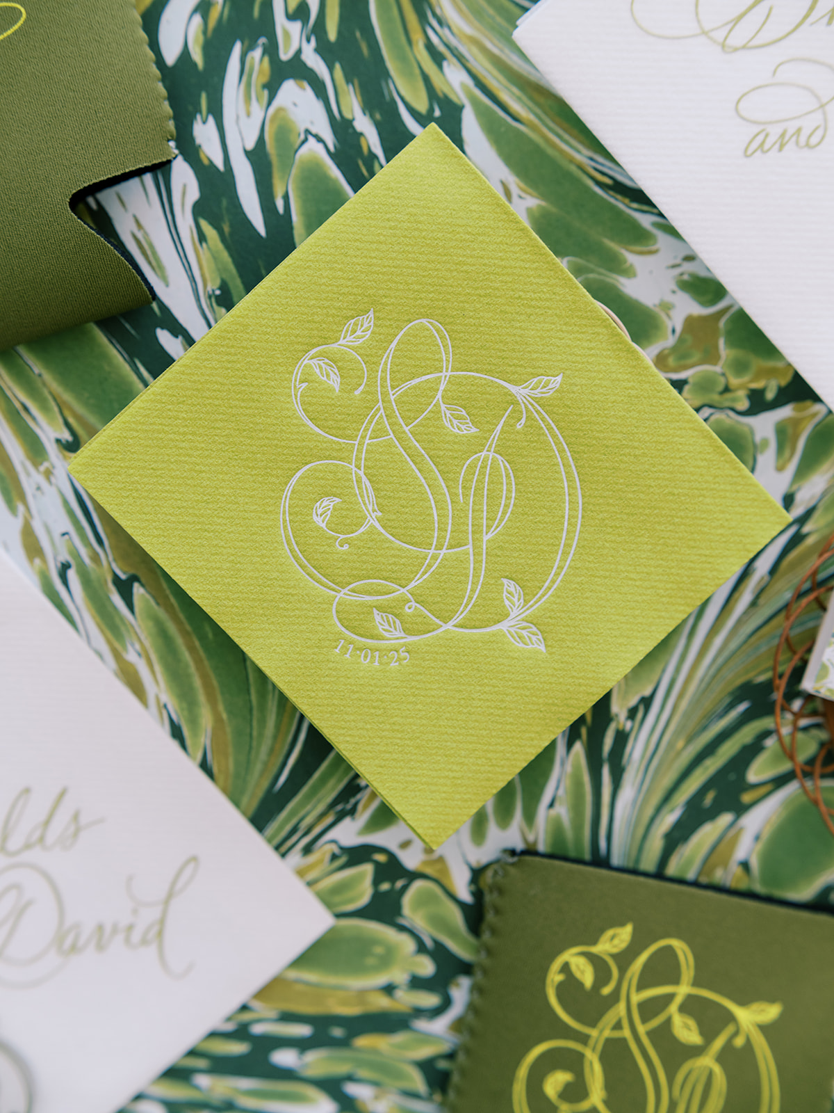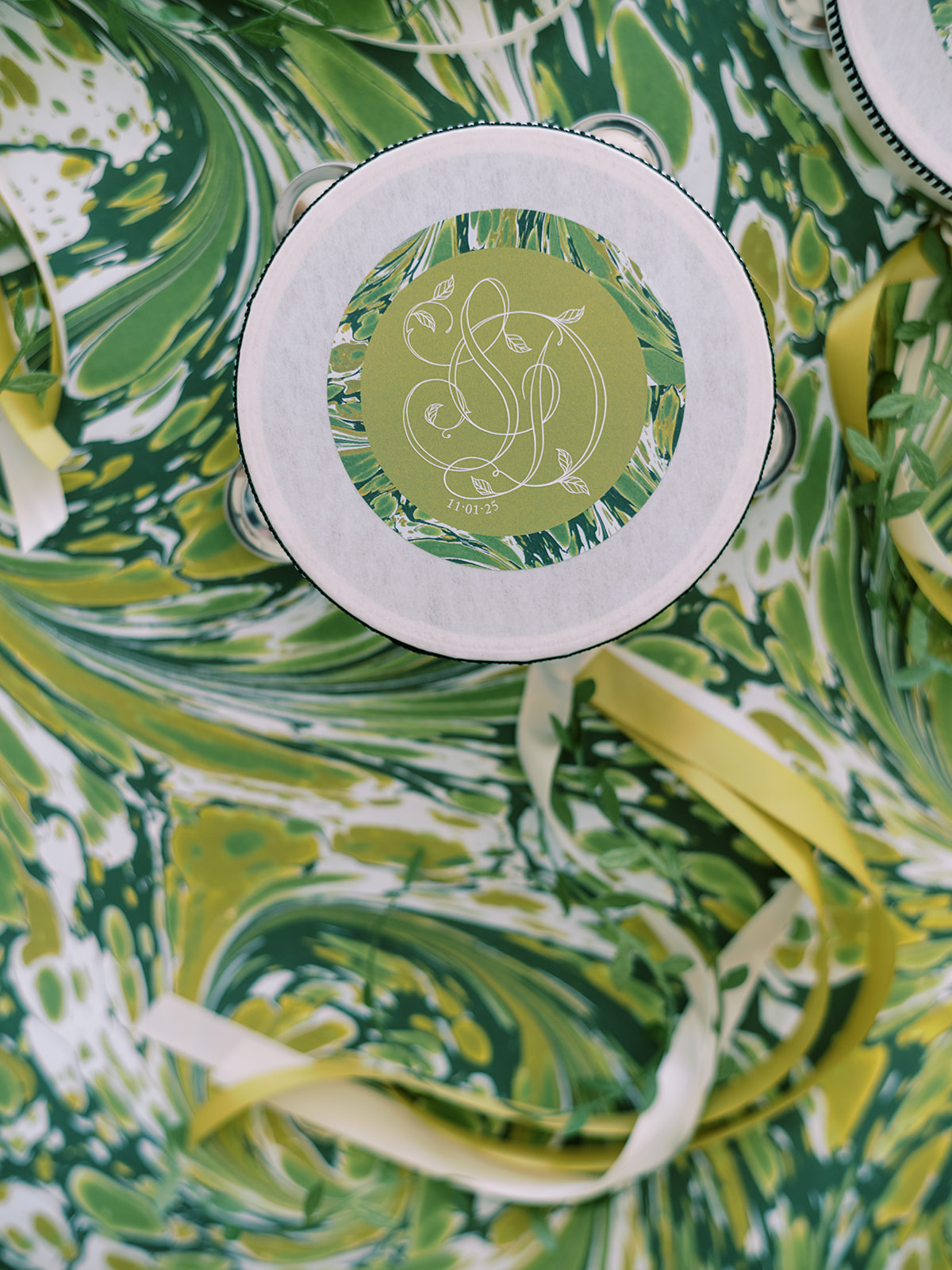 From the invitation suite to the bar menus to the matchboxes to the tambourines for the dance floor to to all of the design details, thoughtfully keeping things cohesive, seamless, unique, and memorable is a top priority! We adored Shields and David’s bold, green marbled envelope liner on their invitation suite (that marbling truly was unexpected yet elegant perfection!), and I intentionally wove this same pattern into other elements of their wedding day, like their matchboxes, their styling backgrounds, the dance floor tambourines, the bridesmaid gifts, & more! I’m not sure too many guests noticed (I hope they did!) but those of us who designed Shields and David’s wedding details and brought it all to life certainly did!