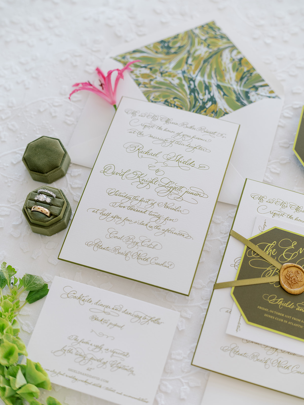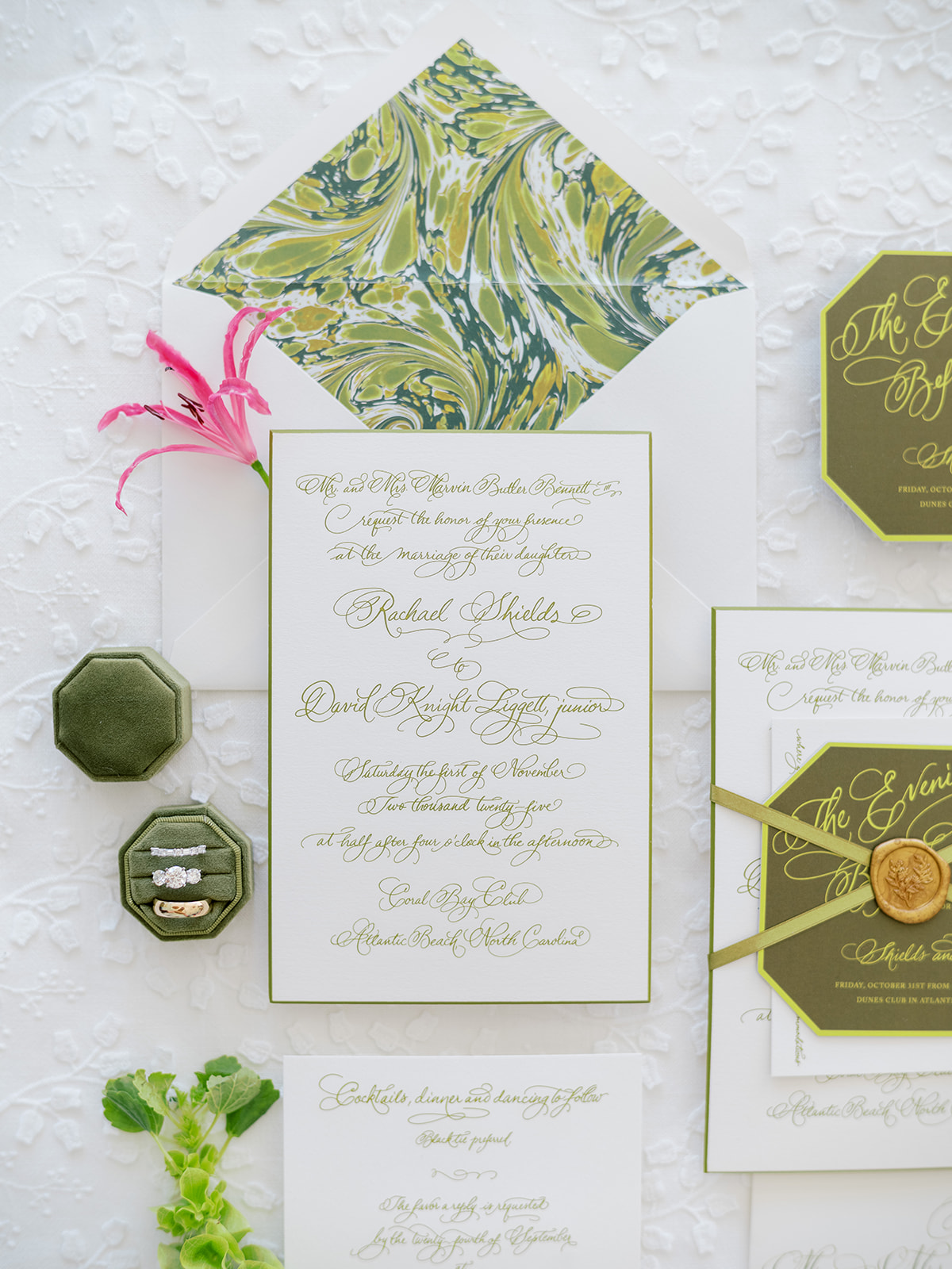 This was, unsurprisingly, one of my favorite wedding designs – and weddings! – of all time!! Oh my goodness. Wow to every single thing about this magical day!! I’d been dreaming and designing every aspect of Shields and David’s wedding for so long, and seeing it come to life took my breath away. Where to begin?! I started with a palette of vibrant chartreuse, verdant olive, & rich brown paired with striking pops of hot pink and orange for our color-loving, stylish bride, then tied in chic nods to the autumn season with rich textures, tortoiseshell, dark wood, and bold green marbling.