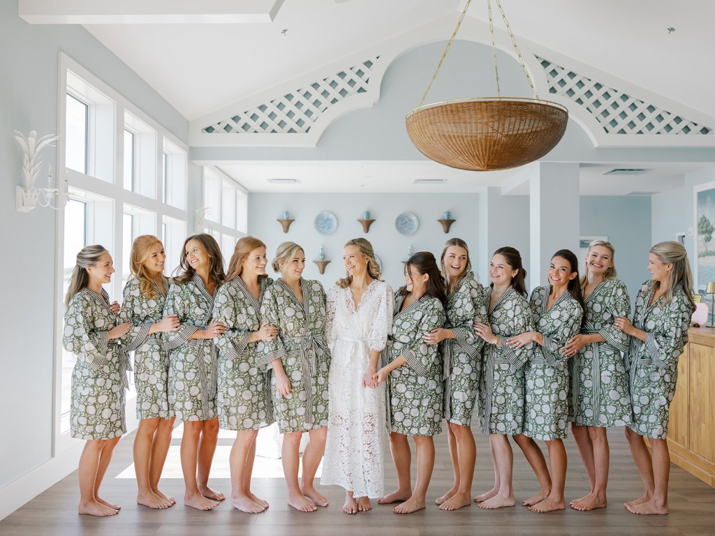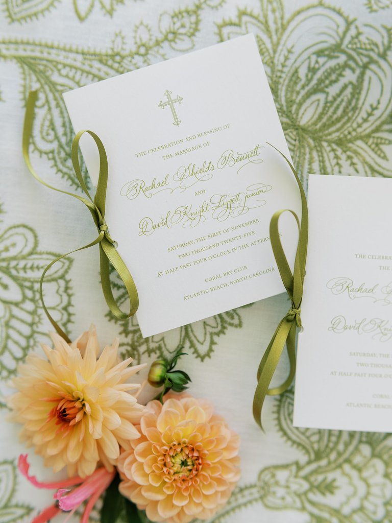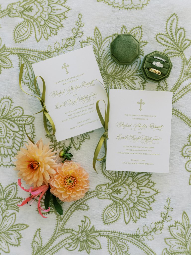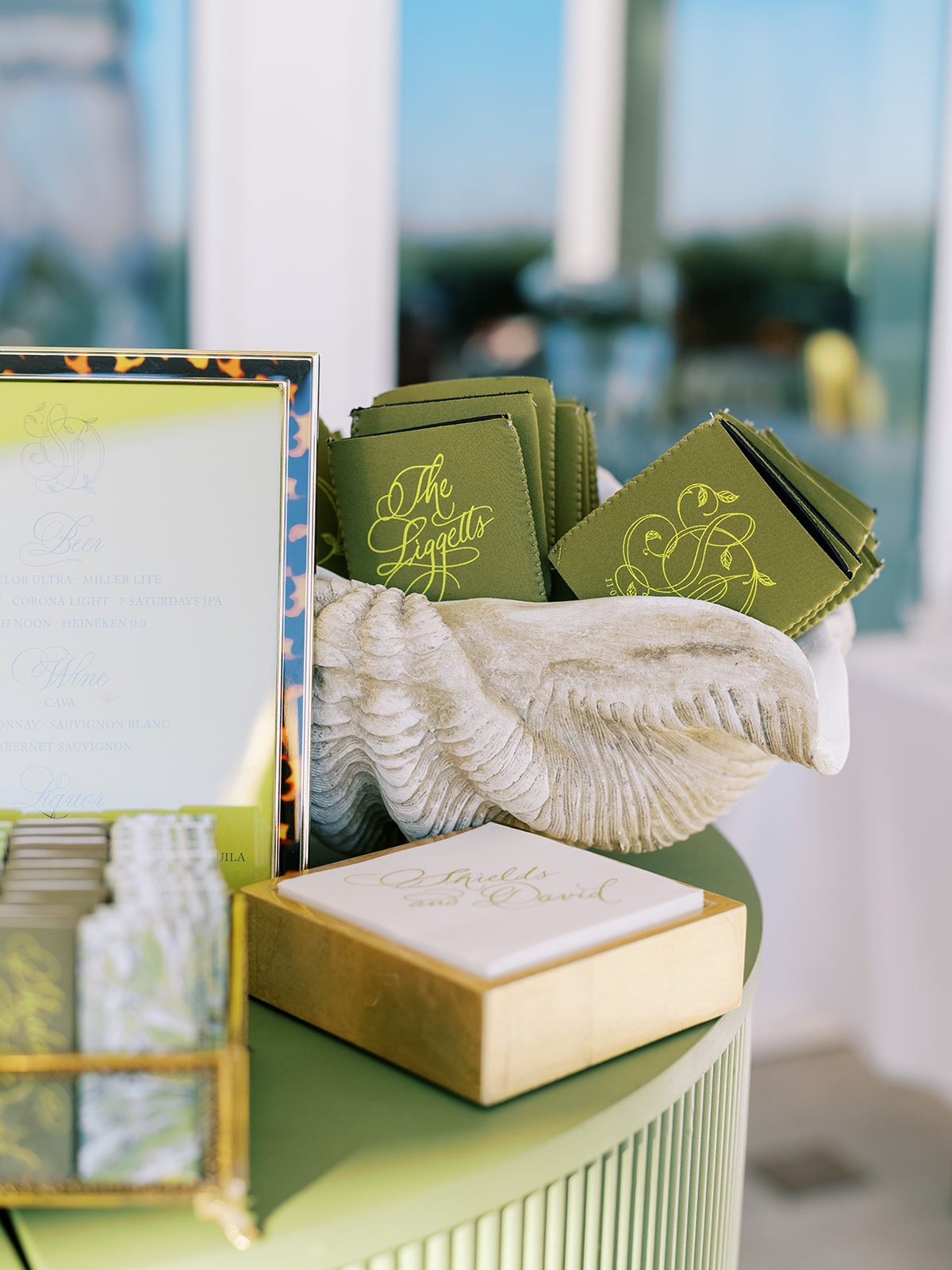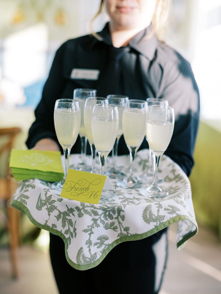 We also had Hathaway Floral Design create colorful floral arrangements in large white clam shells to carry the oceanfront setting through the day, along with vignettes highlighting coral and other subtle nods to the ocean, and their guest book featuring Faith Teasley’s Saltwater Collection book. Servers carried carried trays of Shields and David’s signature cocktails (Ranch Water and a French 76) and champagne with each tray covered in gorgeous green and white floral linen napkins with a scalloped edge and a custom name card denoting each cocktail. These little details really make a difference!