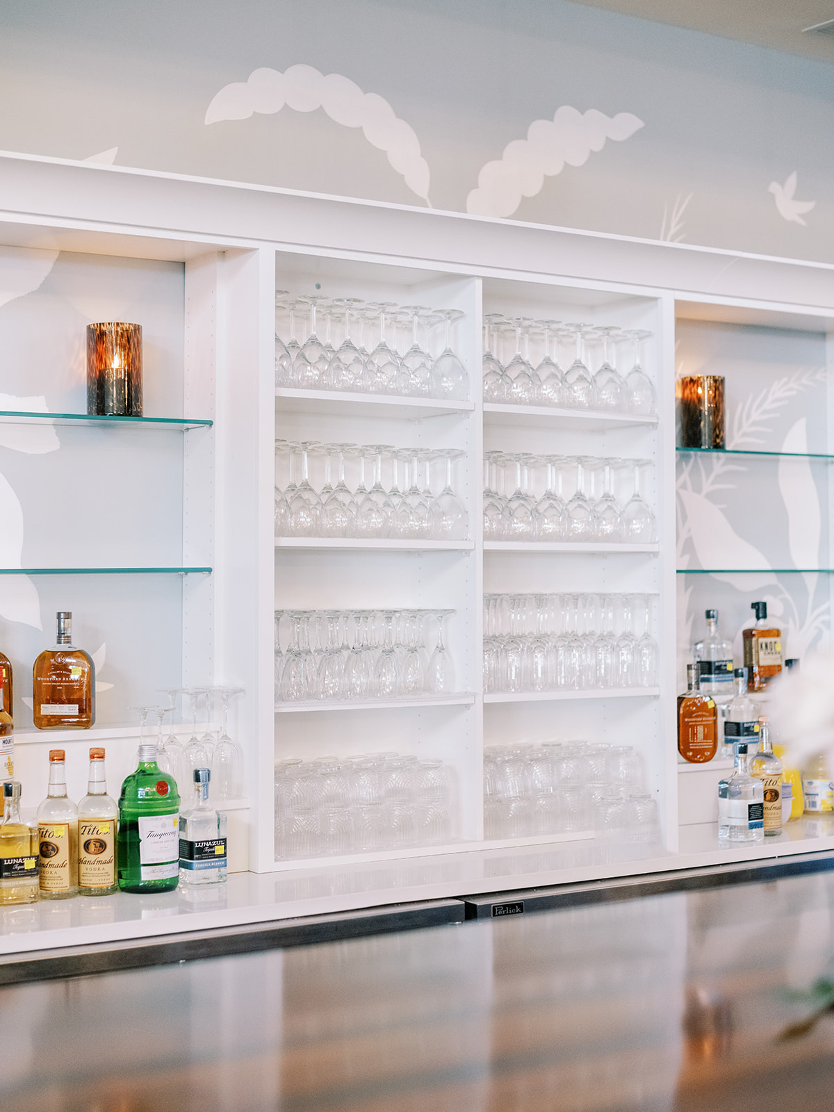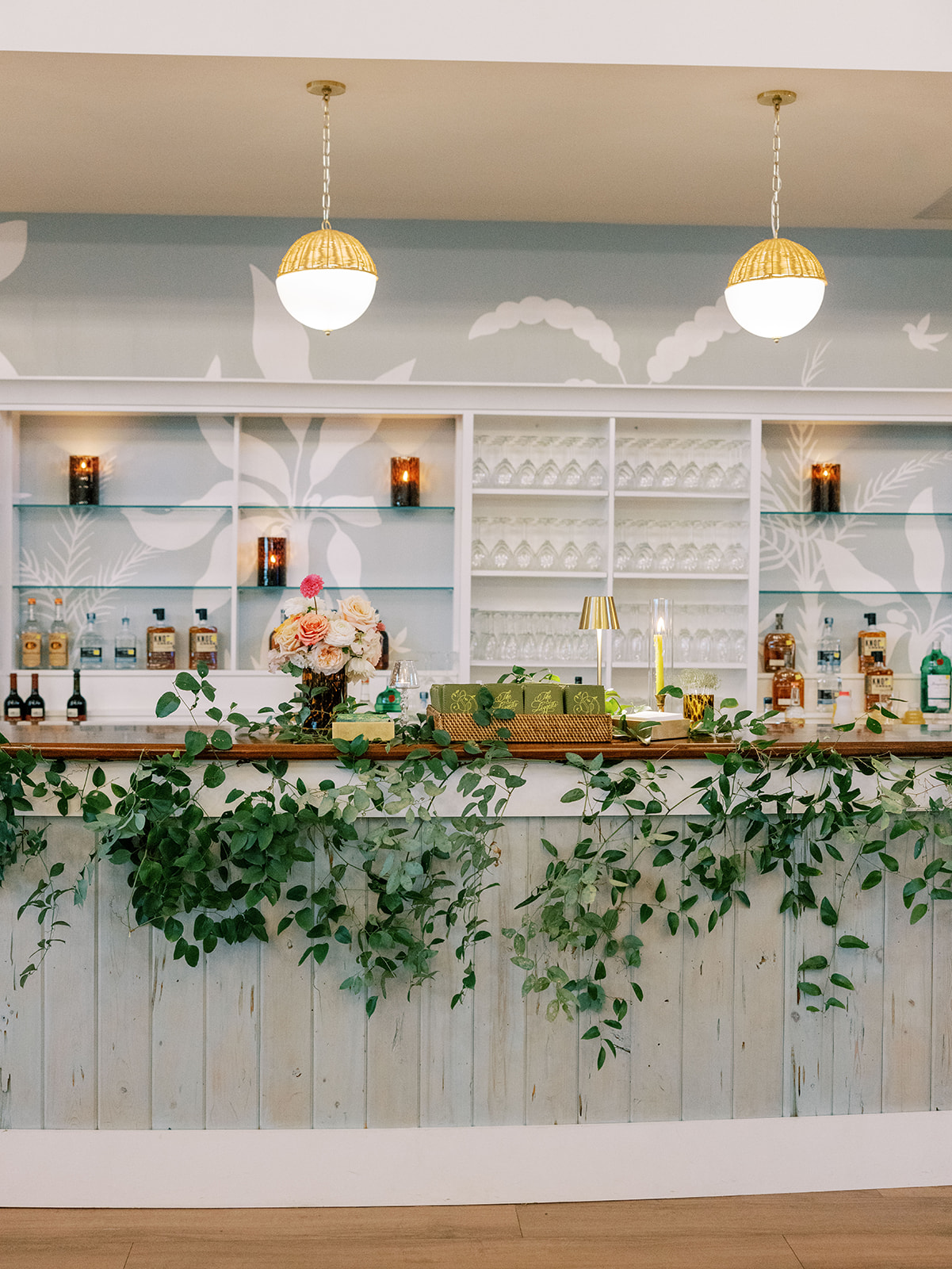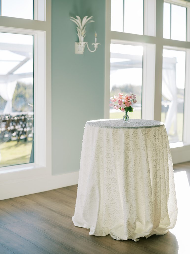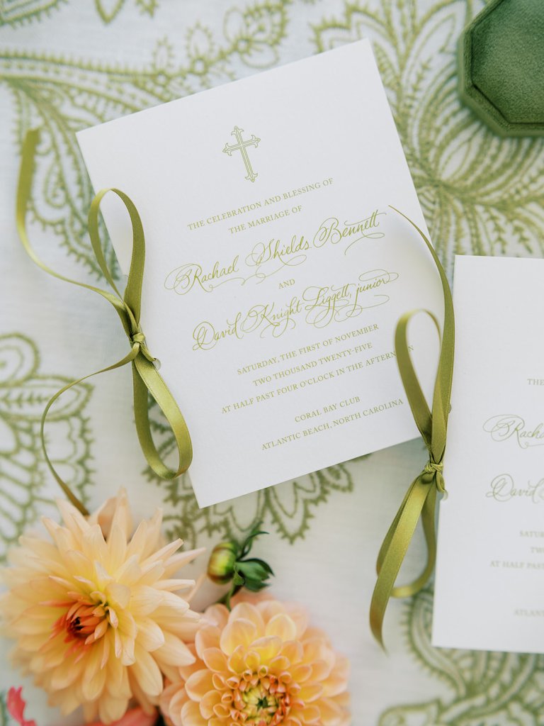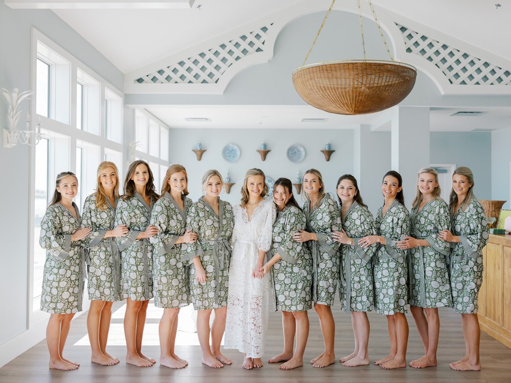 We also had Hathaway Floral Design create colorful floral arrangements in large white clam shells to carry the oceanfront setting through the day, along with vignettes highlighting coral and other subtle nods to the ocean, and their guest book featuring Faith Teasley’s Saltwater Collection book. Servers carried carried trays of Shields and David’s signature cocktails (Ranch Water and a French 76) and champagne with each tray covered in gorgeous green and white floral linen napkins with a scalloped edge and a custom name card denoting each cocktail. These little details really make a difference!