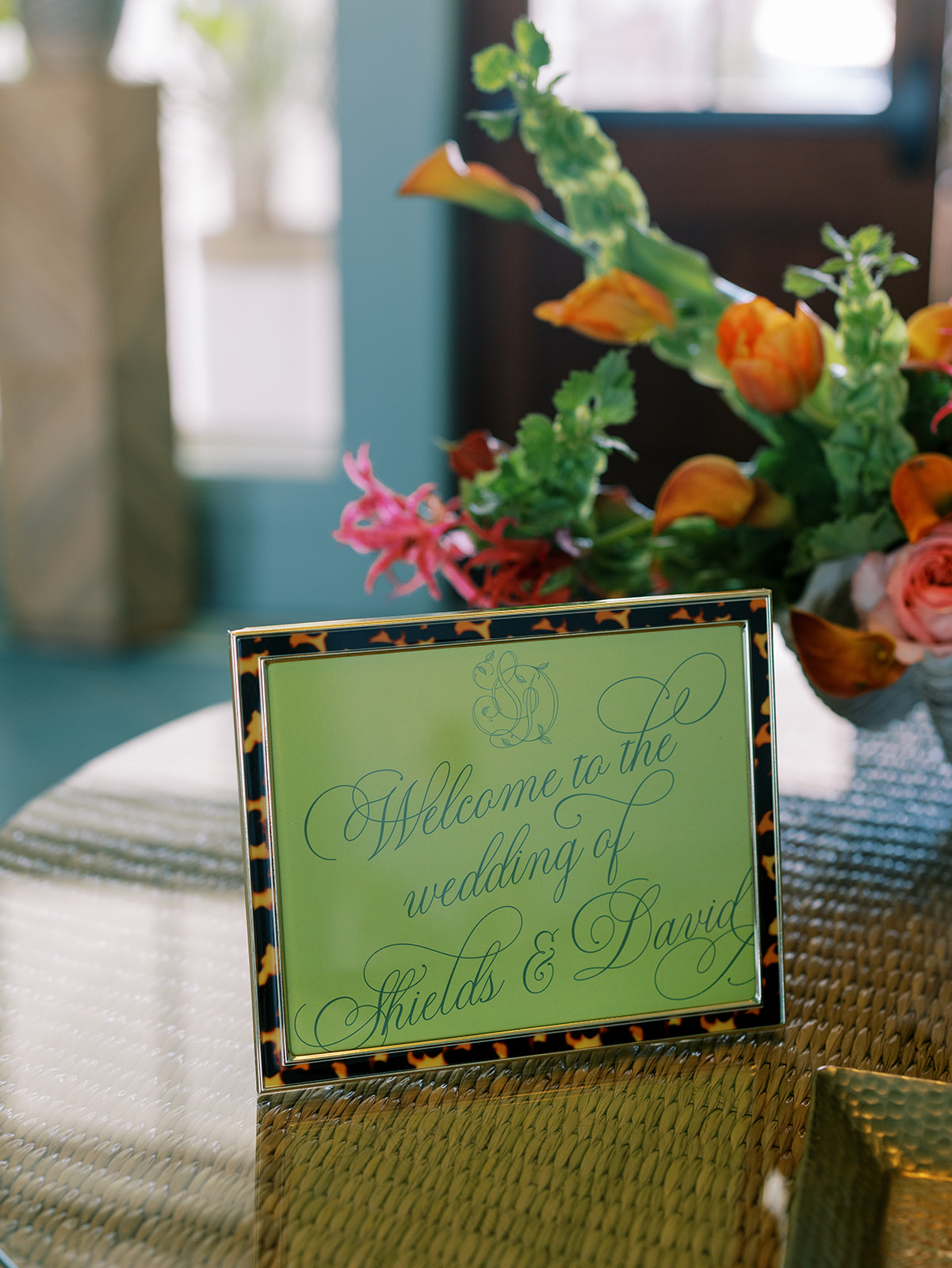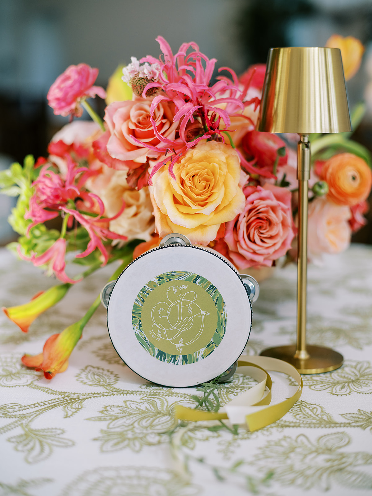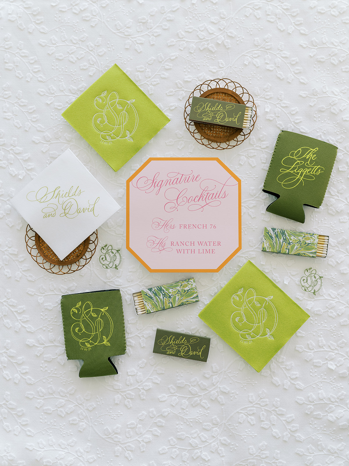 We also worked closely with the wonderful Surcie team to create a custom duogram and logo for the wedding with Shields & David’s initials, along with custom hand-penned calligraphy for their invitation suite and day-of stationery. This SD logo was simple stunning, and you can find it tastefully sprinkled throughout many of Shields and David’s design details, favors, and stationery, from their bar menus to their welcome signage to their koozies to their cocktail napkins to their drink stirrers to those fabulous tambourines for the dance floor. I am truly smitten with every singe design detail we dreamt up and brought to life for this wonderful couple! And the elevated accents of tortoiseshell and dark rattan kept it from being too green or too Spring-y.