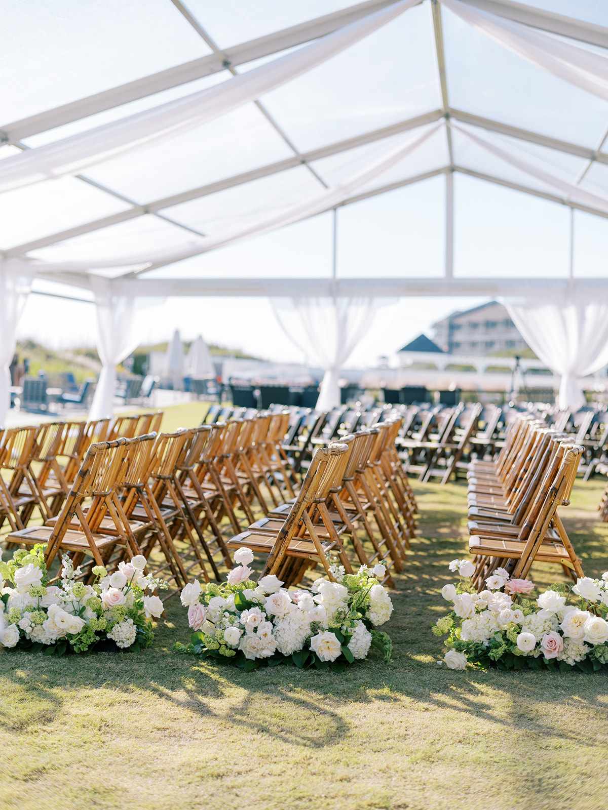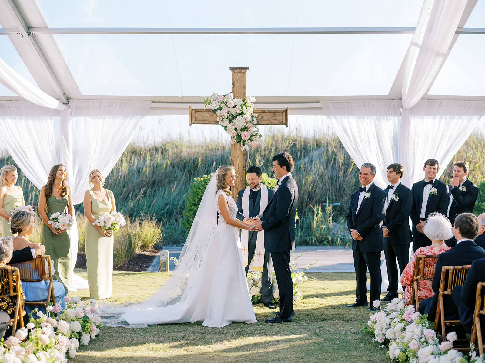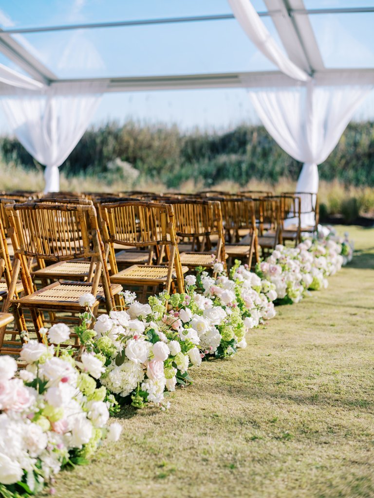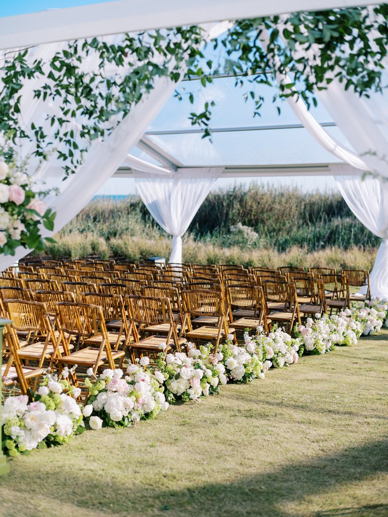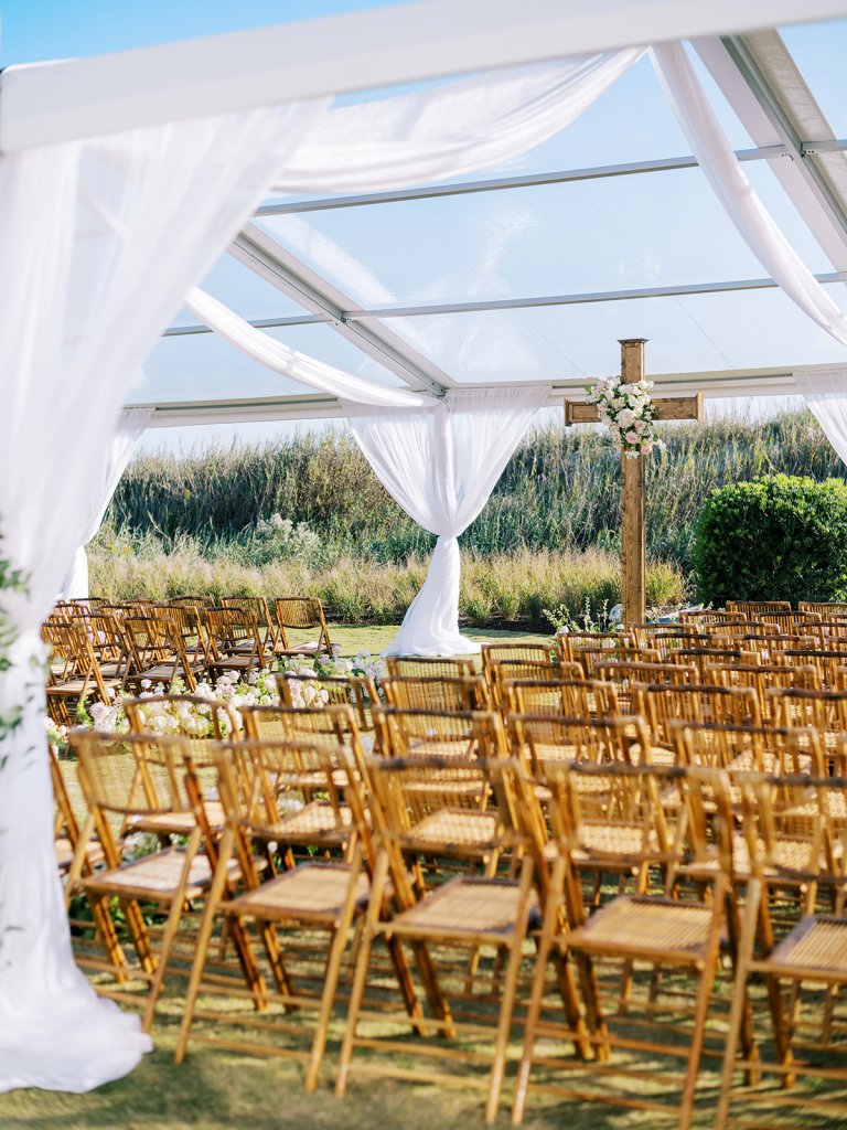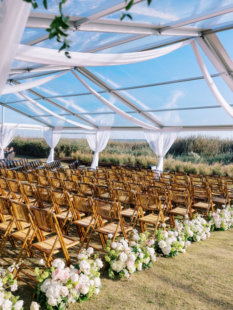 We wanted to keep all of the wedding day festivities in one location, and Coral Bay Club ended up being the perfect setting for Shields and David’s entire wedding day. The expansive back lawn overlooking the ocean – mere steps away! – was such a beautiful, gracious backdrop for their ceremony, along with part of cocktail hour. So that none of us had to worry about the rain or weather for an outdoor ceremony, we opted to have a clear top tent on the lawn, regardless of the weather. The picturesque clear top tent really distinguished the ceremony space and set it apart from cocktail hour, and the clear tenting overhead allowed the abundant sunshine to shine through. We also wanted to ensure the natural setting – the ocean views, the dunes, the grasses, the sky – was a focal point, and the softly billowing draping, dark bamboo chairs, and organic greenery allowed all of this.