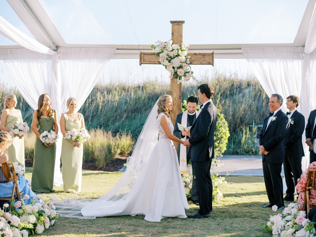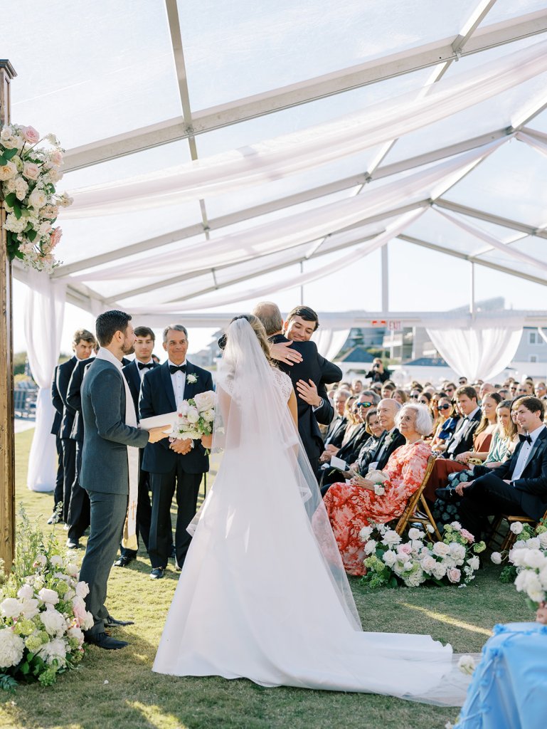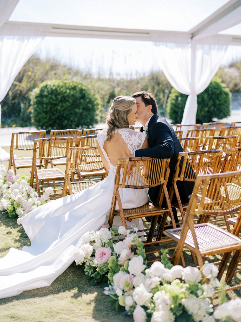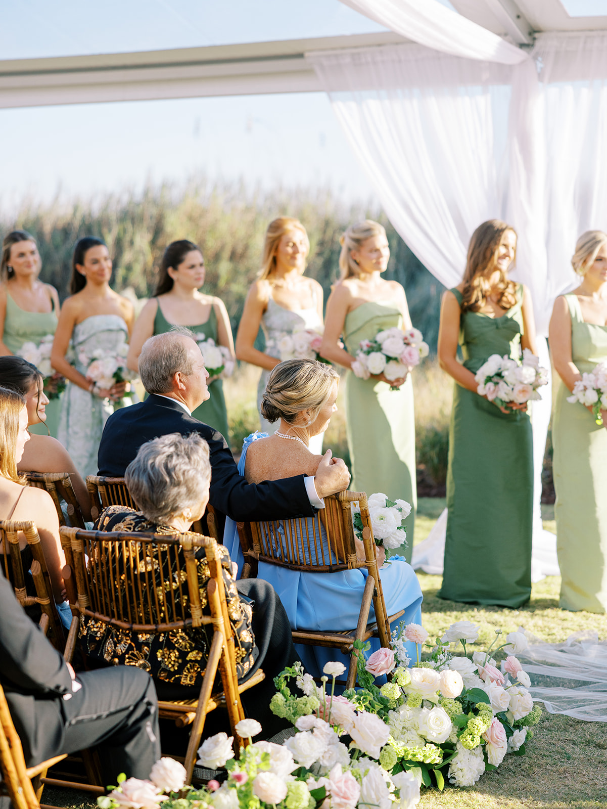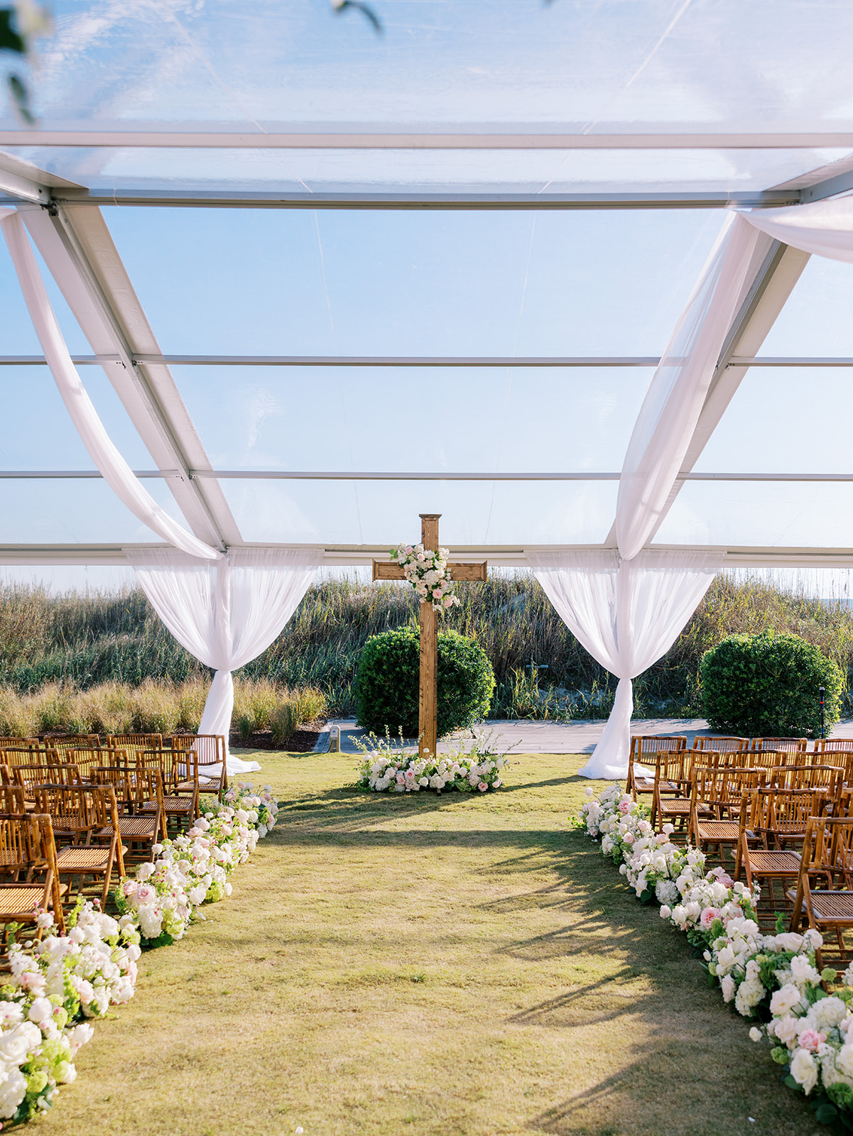 We wanted to keep all of the wedding day festivities in one location, and Coral Bay Club ended up being the perfect setting for Shields and David’s entire wedding day. The expansive back lawn overlooking the ocean – mere steps away! – was such a beautiful, gracious backdrop for their ceremony, along with part of cocktail hour. So that none of us had to worry about the rain or weather for an outdoor ceremony, we opted to have a clear top tent on the lawn, regardless of the weather. The picturesque clear top tent really distinguished the ceremony space and set it apart from cocktail hour, and the clear tenting overhead allowed the abundant sunshine to shine through. We also wanted to ensure the natural setting – the ocean views, the dunes, the grasses, the sky – was a focal point, and the softly billowing draping, dark bamboo chairs, and organic greenery allowed all of this.