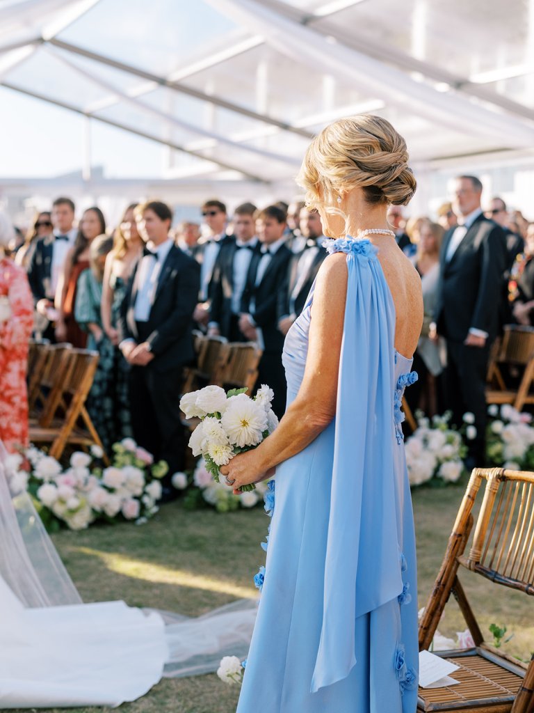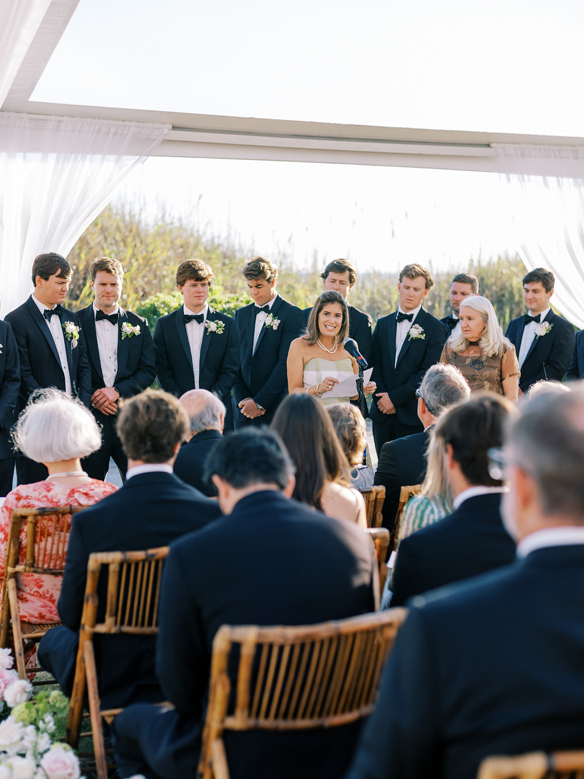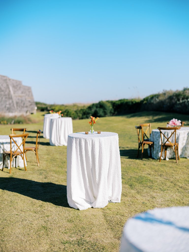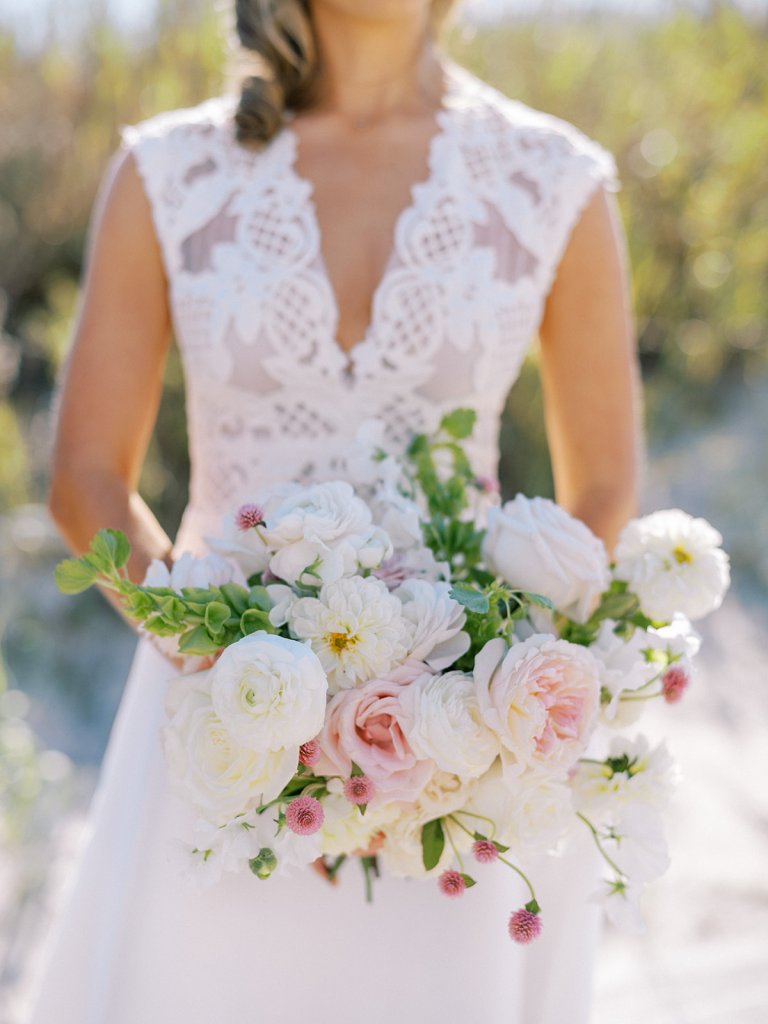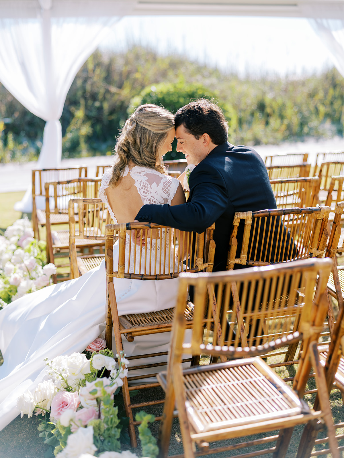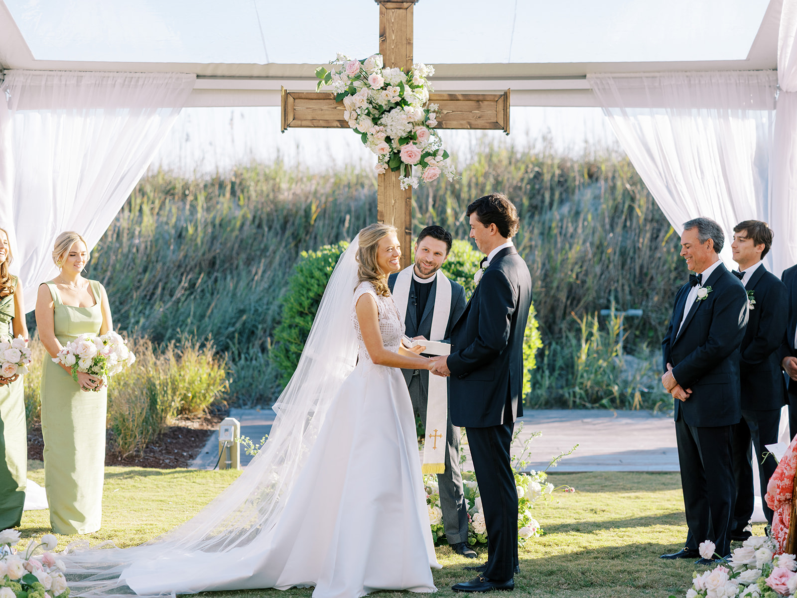 We wanted to keep all of the wedding day festivities in one location, and Coral Bay Club ended up being the perfect setting for Shields and David’s entire wedding day. The expansive back lawn overlooking the ocean – mere steps away! – was such a beautiful, gracious backdrop for their ceremony, along with part of cocktail hour. So that none of us had to worry about the rain or weather for an outdoor ceremony, we opted to have a clear top tent on the lawn, regardless of the weather. The picturesque clear top tent really distinguished the ceremony space and set it apart from cocktail hour, and the clear tenting overhead allowed the abundant sunshine to shine through. We also wanted to ensure the natural setting – the ocean views, the dunes, the grasses, the sky – was a focal point, and the softly billowing draping, dark bamboo chairs, and organic greenery allowed all of this.
