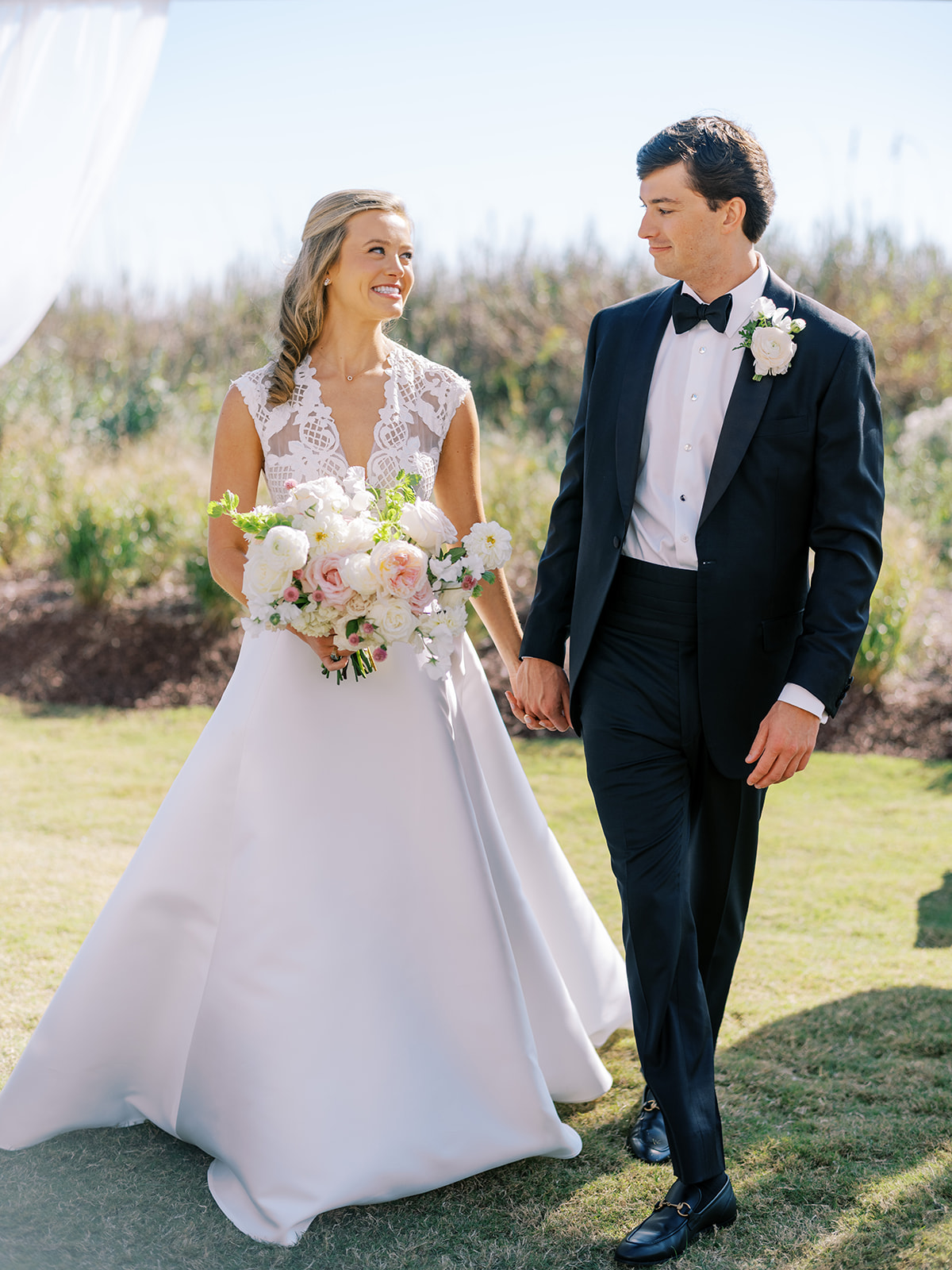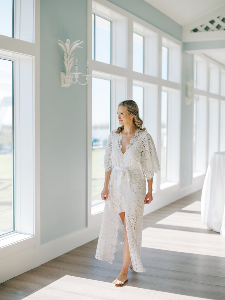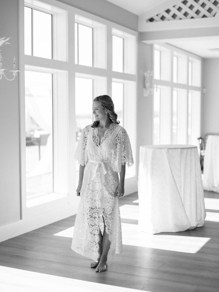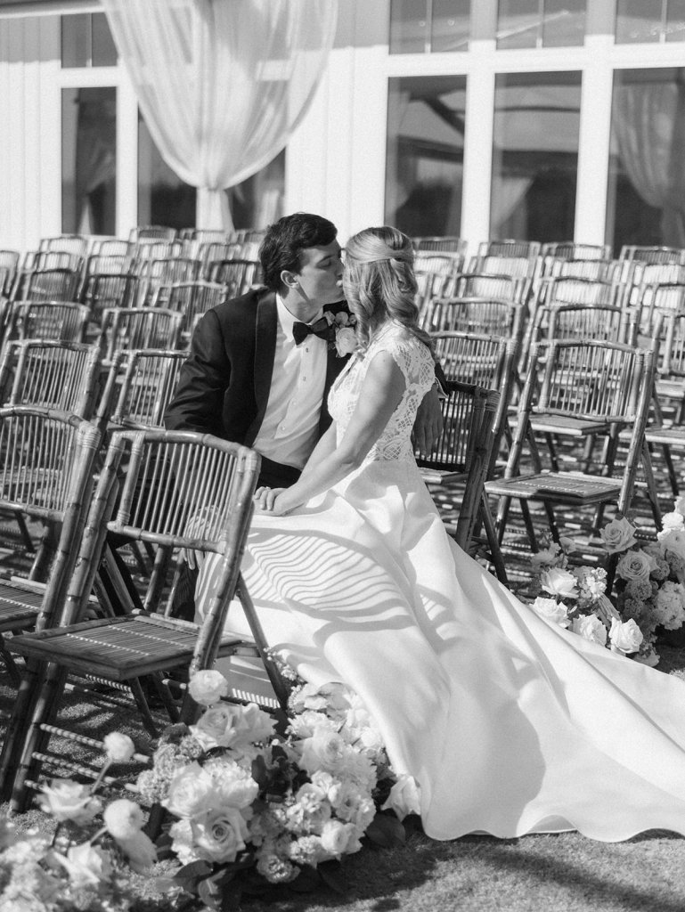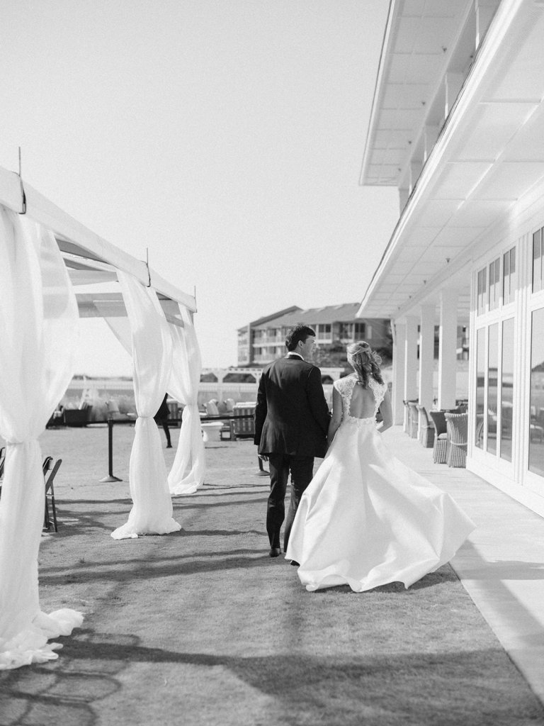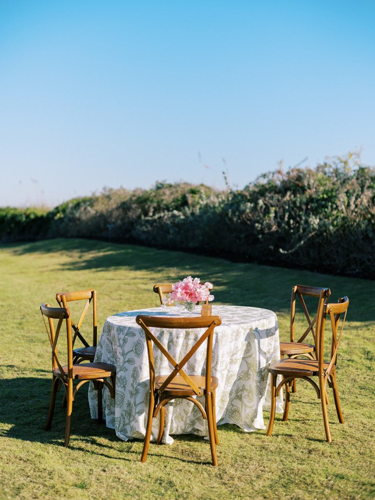 We wanted to keep all of the wedding day festivities in one location, and Coral Bay Club ended up being the perfect setting for Shields and David’s entire wedding day. The expansive back lawn overlooking the ocean – mere steps away! – was such a beautiful, gracious backdrop for their ceremony, along with part of cocktail hour. So that none of us had to worry about the rain or weather for an outdoor ceremony, we opted to have a clear top tent on the lawn, regardless of the weather. The picturesque clear top tent really distinguished the ceremony space and set it apart from cocktail hour, and the clear tenting overhead allowed the abundant sunshine to shine through. We also wanted to ensure the natural setting – the ocean views, the dunes, the grasses, the sky – was a focal point, and the softly billowing draping, dark bamboo chairs, and organic greenery allowed all of this.