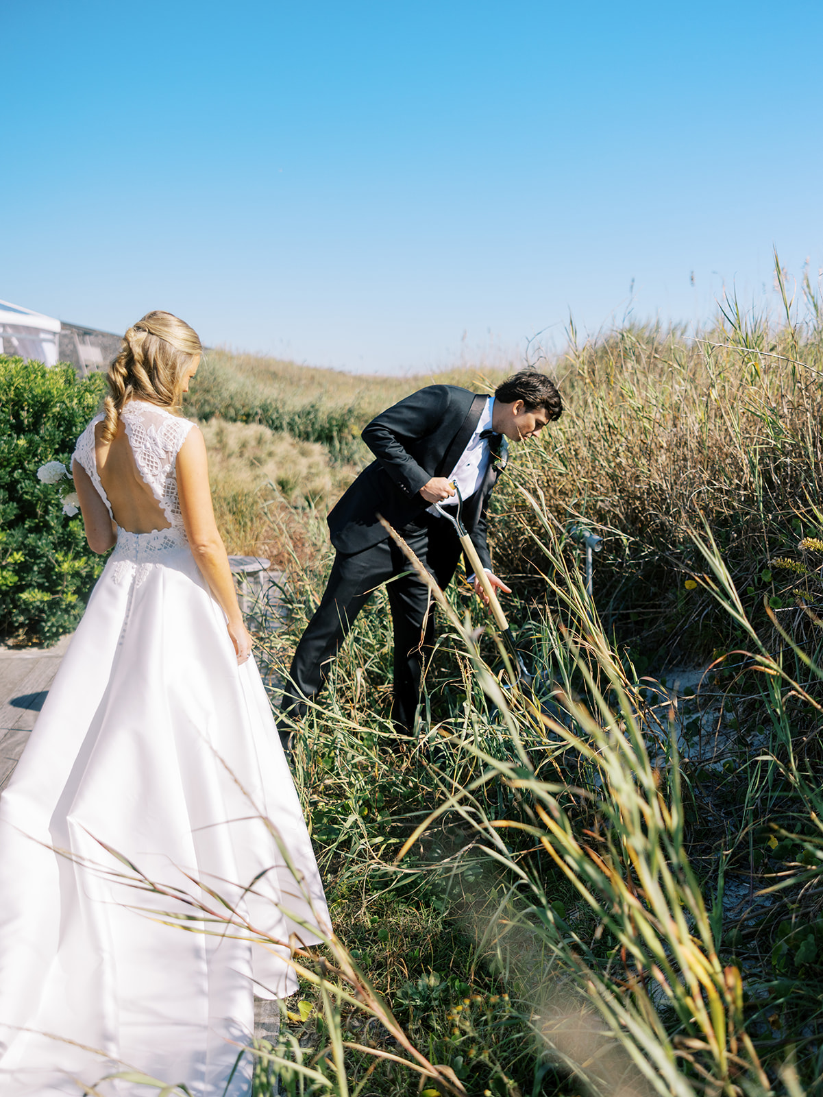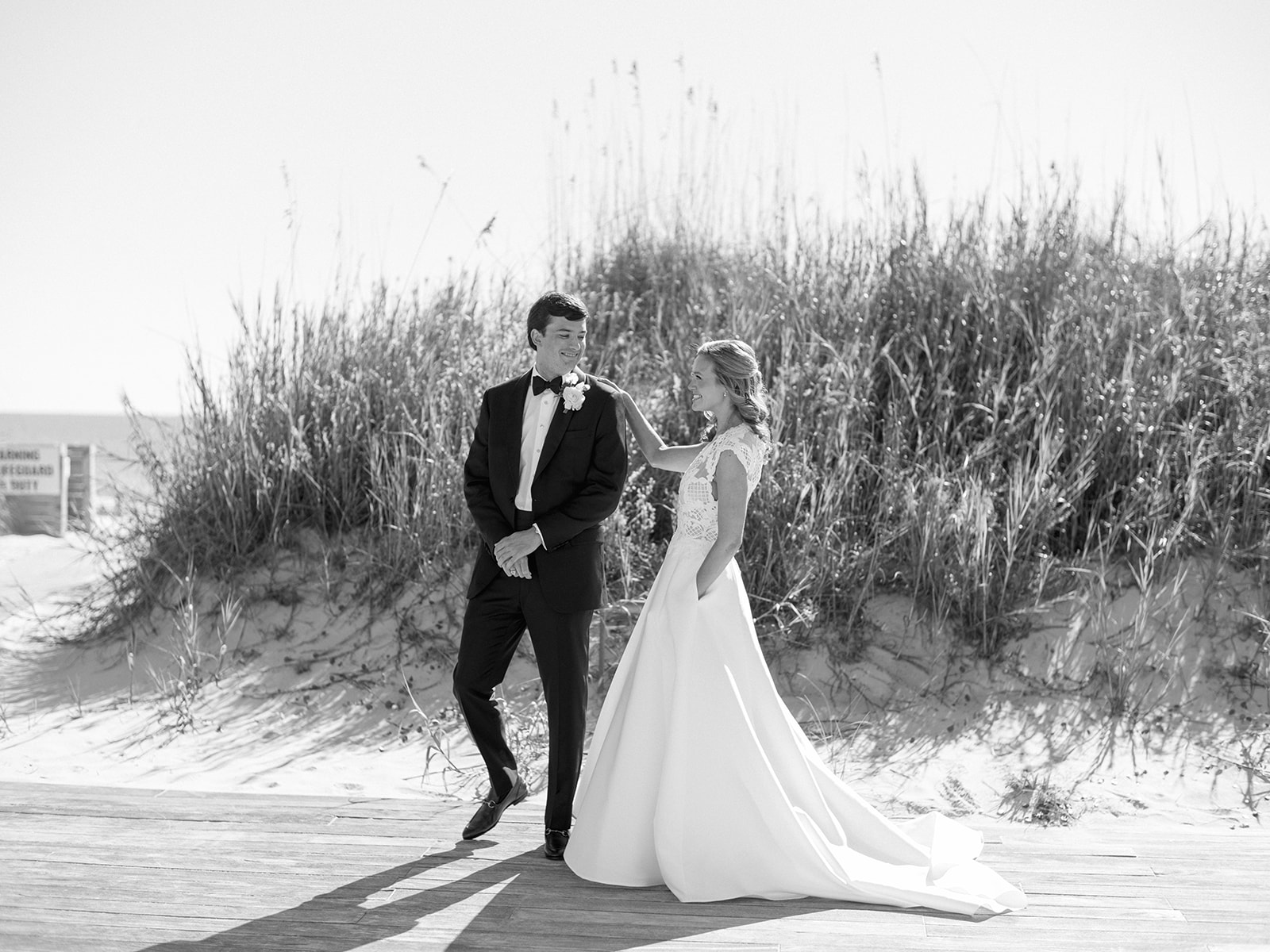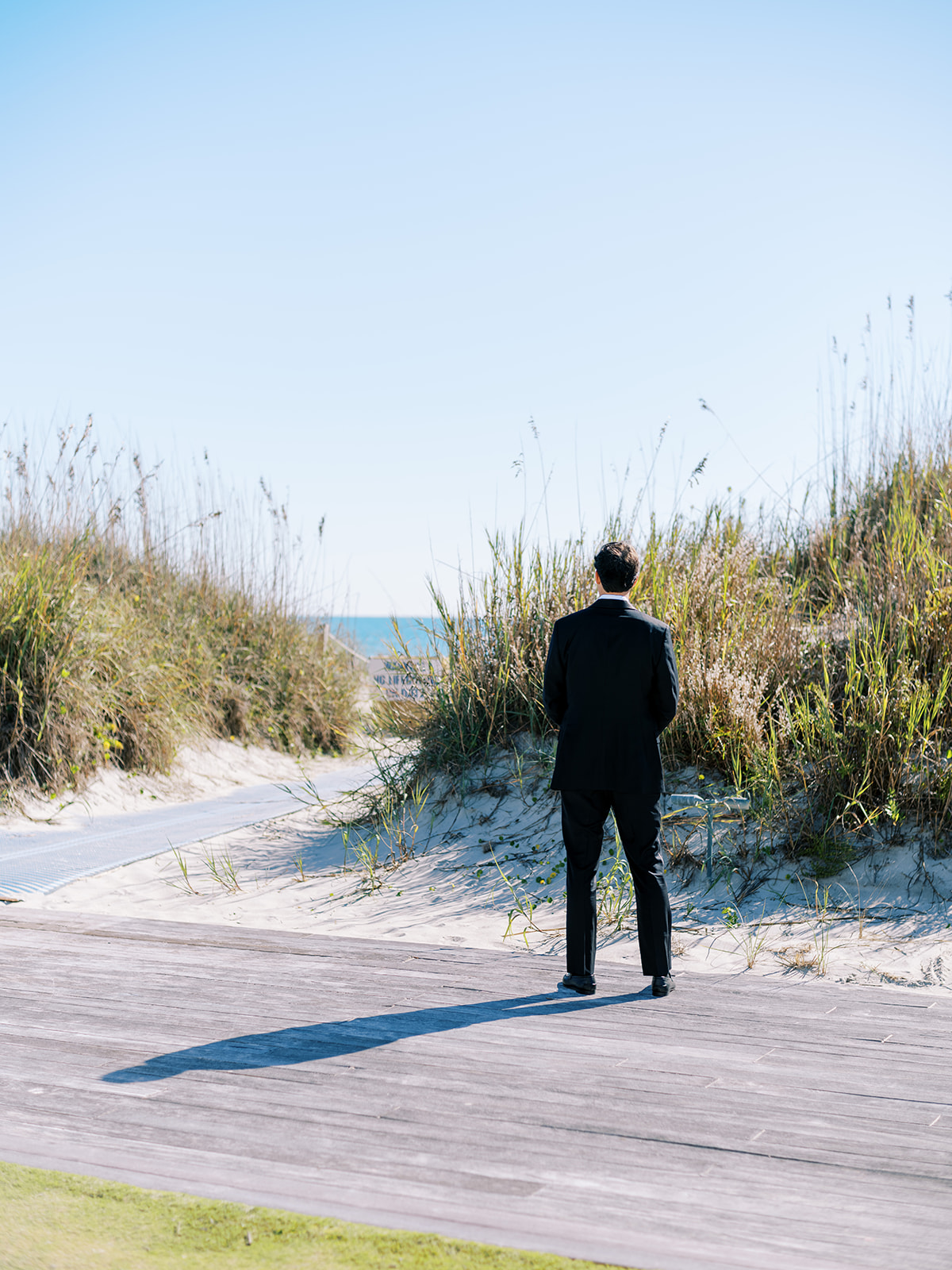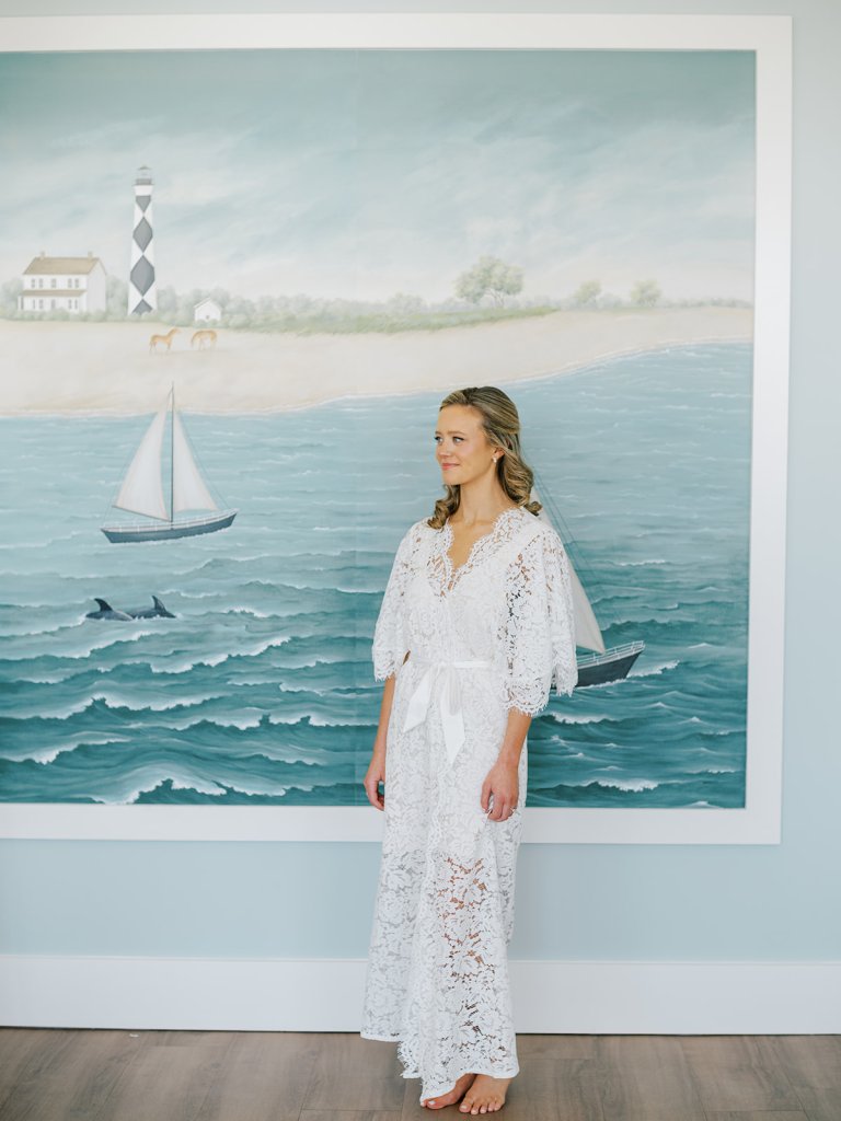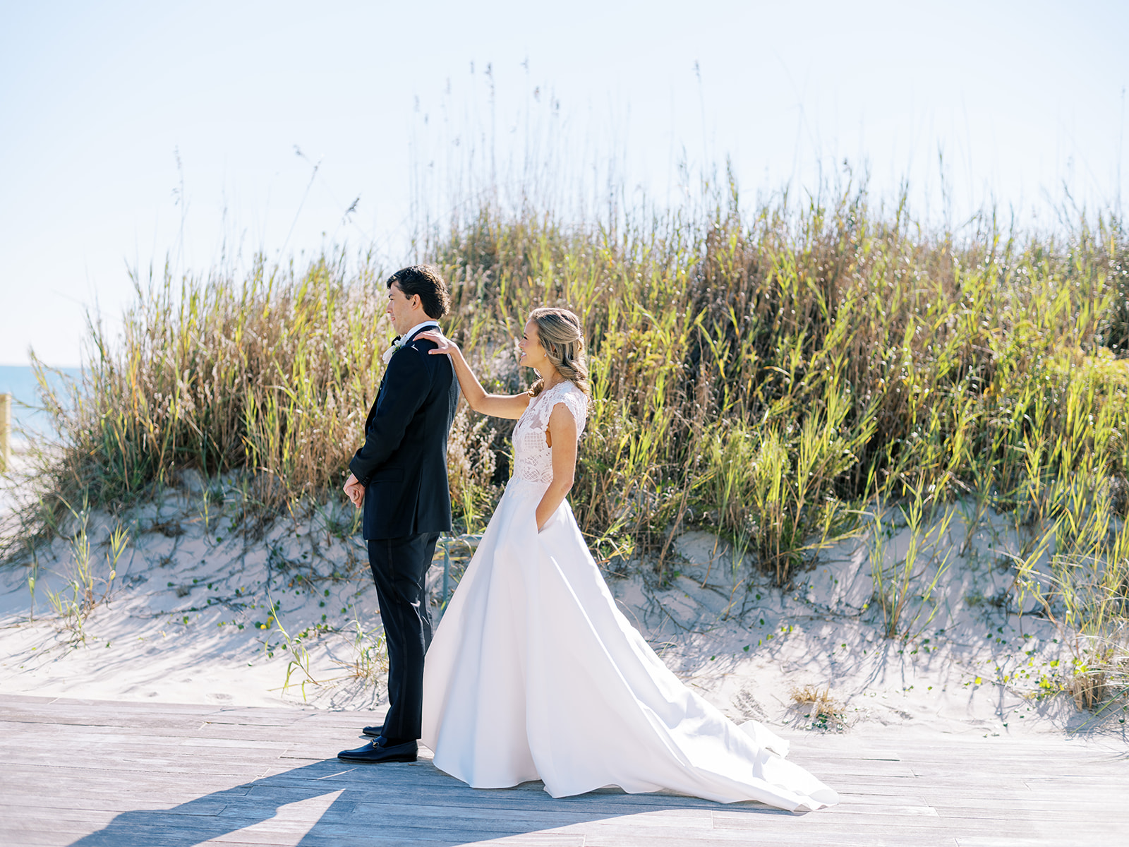 We wanted to keep all of the wedding day festivities in one location, and Coral Bay Club ended up being the perfect setting for Shields and David’s entire wedding day. The expansive back lawn overlooking the ocean – mere steps away! – was such a beautiful, gracious backdrop for their ceremony, along with part of cocktail hour. So that none of us had to worry about the rain or weather for an outdoor ceremony, we opted to have a clear top tent on the lawn, regardless of the weather. The picturesque clear top tent really distinguished the ceremony space and set it apart from cocktail hour, and the clear tenting overhead allowed the abundant sunshine to shine through. We also wanted to ensure the natural setting – the ocean views, the dunes, the grasses, the sky – was a focal point, and the softly billowing draping, dark bamboo chairs, and organic greenery allowed all of this.