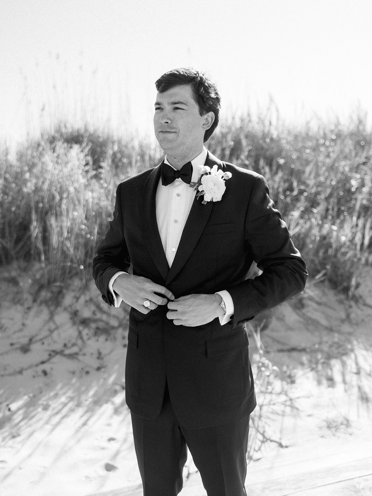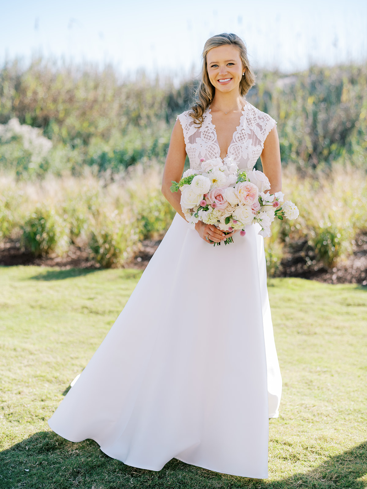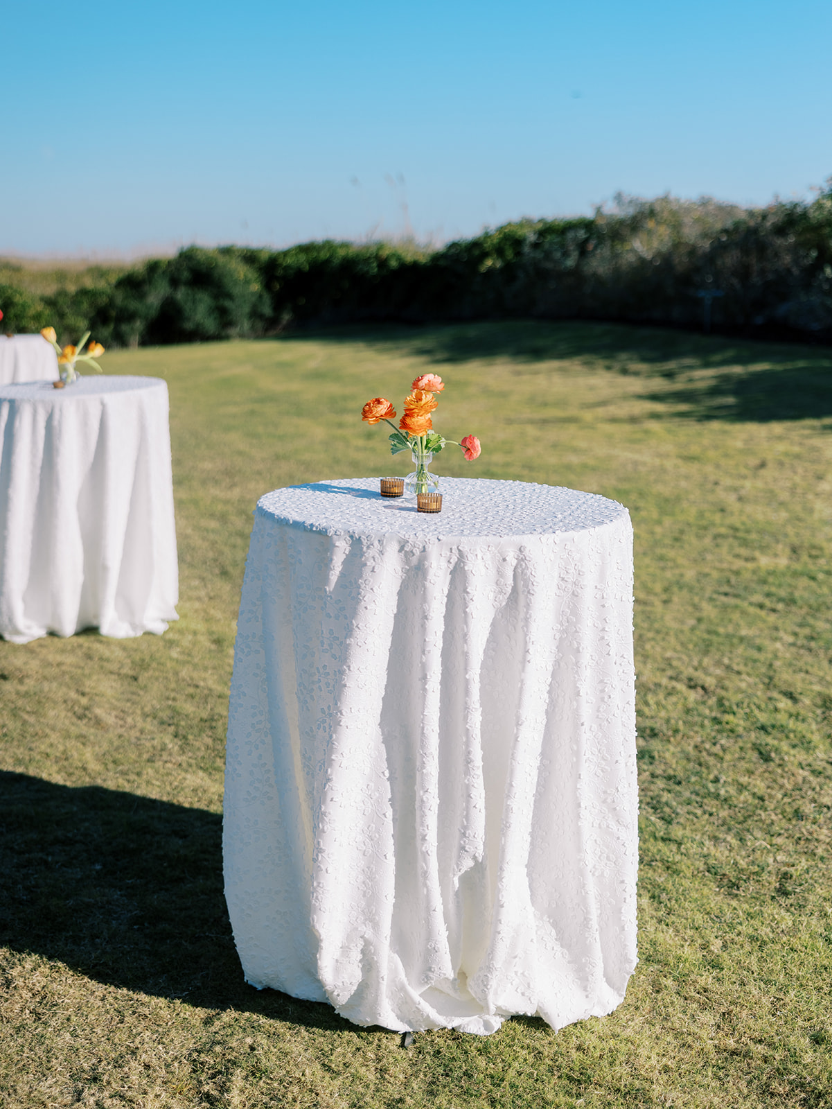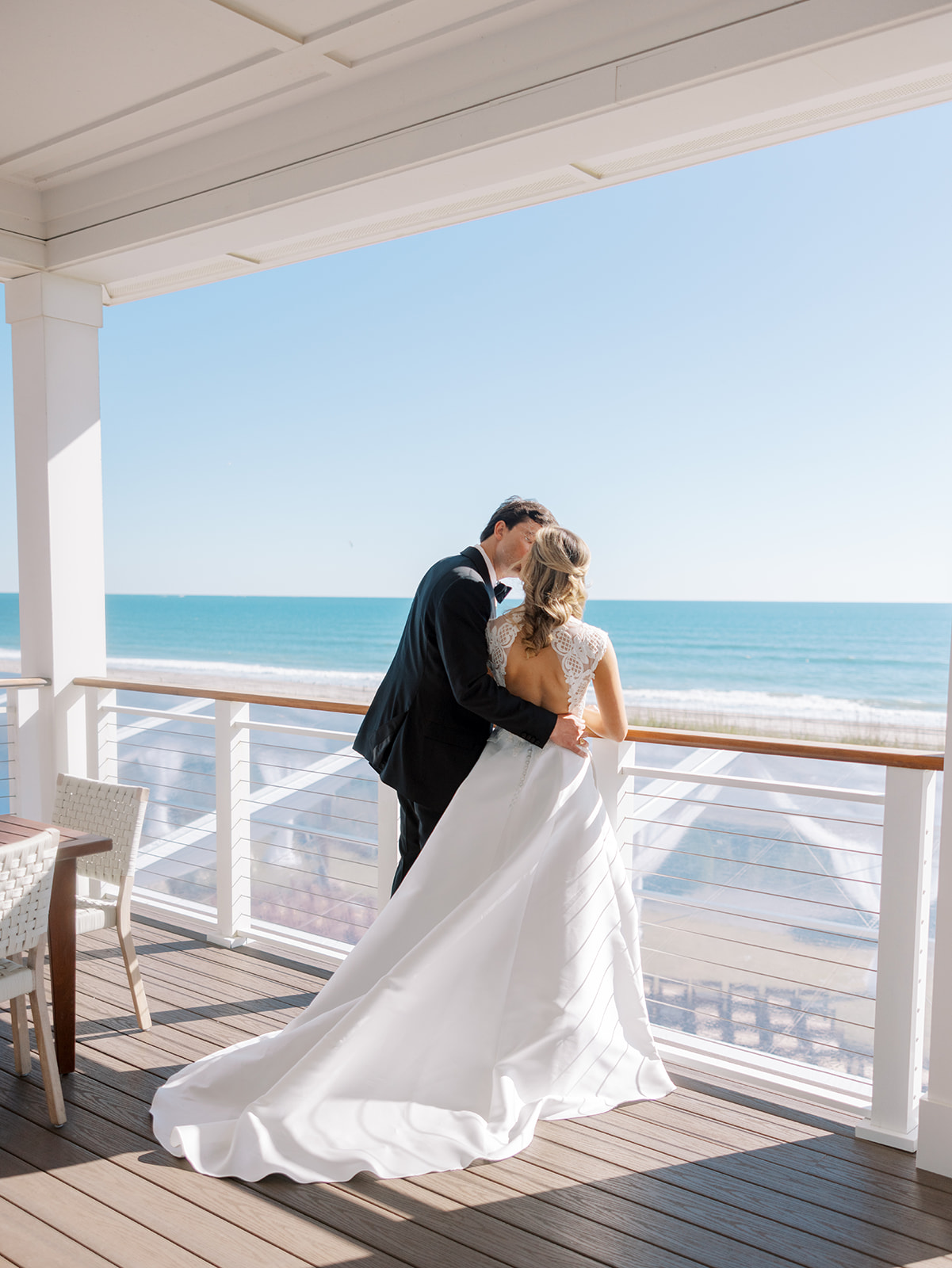 We wanted to keep all of the wedding day festivities in one location, and Coral Bay Club ended up being the perfect setting for Shields and David’s entire wedding day. The expansive back lawn overlooking the ocean – mere steps away! – was such a beautiful, gracious backdrop for their ceremony, along with part of cocktail hour. So that none of us had to worry about the rain or weather for an outdoor ceremony, we opted to have a clear top tent on the lawn, regardless of the weather. The picturesque clear top tent really distinguished the ceremony space and set it apart from cocktail hour, and the clear tenting overhead allowed the abundant sunshine to shine through. We also wanted to ensure the natural setting – the ocean views, the dunes, the grasses, the sky – was a focal point, and the softly billowing draping, dark bamboo chairs, and organic greenery allowed all of this.