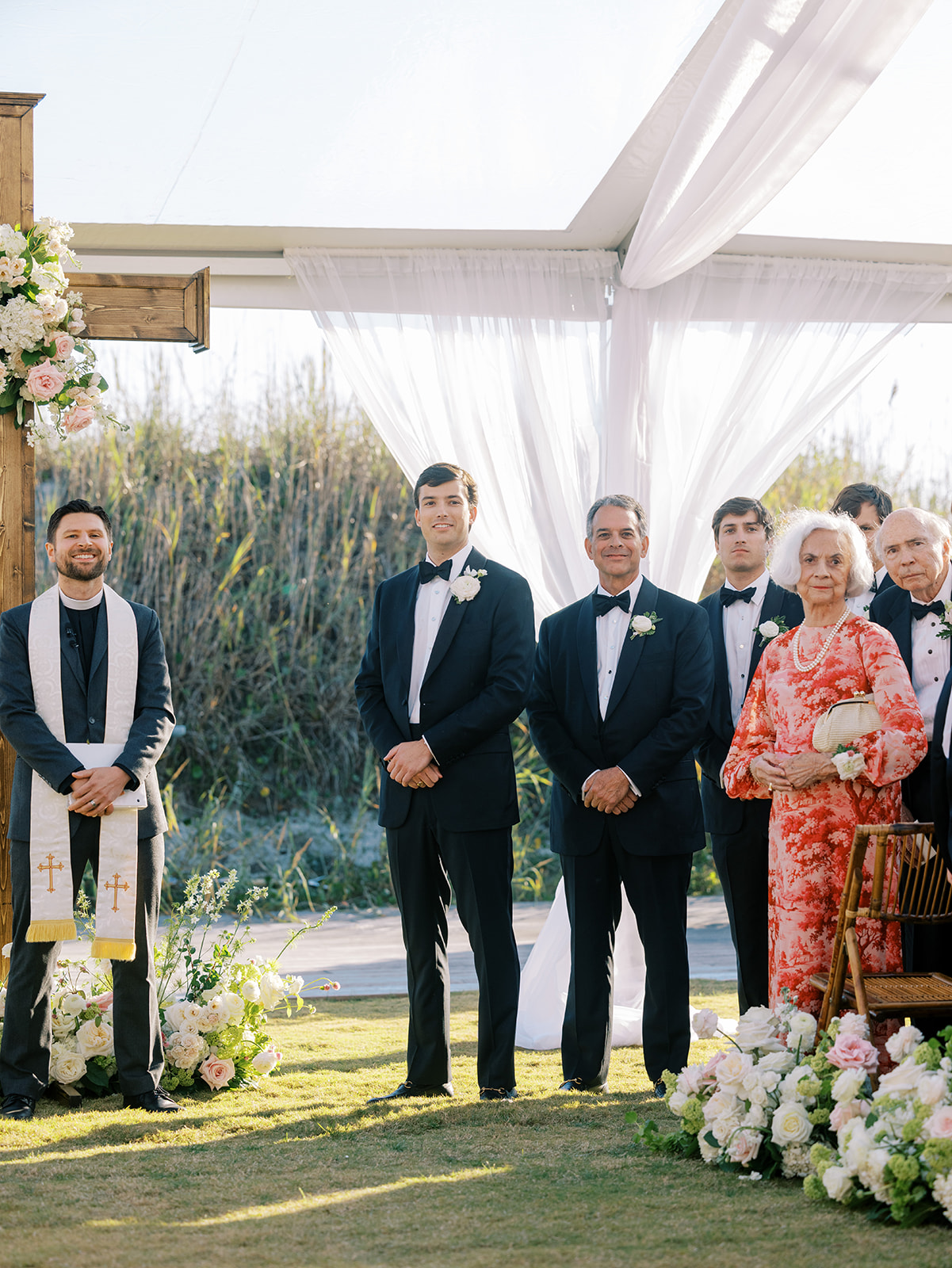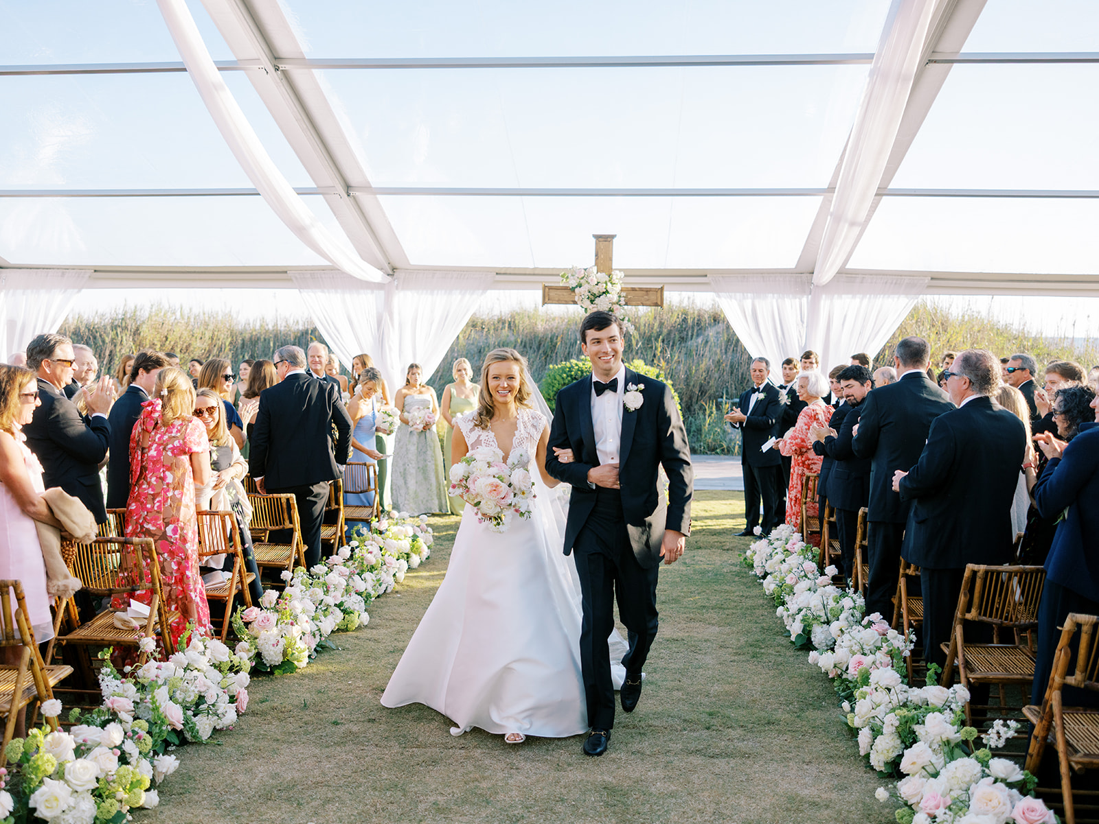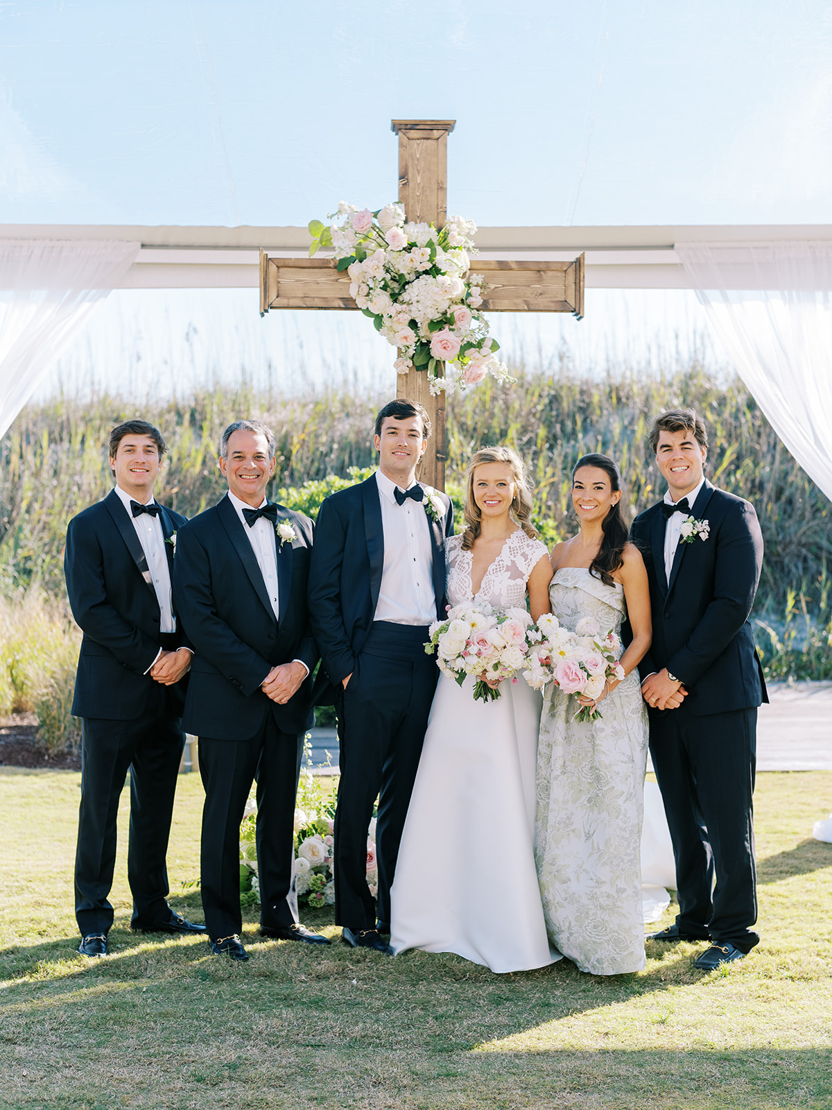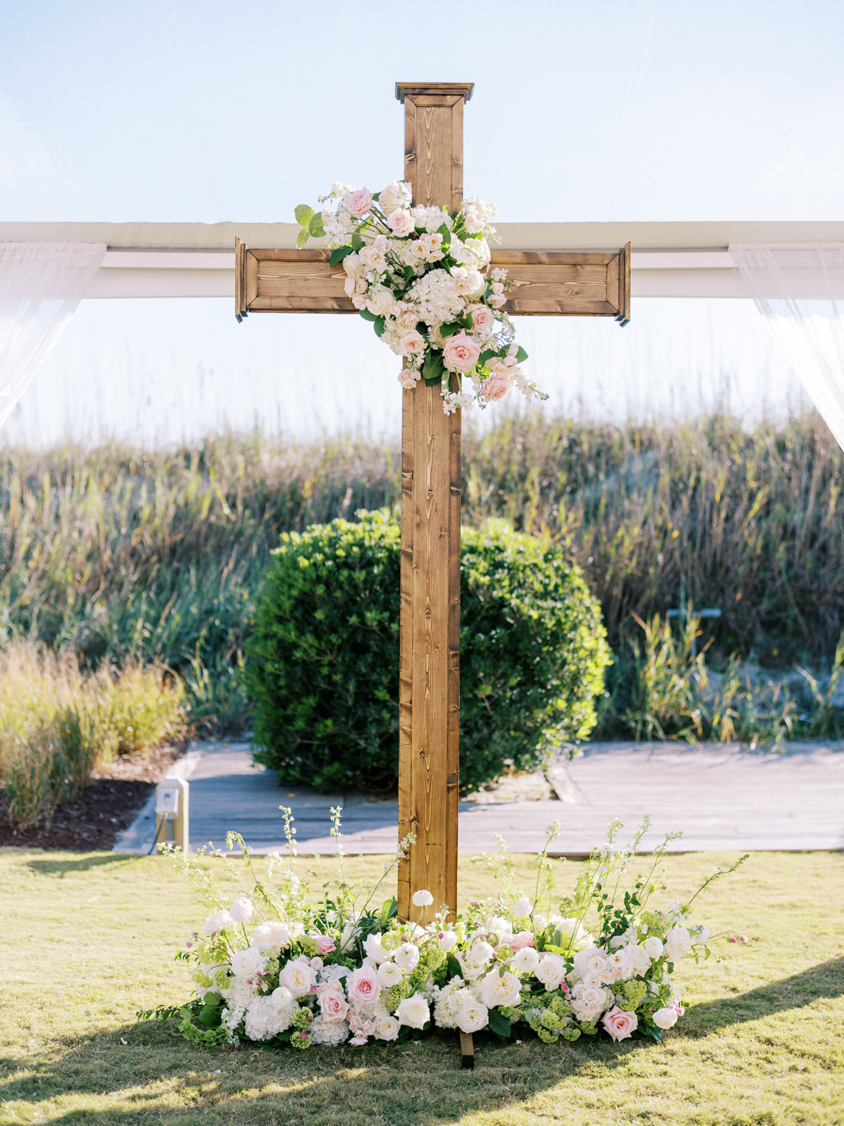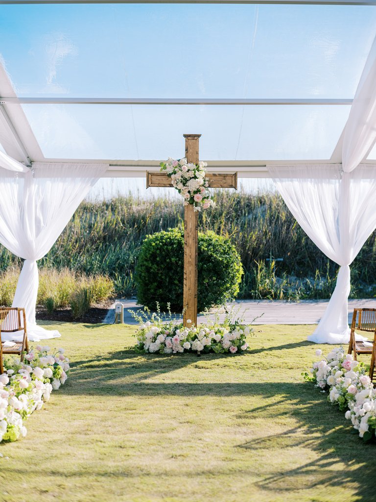 This is what it’s all about – and it’s absolutely the heartbeat behind the work that I do: to celebrate the joyous start of strong marriages in the loving company of your treasured family and friends. From start to finish, Shields and David’s wedding was a day filled with unbelievable love, celebration, and beauty — and it was so apparent just how loved Shields & David are. With a clear top tent on the lawn with the ocean and rolling dunes as a backdrop, their ceremony was simply beautiful & deeply meaningful. From the picture perfect fall weather (not a single cloud in the sky!) to the wooden cross adorned with flowers to the lush aisle flowers and floral urns to the romantic tent draping with bamboo chairs, we chose every detail with such intention and heart.