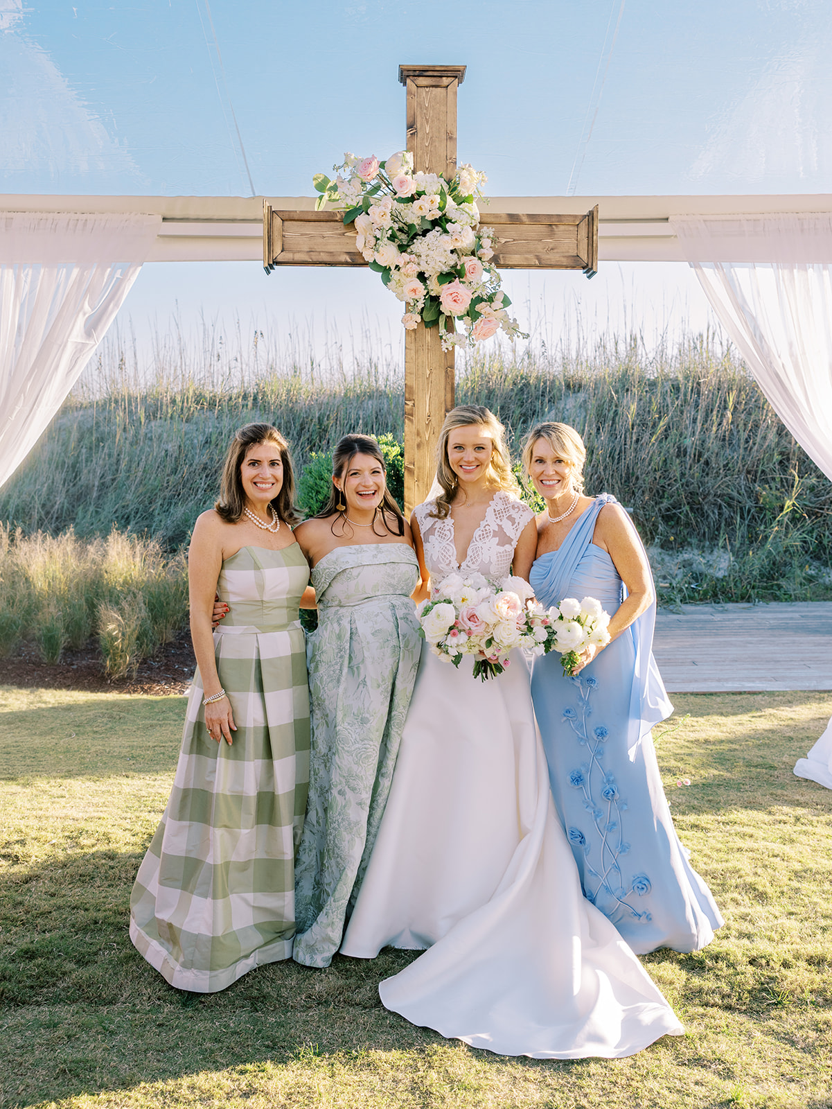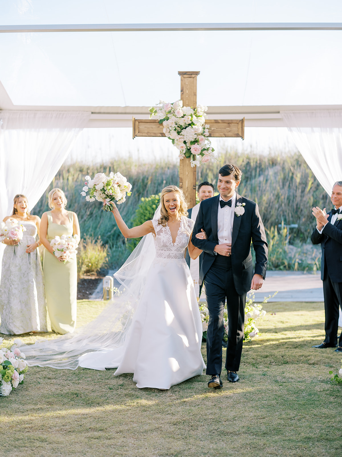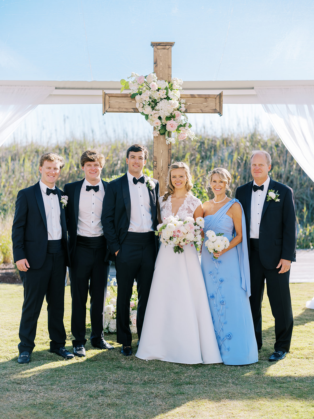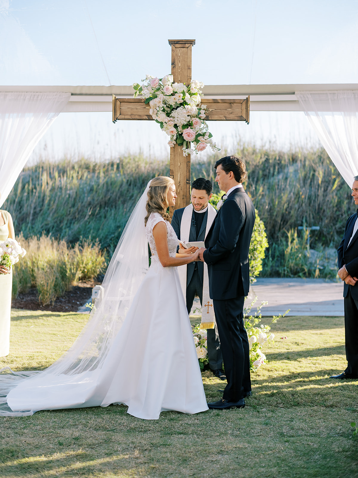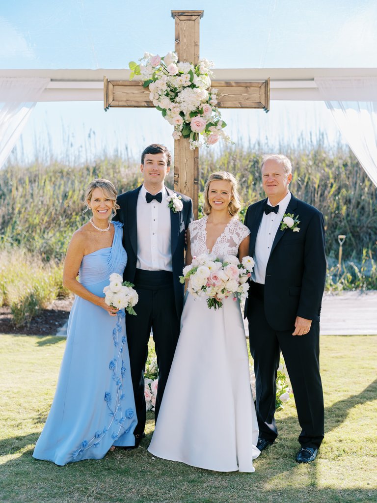 This is what it’s all about – and it’s absolutely the heartbeat behind the work that I do: to celebrate the joyous start of strong marriages in the loving company of your treasured family and friends. From start to finish, Shields and David’s wedding was a day filled with unbelievable love, celebration, and beauty — and it was so apparent just how loved Shields & David are. With a clear top tent on the lawn with the ocean and rolling dunes as a backdrop, their ceremony was simply beautiful & deeply meaningful. From the picture perfect fall weather (not a single cloud in the sky!) to the wooden cross adorned with flowers to the lush aisle flowers and floral urns to the romantic tent draping with bamboo chairs, we chose every detail with such intention and heart.