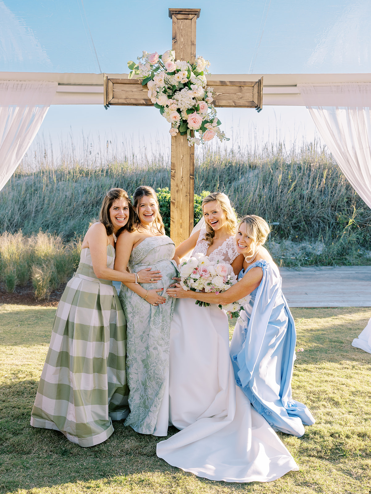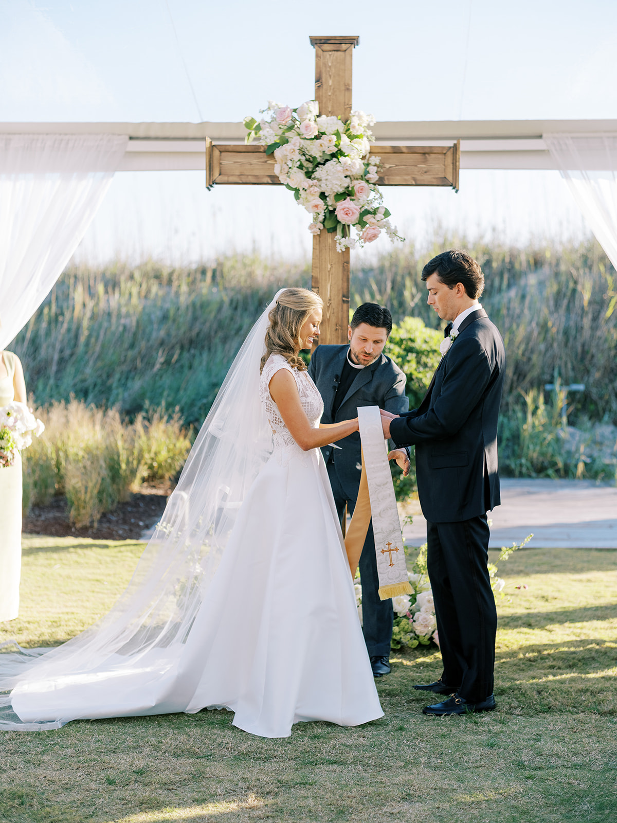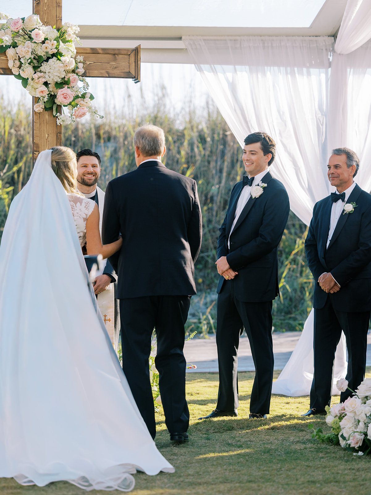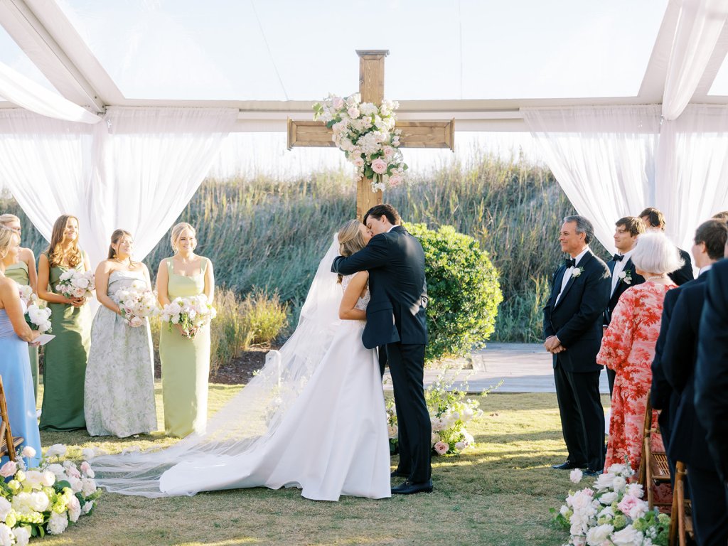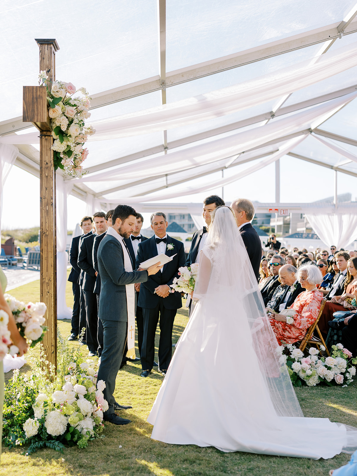 This is what it’s all about – and it’s absolutely the heartbeat behind the work that I do: to celebrate the joyous start of strong marriages in the loving company of your treasured family and friends. From start to finish, Shields and David’s wedding was a day filled with unbelievable love, celebration, and beauty — and it was so apparent just how loved Shields & David are. With a clear top tent on the lawn with the ocean and rolling dunes as a backdrop, their ceremony was simply beautiful & deeply meaningful. From the picture perfect fall weather (not a single cloud in the sky!) to the wooden cross adorned with flowers to the lush aisle flowers and floral urns to the romantic tent draping with bamboo chairs, we chose every detail with such intention and heart.