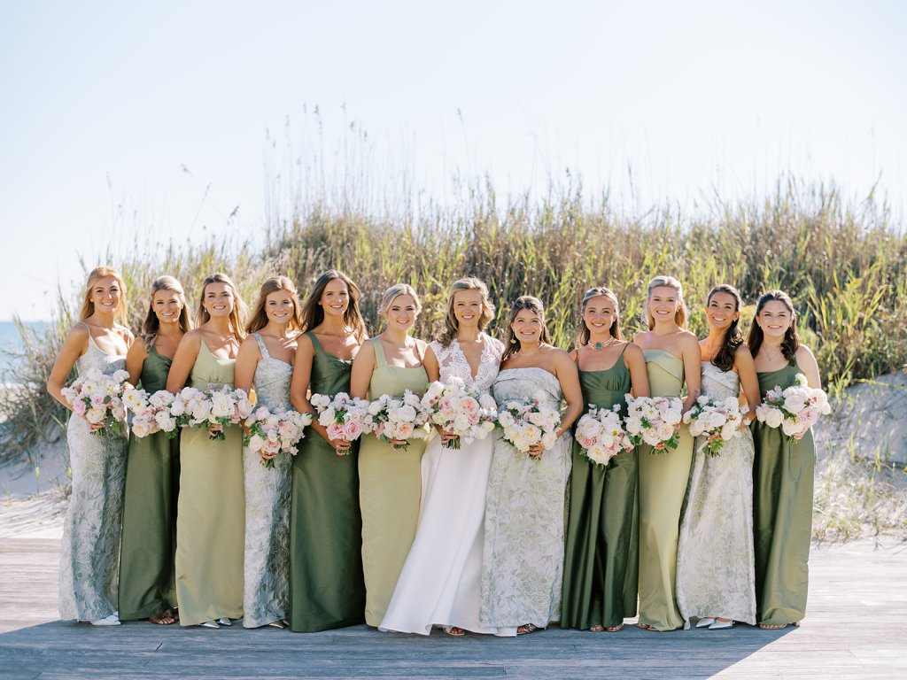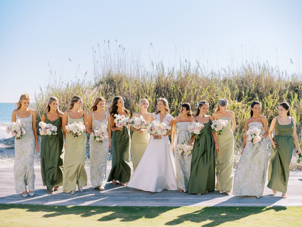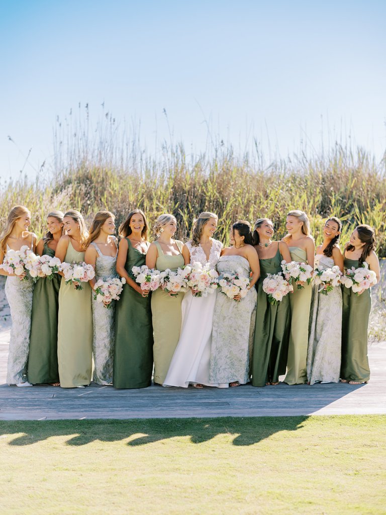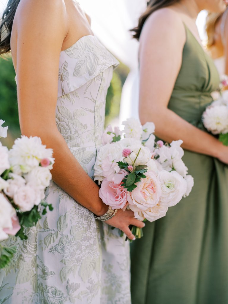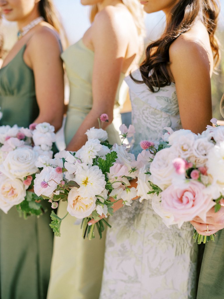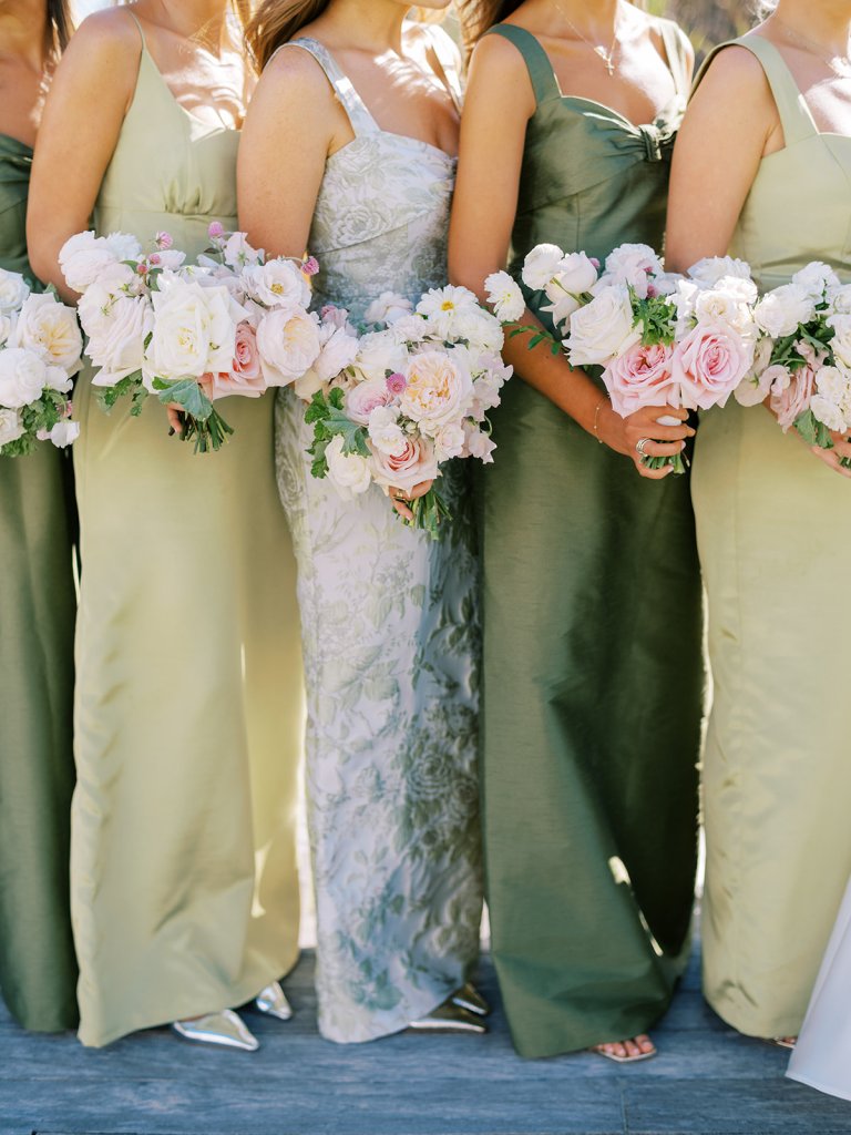 I absolutely adore the combination of Lula Kate bridesmaid dresses we curated for Shields’ bridesmaids: a mix of three green Lula Kate gowns in various necklines, giving each gown personality while creating a cohesive, fashion-forward, beautiful blend of dresses. For the ceremony and personal flowers, like the bouquets, we also chose to keep the floral design more muted and soft with a romantic palette of creams, whites, pale pink, and greenery so that the flowers wouldn’t compete or distract from the gowns, as well as to keep the ceremony flowers more classic, soft, and harmonious with the feel of the momentous moments unfolding. And then we really turned on the color with vibrant, juicy hot pinks, oranges, and chartreuse for their cocktail hour & reception!