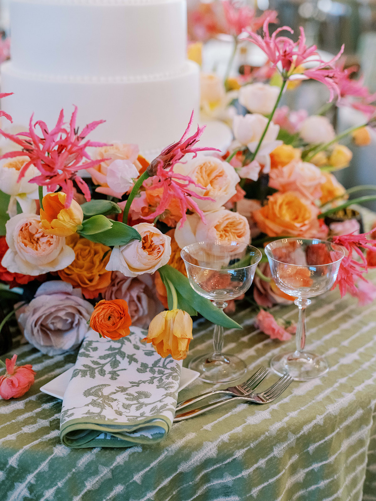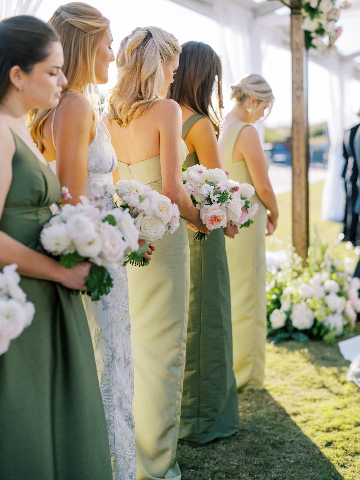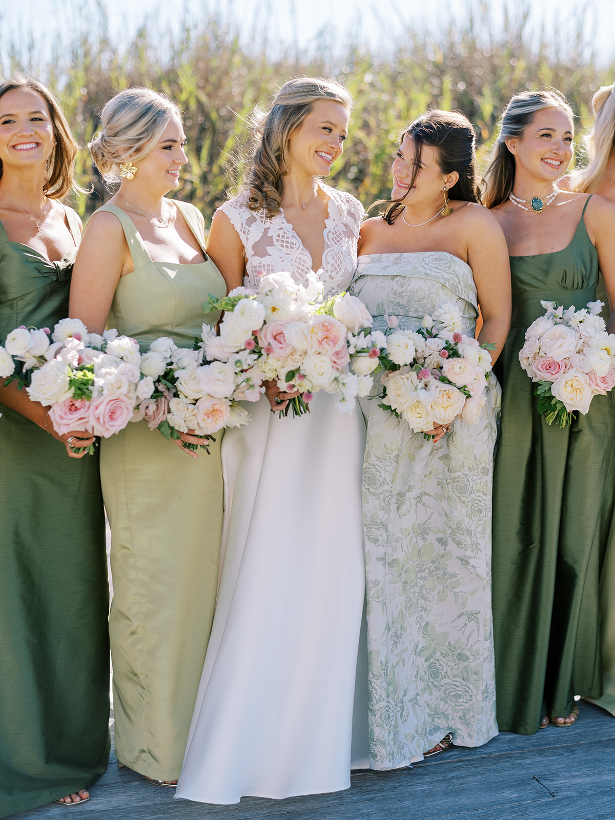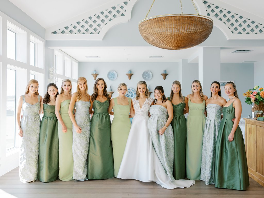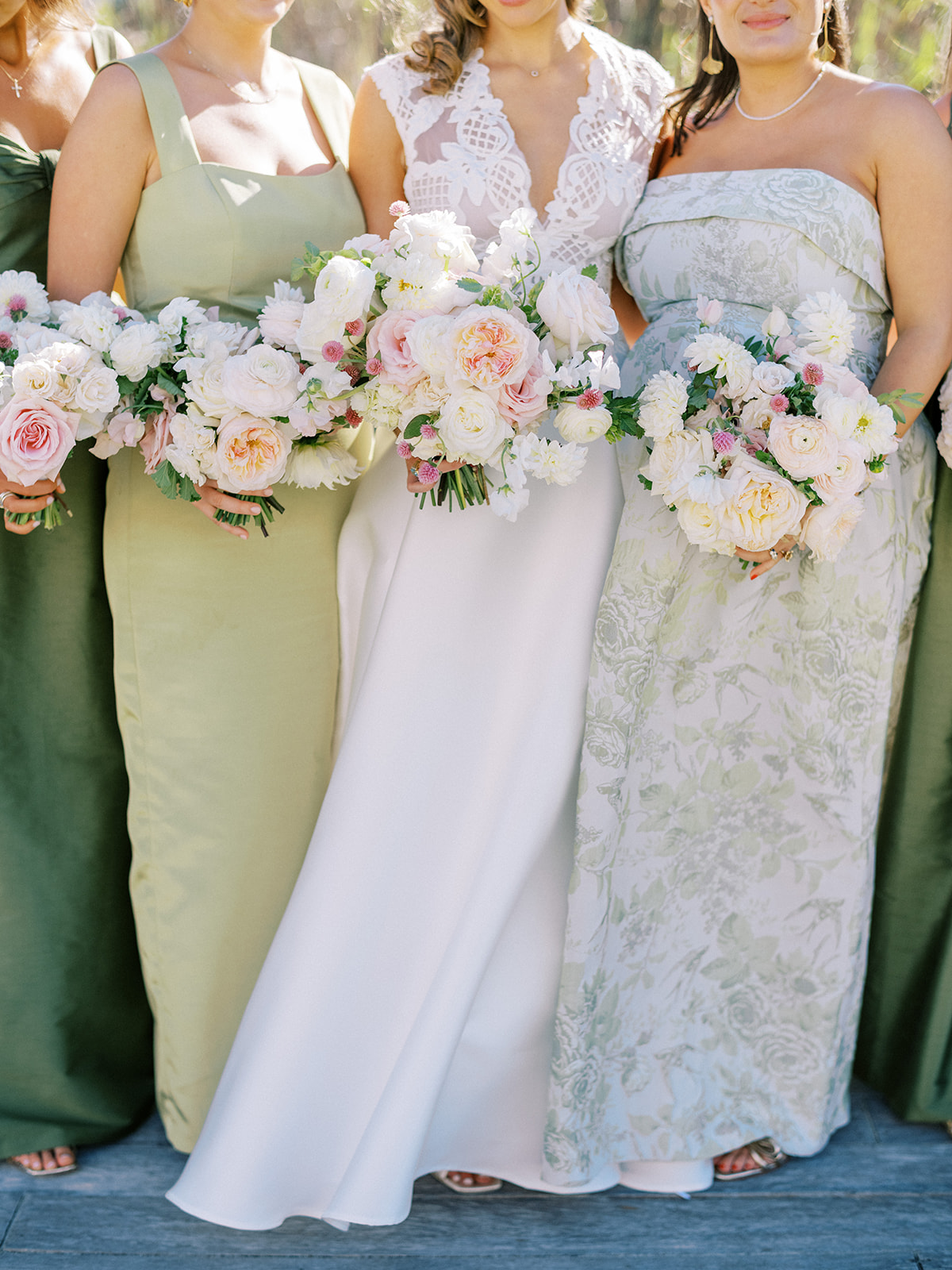 I absolutely adore the combination of Lula Kate bridesmaid dresses we curated for Shields’ bridesmaids: a mix of three green Lula Kate gowns in various necklines, giving each gown personality while creating a cohesive, fashion-forward, beautiful blend of dresses. For the ceremony and personal flowers, like the bouquets, we also chose to keep the floral design more muted and soft with a romantic palette of creams, whites, pale pink, and greenery so that the flowers wouldn’t compete or distract from the gowns, as well as to keep the ceremony flowers more classic, soft, and harmonious with the feel of the momentous moments unfolding. And then we really turned on the color with vibrant, juicy hot pinks, oranges, and chartreuse for their cocktail hour & reception!