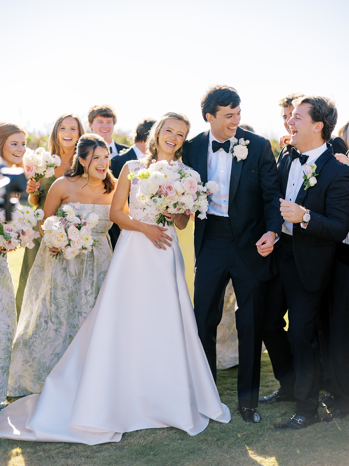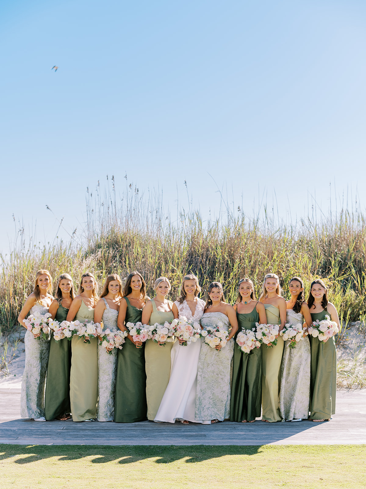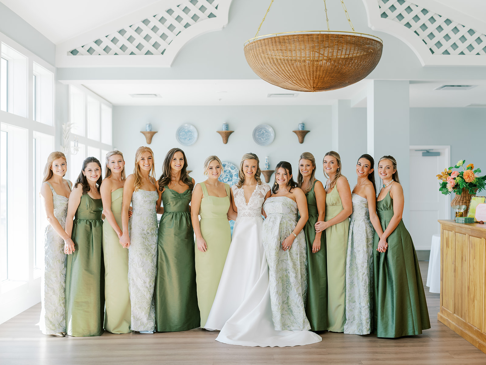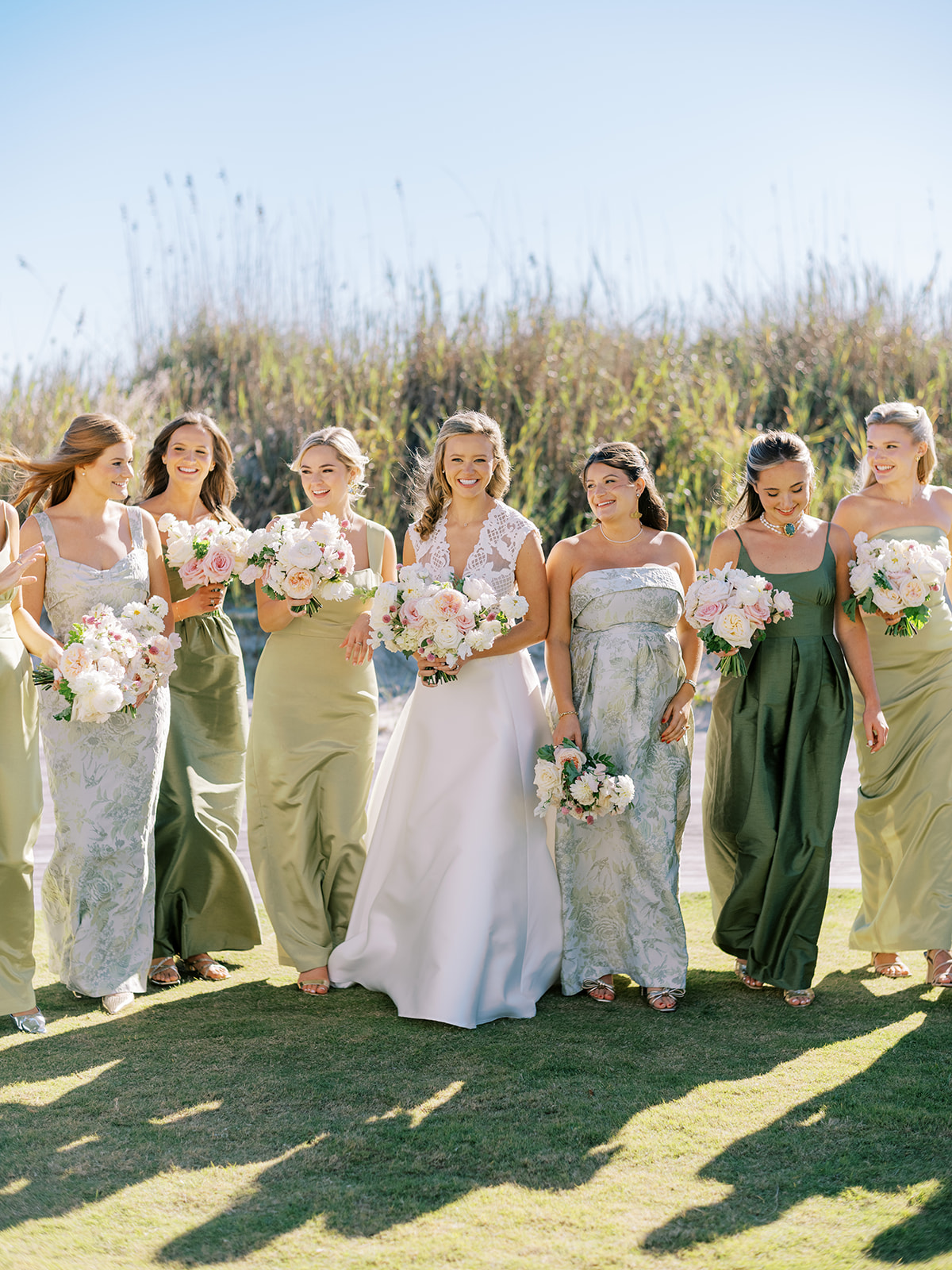 I absolutely adore the combination of Lula Kate bridesmaid dresses we curated for Shields’ bridesmaids: a mix of three green Lula Kate gowns in various necklines, giving each gown personality while creating a cohesive, fashion-forward, beautiful blend of dresses. For the ceremony and personal flowers, like the bouquets, we also chose to keep the floral design more muted and soft with a romantic palette of creams, whites, pale pink, and greenery so that the flowers wouldn’t compete or distract from the gowns, as well as to keep the ceremony flowers more classic, soft, and harmonious with the feel of the momentous moments unfolding. And then we really turned on the color with vibrant, juicy hot pinks, oranges, and chartreuse for their cocktail hour & reception!