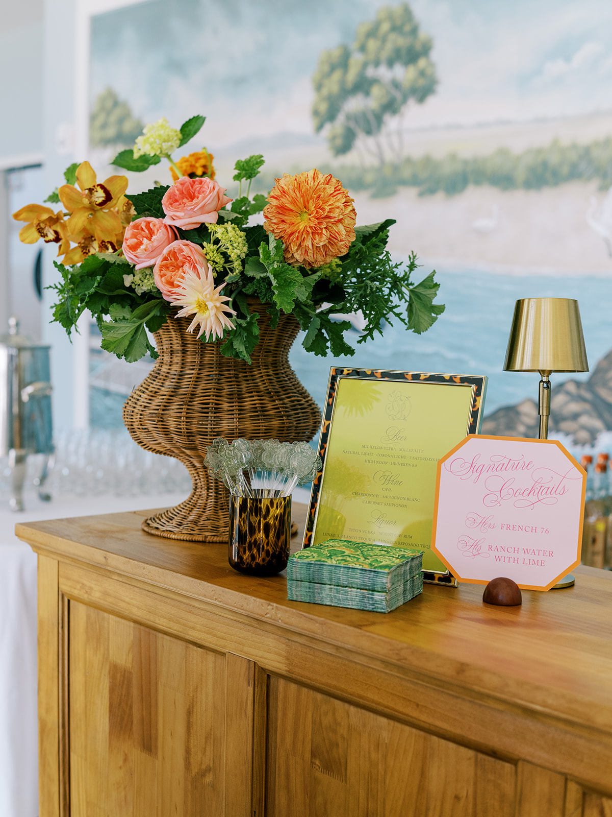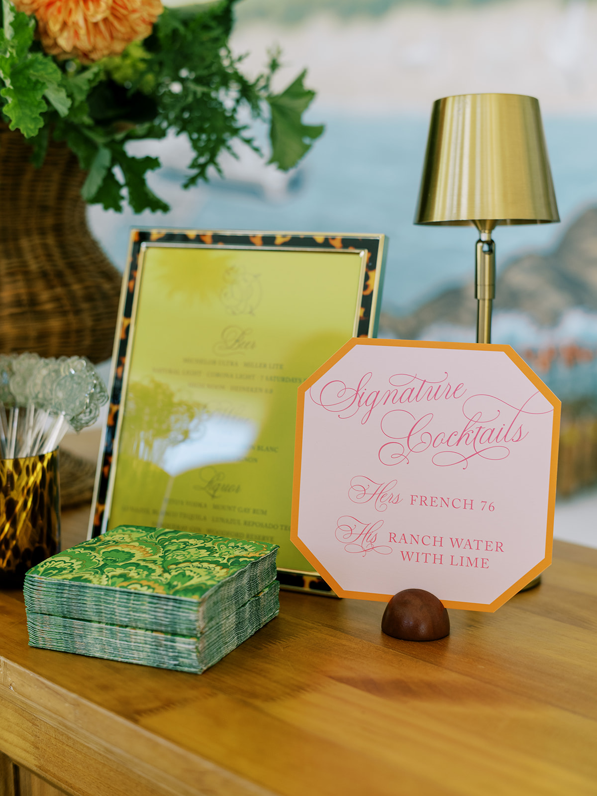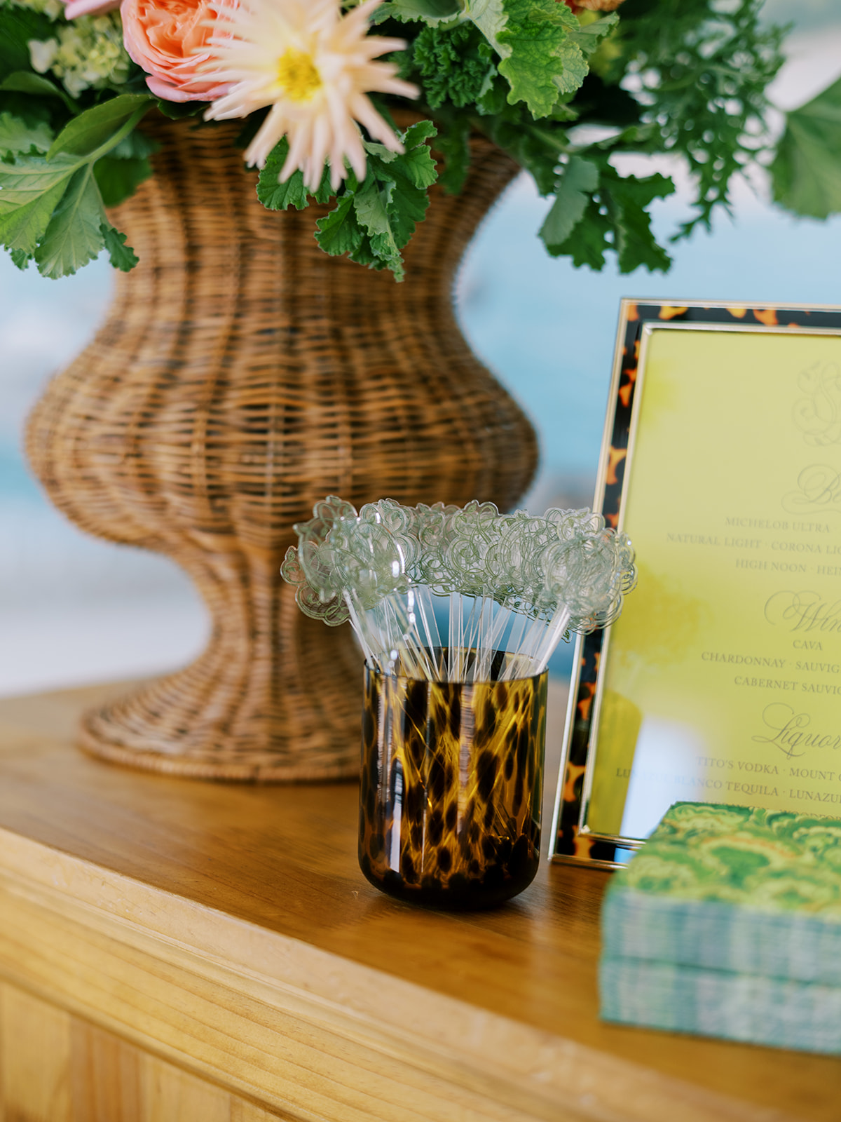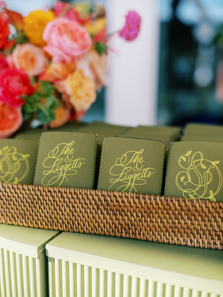 The Ocean Room featured a wooden double bar that highlighted both the beach-y Gracie wallpaper as a backdrop and the statement woven chandeliers, and we placed two statement colorful floral urns at each end of this long bar. The outdoor terrace featured a bar in the perfect shade of olive green with gold shelves as the bar back, which were outfitted with glassware, colorful floral arrangements, greenery, and tortoiseshell candles. All of the bars featured gorgeous chartreuse and olive green bar menus in tortoiseshell frames, signature cocktail menus in pink and orange (and in the same shape as the welcome party invitation in the invitation suite to carry this design element through), and then bespoke, colorful cocktail napkins, matchboxes, drink stirrers, and koozies that we lovingly designed with Surcie, all in rattan, tortoiseshell, and gold bowls, cups, or trays. We painstakingly designed and styled all of these details to be incredibly cohesive yet not too much of any one thing – the art of balance and restraint! I love the touch of that statement olive and chartreuse marbling and how it was woven throughout the design of the day.