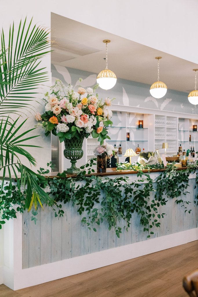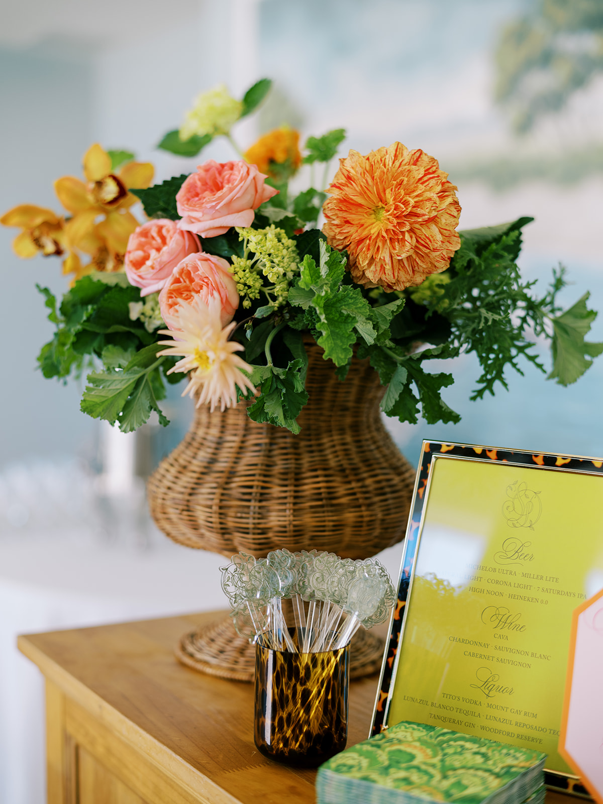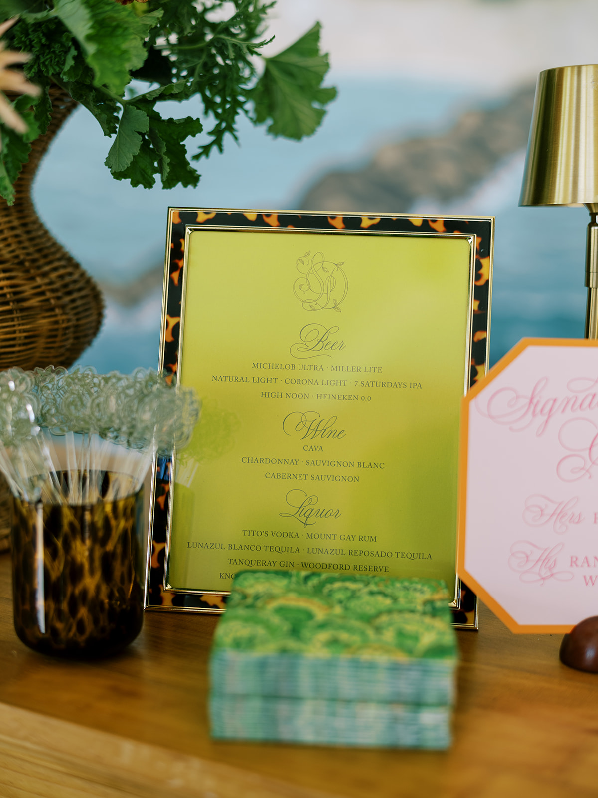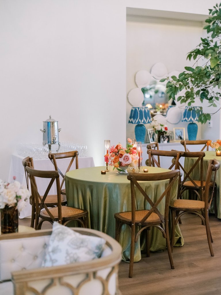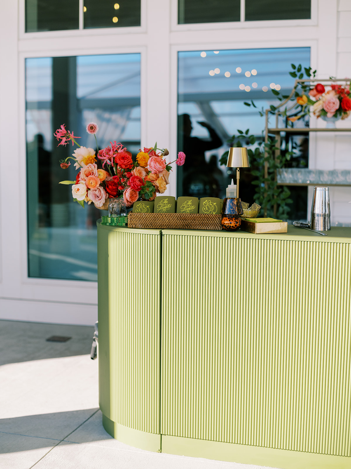 The Ocean Room featured a wooden double bar that highlighted both the beach-y Gracie wallpaper as a backdrop and the statement woven chandeliers, and we placed two statement colorful floral urns at each end of this long bar. The outdoor terrace featured a bar in the perfect shade of olive green with gold shelves as the bar back, which were outfitted with glassware, colorful floral arrangements, greenery, and tortoiseshell candles. All of the bars featured gorgeous chartreuse and olive green bar menus in tortoiseshell frames, signature cocktail menus in pink and orange (and in the same shape as the welcome party invitation in the invitation suite to carry this design element through), and then bespoke, colorful cocktail napkins, matchboxes, drink stirrers, and koozies that we lovingly designed with Surcie, all in rattan, tortoiseshell, and gold bowls, cups, or trays. We painstakingly designed and styled all of these details to be incredibly cohesive yet not too much of any one thing – the art of balance and restraint! I love the touch of that statement olive and chartreuse marbling and how it was woven throughout the design of the day.