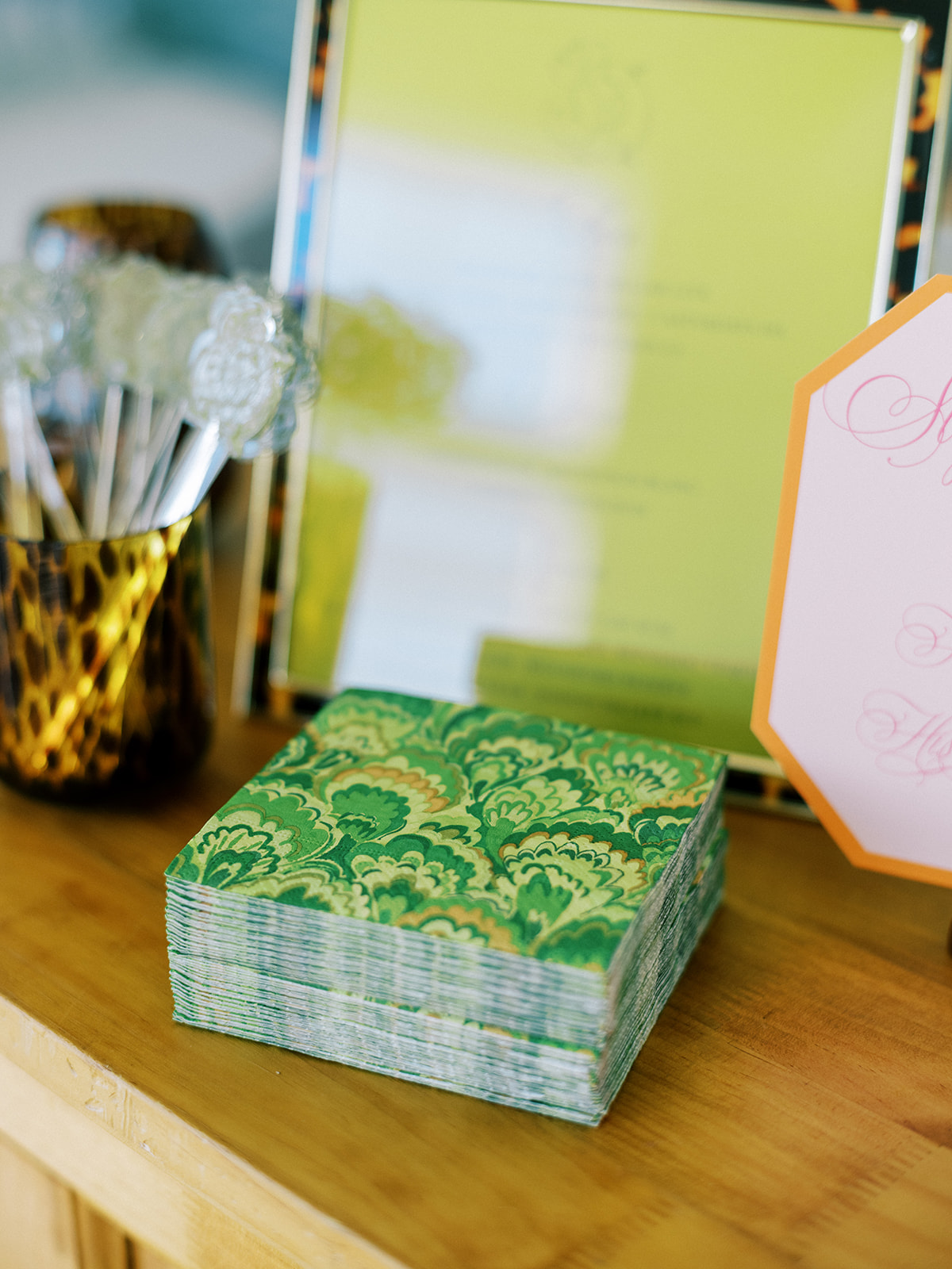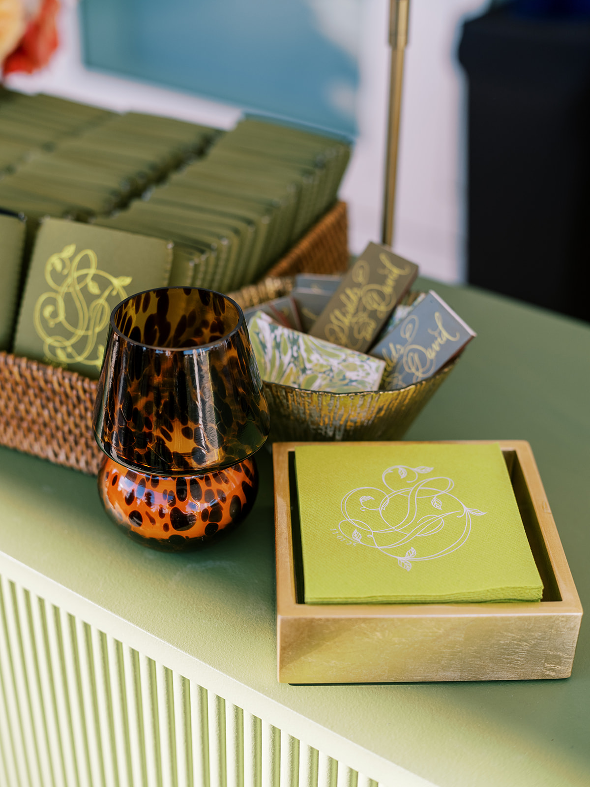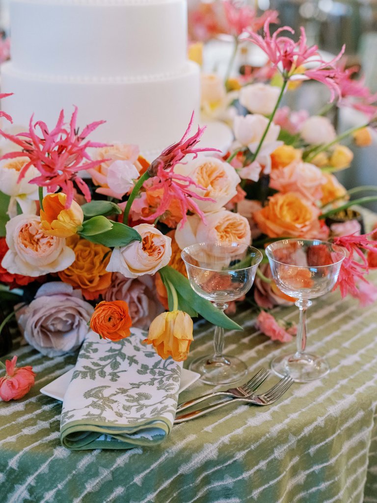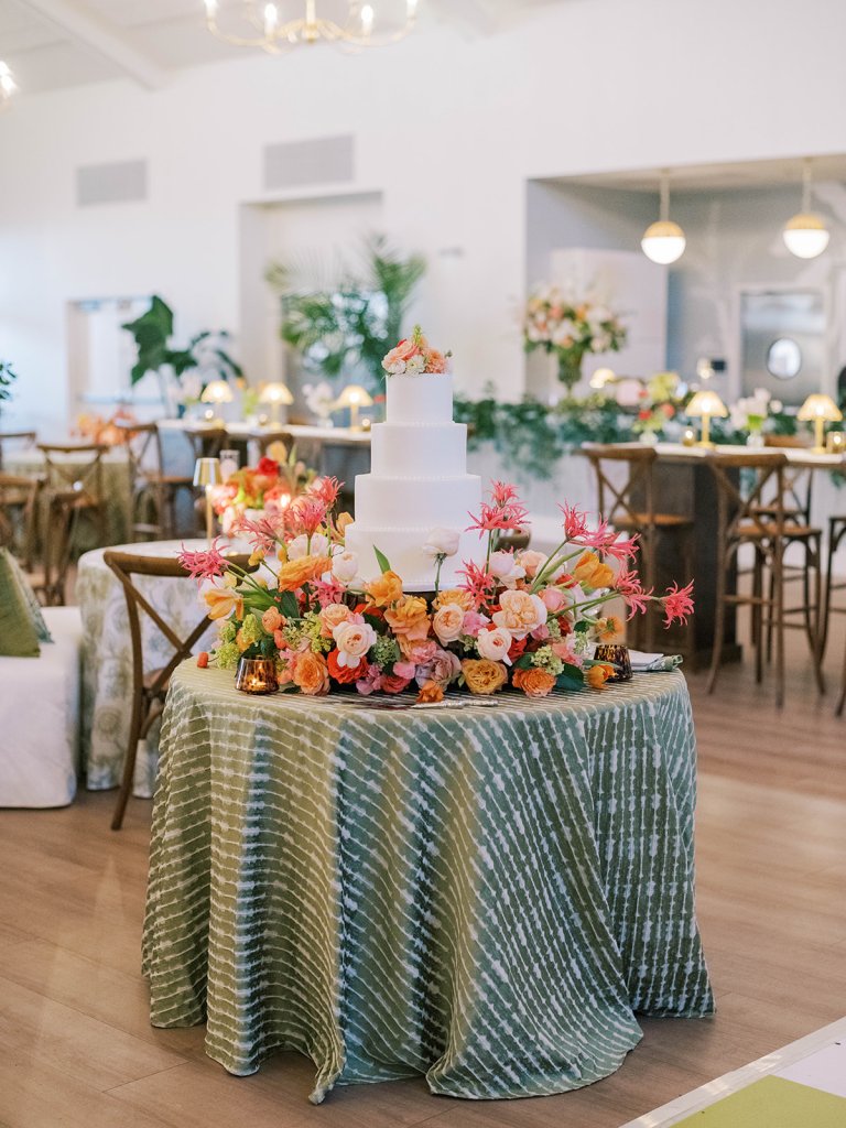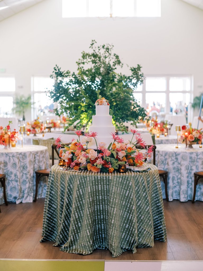 The Ocean Room featured a wooden double bar that highlighted both the beach-y Gracie wallpaper as a backdrop and the statement woven chandeliers, and we placed two statement colorful floral urns at each end of this long bar. The outdoor terrace featured a bar in the perfect shade of olive green with gold shelves as the bar back, which were outfitted with glassware, colorful floral arrangements, greenery, and tortoiseshell candles. All of the bars featured gorgeous chartreuse and olive green bar menus in tortoiseshell frames, signature cocktail menus in pink and orange (and in the same shape as the welcome party invitation in the invitation suite to carry this design element through), and then bespoke, colorful cocktail napkins, matchboxes, drink stirrers, and koozies that we lovingly designed with Surcie, all in rattan, tortoiseshell, and gold bowls, cups, or trays. We painstakingly designed and styled all of these details to be incredibly cohesive yet not too much of any one thing – the art of balance and restraint! I love the touch of that statement olive and chartreuse marbling and how it was woven throughout the design of the day.