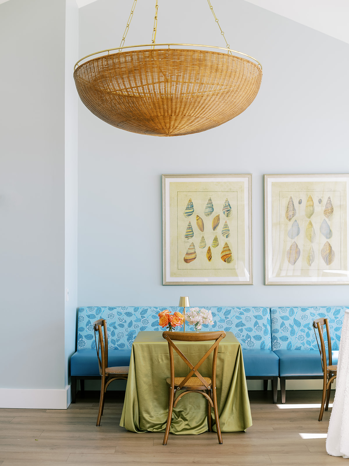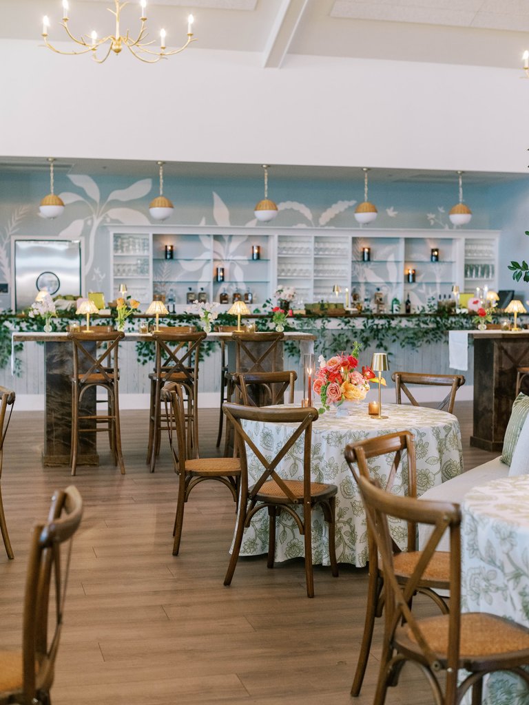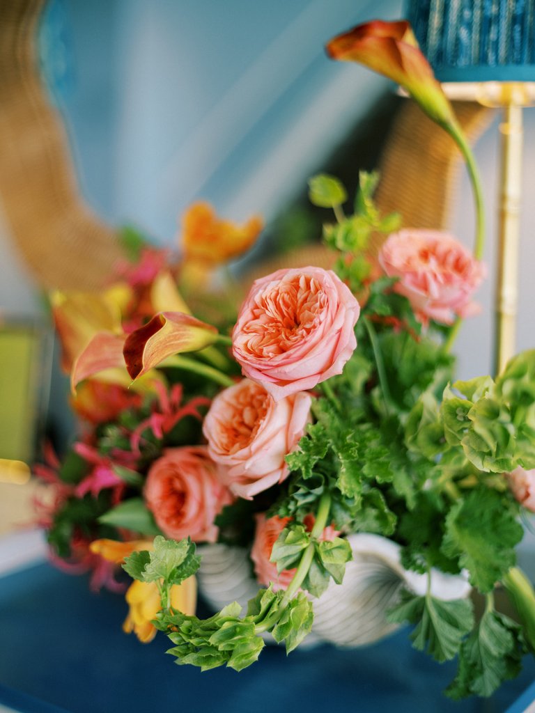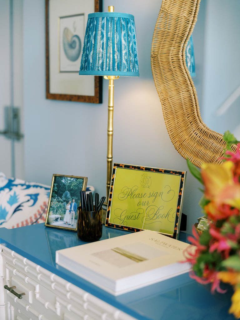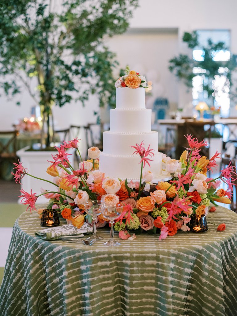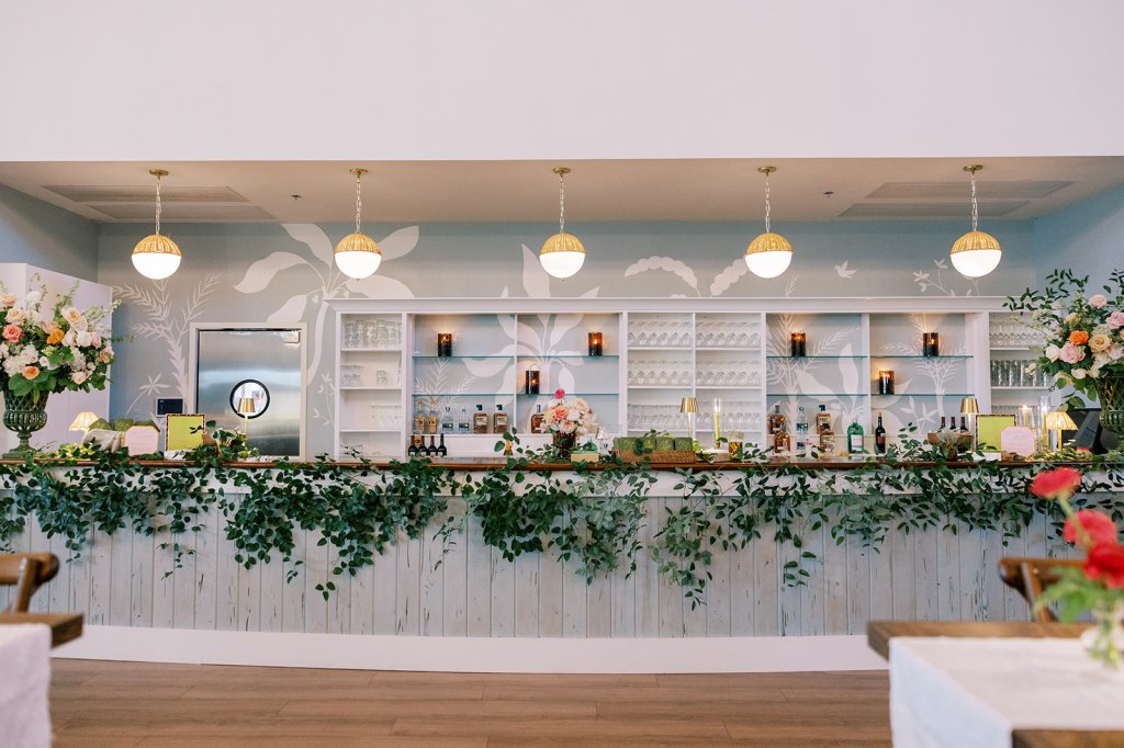 The Ocean Room featured a wooden double bar that highlighted both the beach-y Gracie wallpaper as a backdrop and the statement woven chandeliers, and we placed two statement colorful floral urns at each end of this long bar. The outdoor terrace featured a bar in the perfect shade of olive green with gold shelves as the bar back, which were outfitted with glassware, colorful floral arrangements, greenery, and tortoiseshell candles. All of the bars featured gorgeous chartreuse and olive green bar menus in tortoiseshell frames, signature cocktail menus in pink and orange (and in the same shape as the welcome party invitation in the invitation suite to carry this design element through), and then bespoke, colorful cocktail napkins, matchboxes, drink stirrers, and koozies that we lovingly designed with Surcie, all in rattan, tortoiseshell, and gold bowls, cups, or trays. We painstakingly designed and styled all of these details to be incredibly cohesive yet not too much of any one thing – the art of balance and restraint! I love the touch of that statement olive and chartreuse marbling and how it was woven throughout the design of the day.