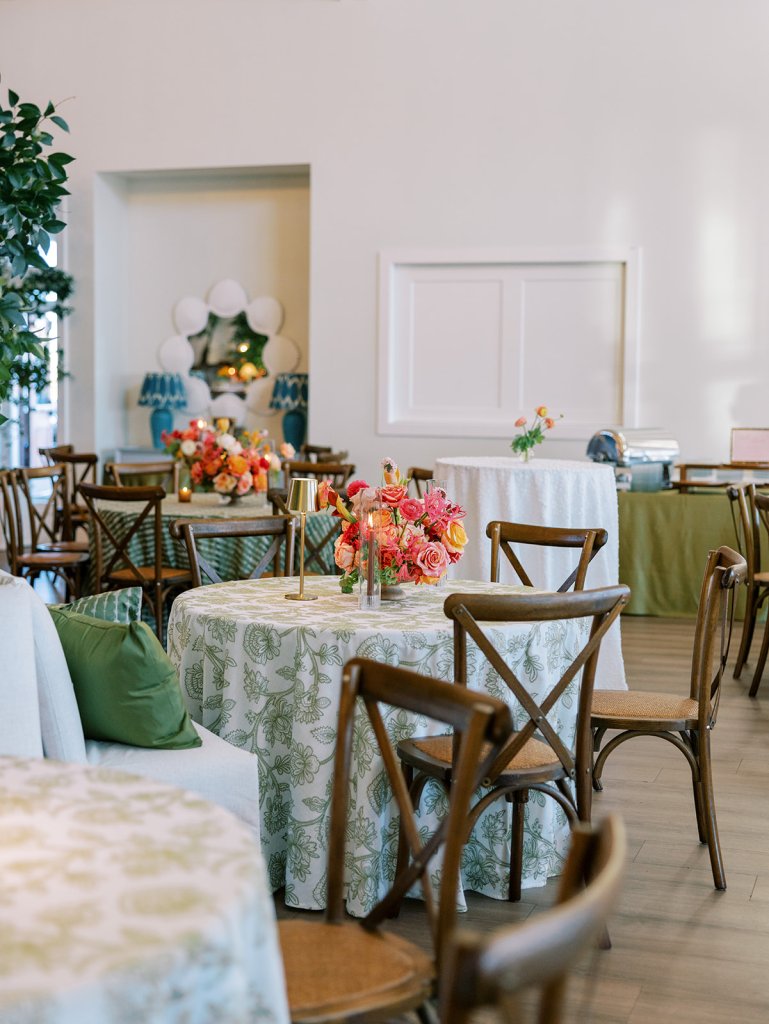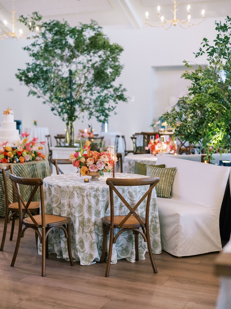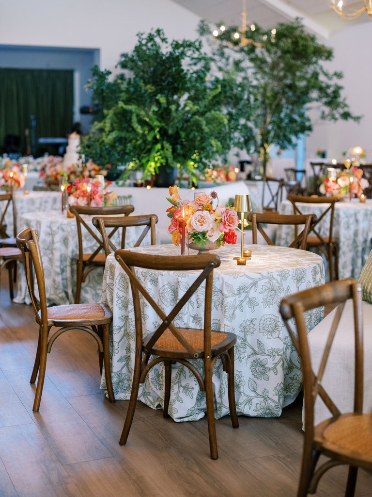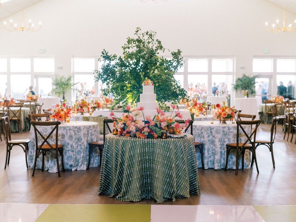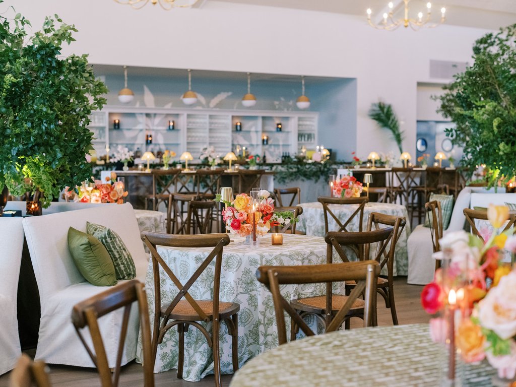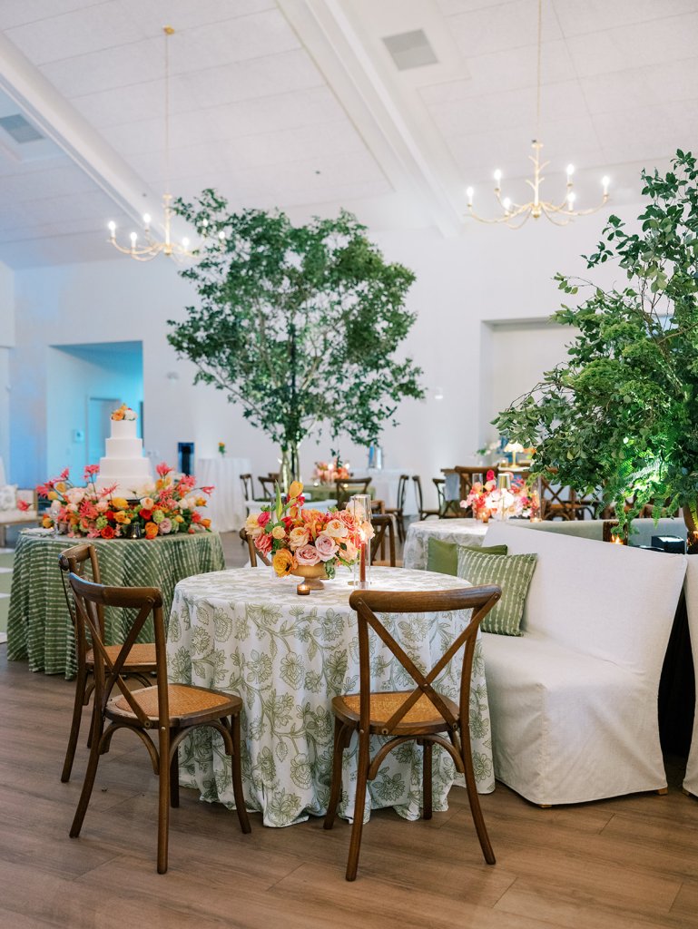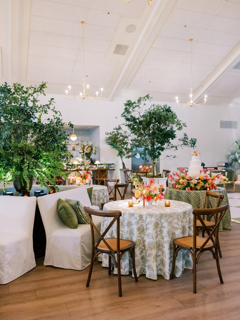 Welcome inside the Coral Bay ballroom for Shields and David’s reception! And what a celebration it was!! We transformed a very white, large ballroom – a pretty blank canvas – in such a colorful, striking, intentional way, and it was such a beautiful sight to behold!! With such tall ceilings and vast open space – and with a guest count inching toward 400 – I knew we need to fill this space very thoughtfully and with ample creative seating while also ensuring it was unique, functional, thoughtfully designed, and even more stunning than Shields had ever imagined! I started with a palette of vibrant chartreuse, verdant olive, & rich brown paired with striking pops of hot pink and orange for our color-loving, stylish bride, then tied in chic nods to the autumn season with rich textures, tortoiseshell, dark wood, and bold green marbling. Shields & David wanted their wedding to be timeless, classic, & elevated yet with a polished, fresh, & fun twist, and I think we did just that!