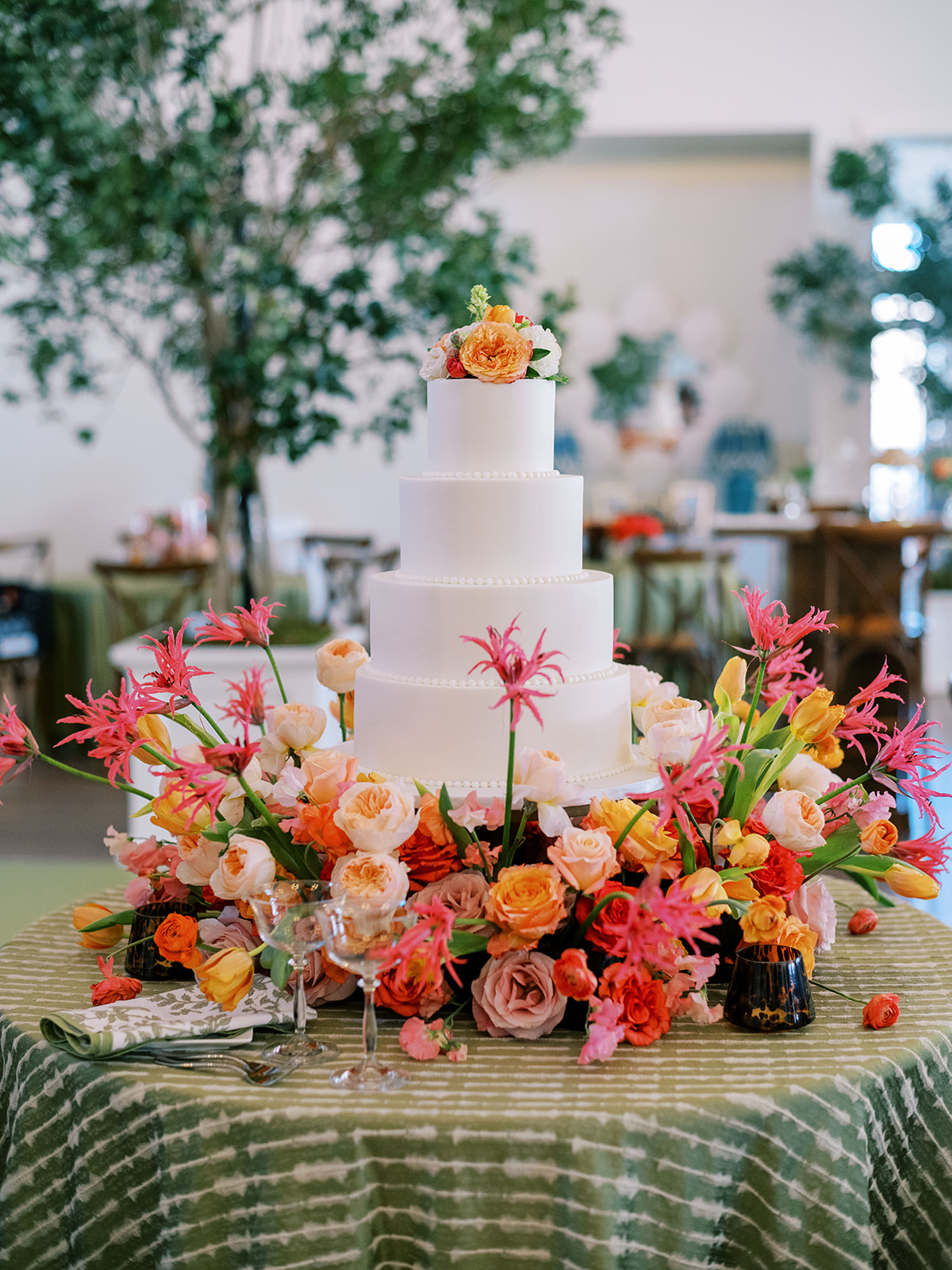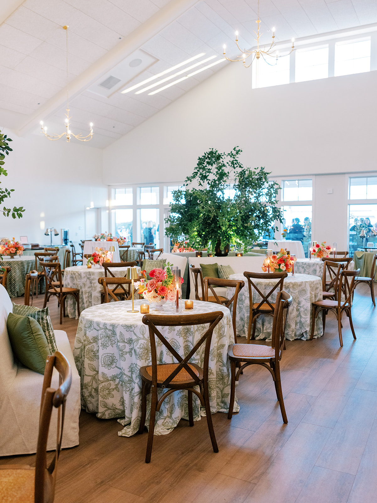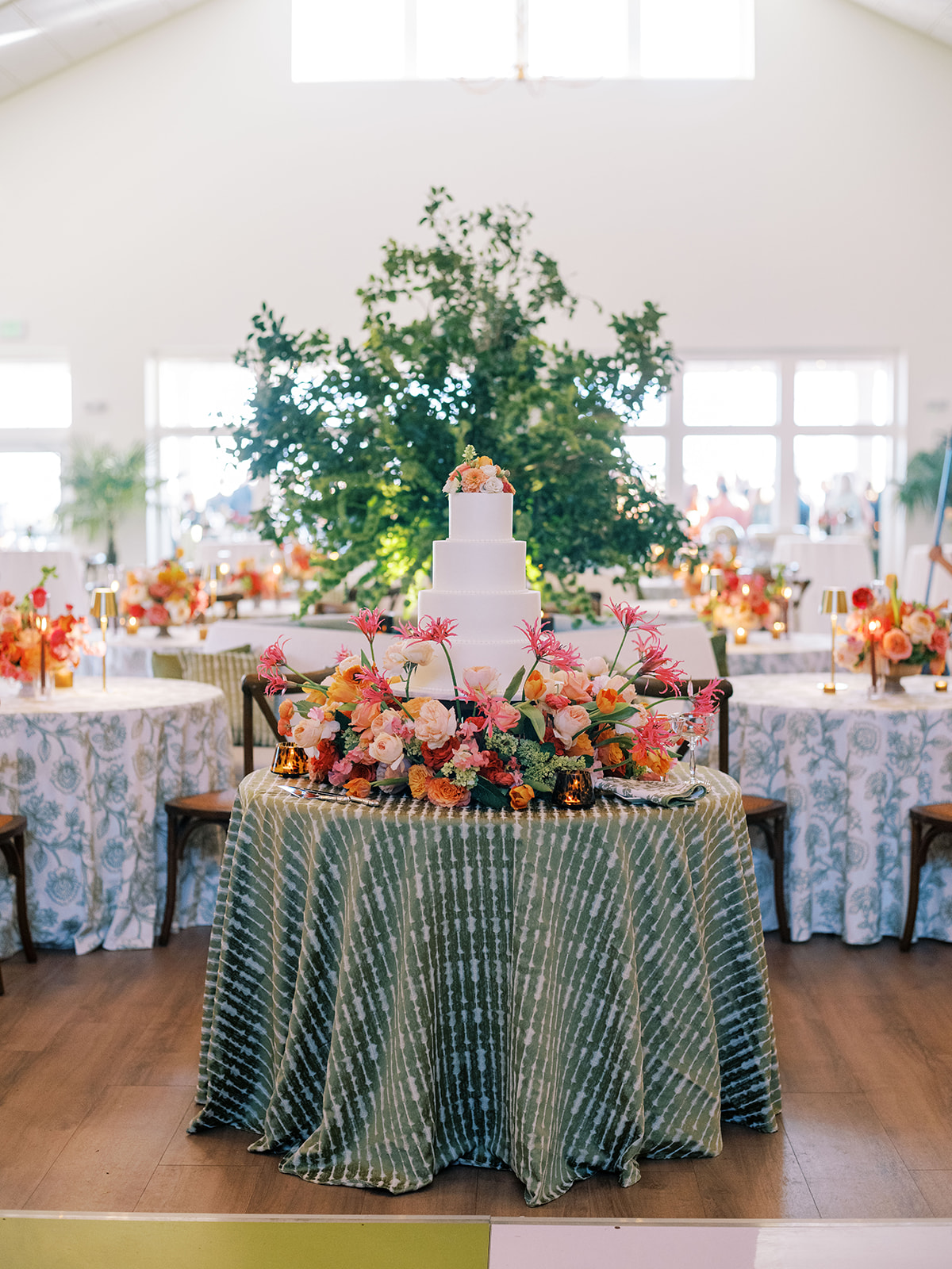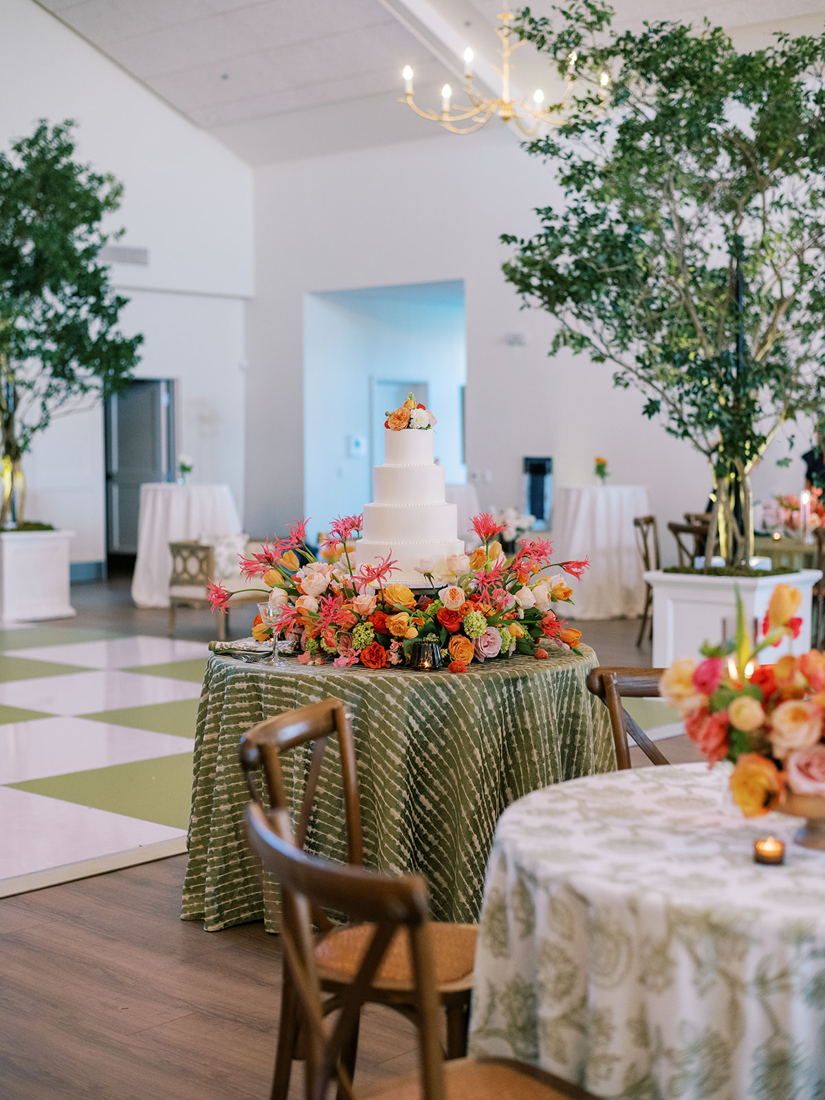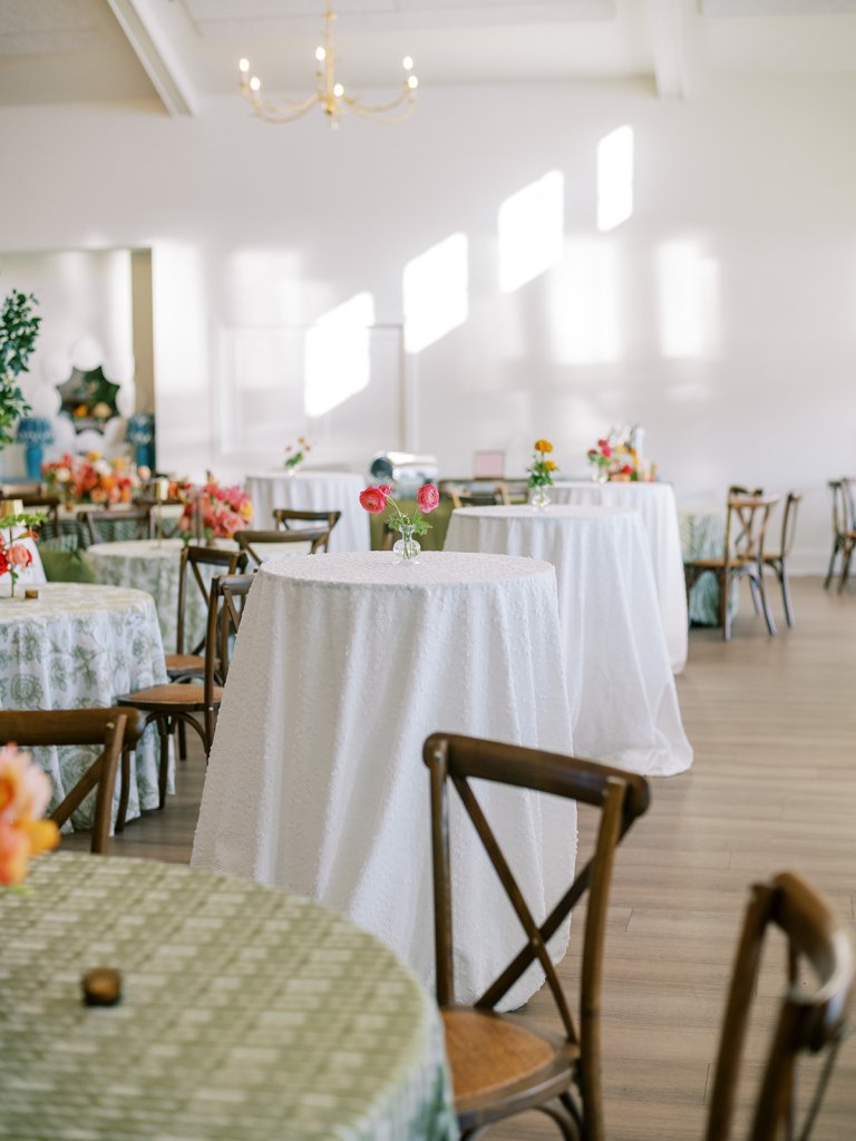 Welcome inside the Coral Bay ballroom for Shields and David’s reception! And what a celebration it was!! We transformed a very white, large ballroom – a pretty blank canvas – in such a colorful, striking, intentional way, and it was such a beautiful sight to behold!! With such tall ceilings and vast open space – and with a guest count inching toward 400 – I knew we need to fill this space very thoughtfully and with ample creative seating while also ensuring it was unique, functional, thoughtfully designed, and even more stunning than Shields had ever imagined! I started with a palette of vibrant chartreuse, verdant olive, & rich brown paired with striking pops of hot pink and orange for our color-loving, stylish bride, then tied in chic nods to the autumn season with rich textures, tortoiseshell, dark wood, and bold green marbling. Shields & David wanted their wedding to be timeless, classic, & elevated yet with a polished, fresh, & fun twist, and I think we did just that!