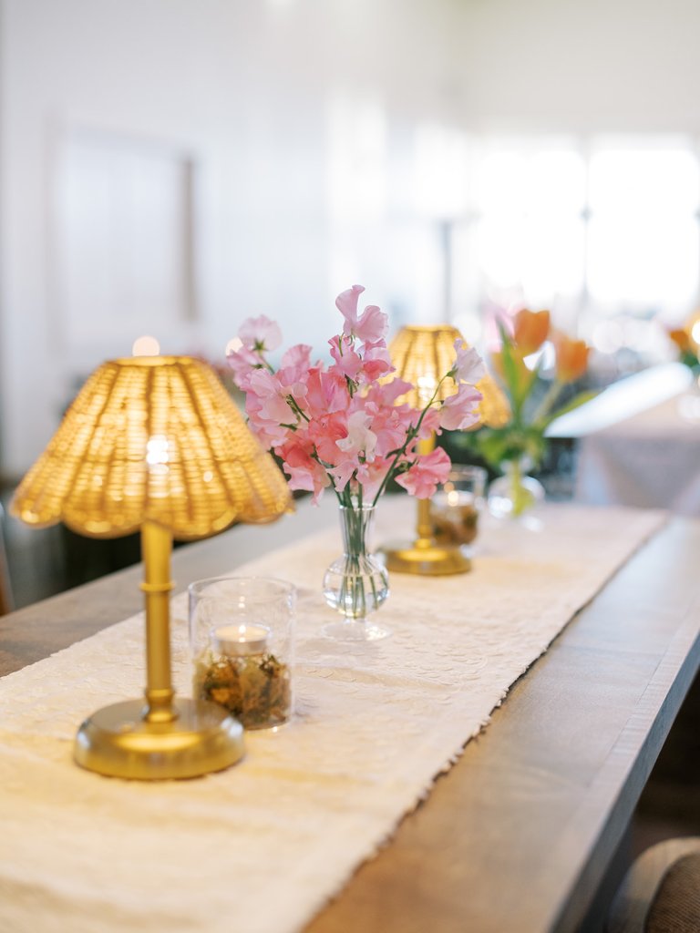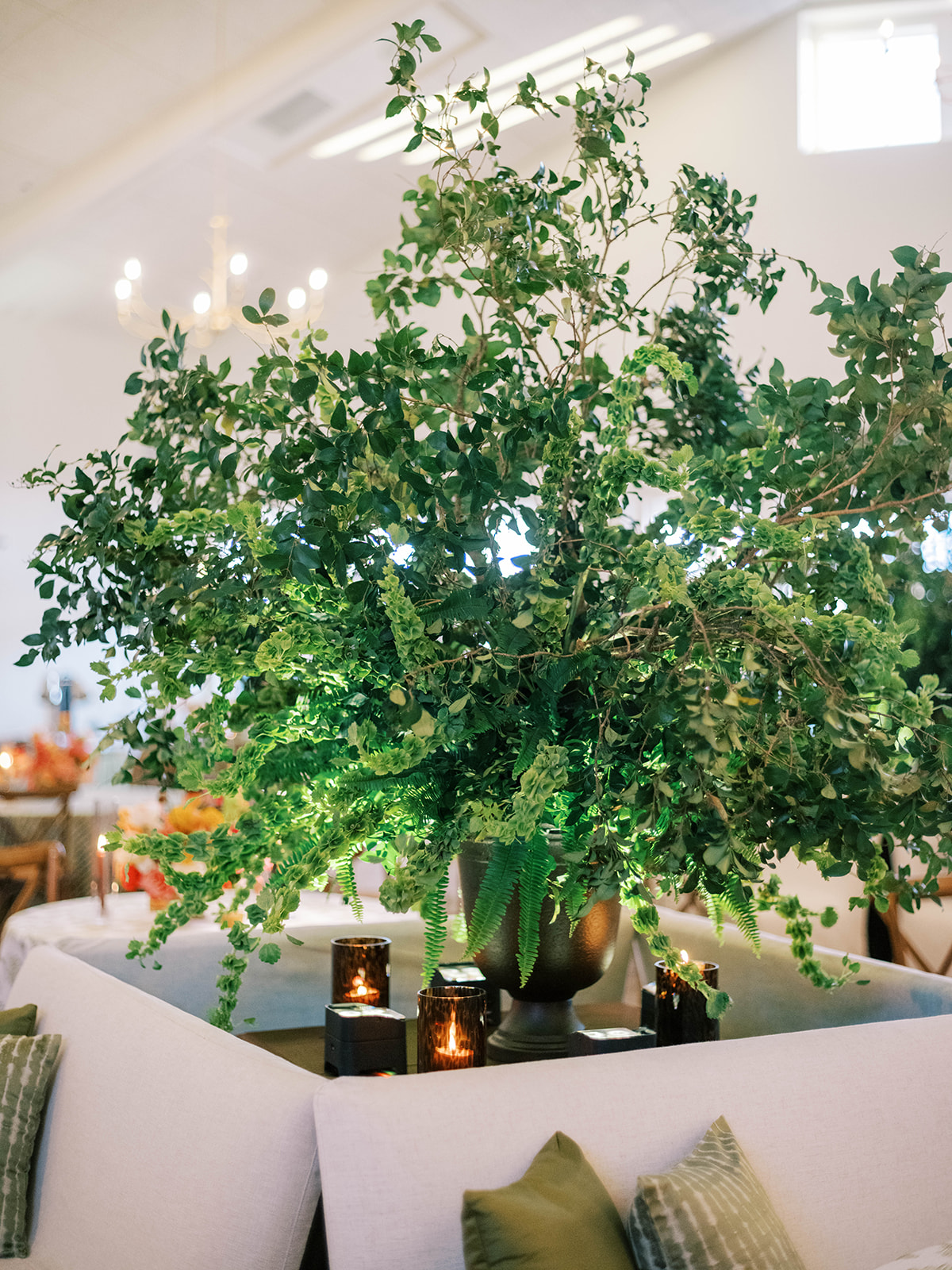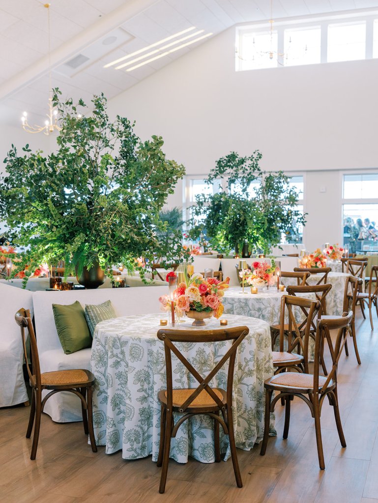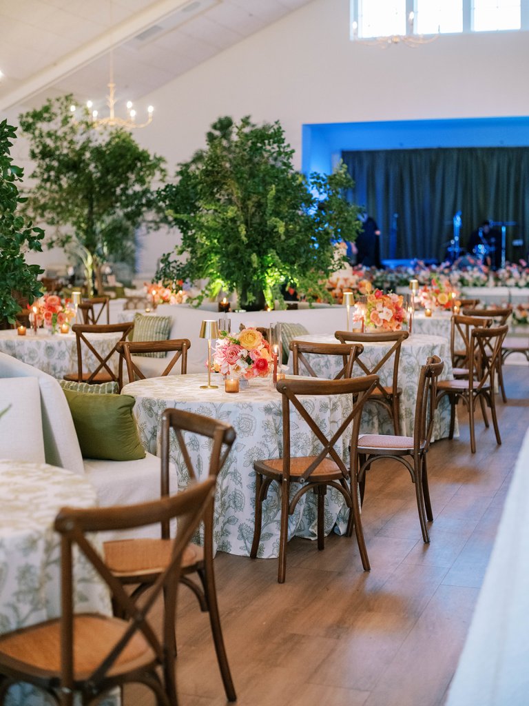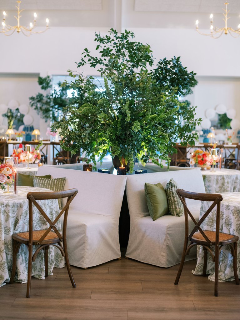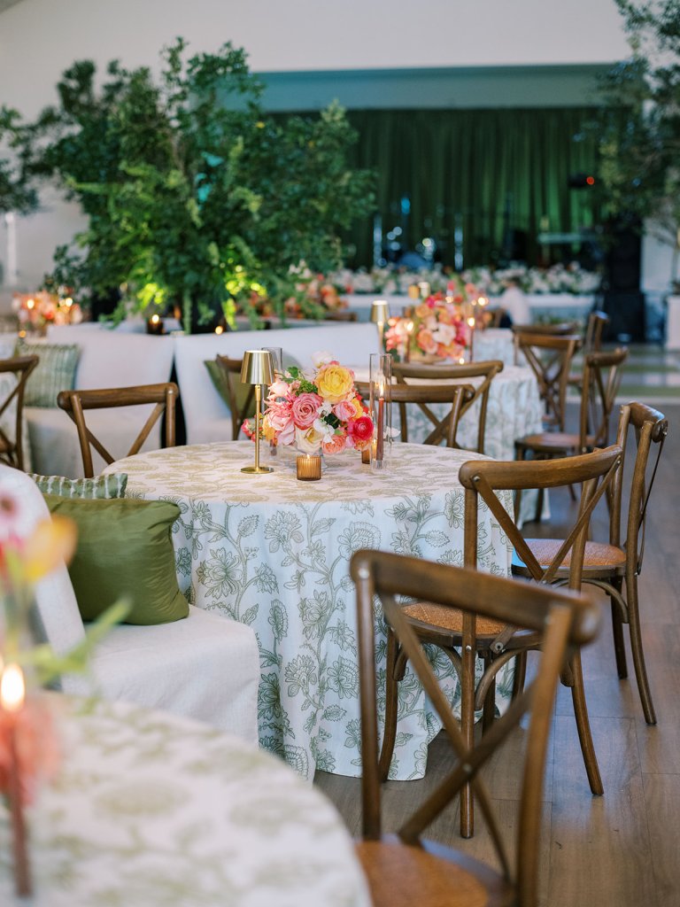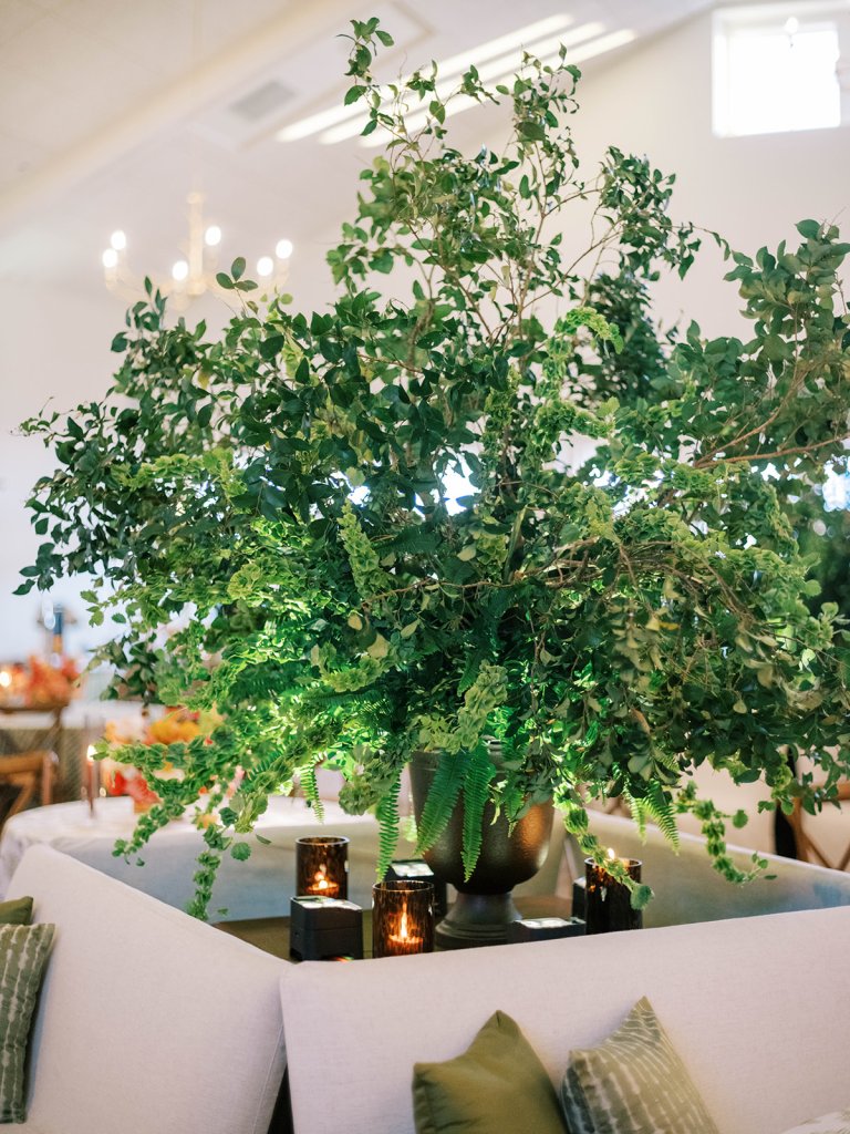 Shields loves soft, romantic lighting (as do I!), and there was a big focus on candlelight, tabletop lamps, and pin lighting in the potted trees and urns. We brought in so many olive green and brown taper candles, loads of thoughtfully placed rattan table lamps and mini gold table lamps, and enlisted the best lighting team from High Performance Lighting to ensure those statement trees stood out once the sun went down and dancing really ramped up.