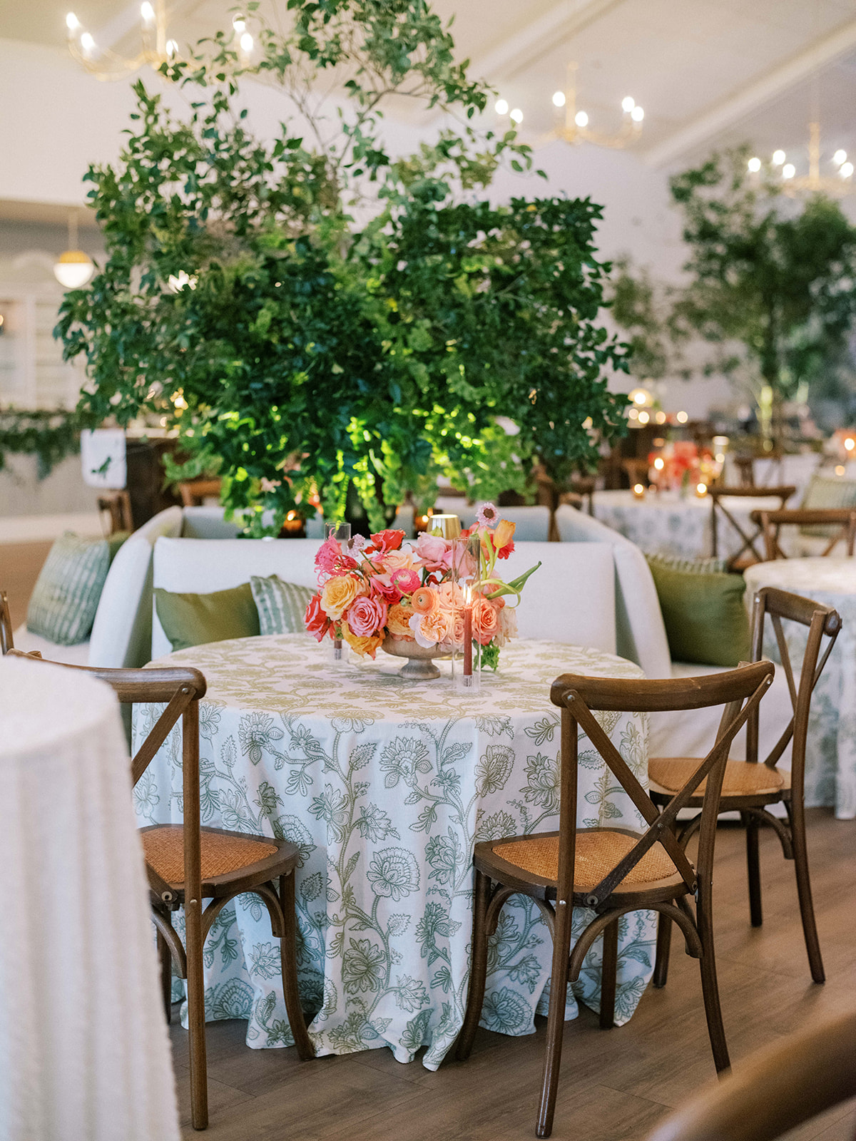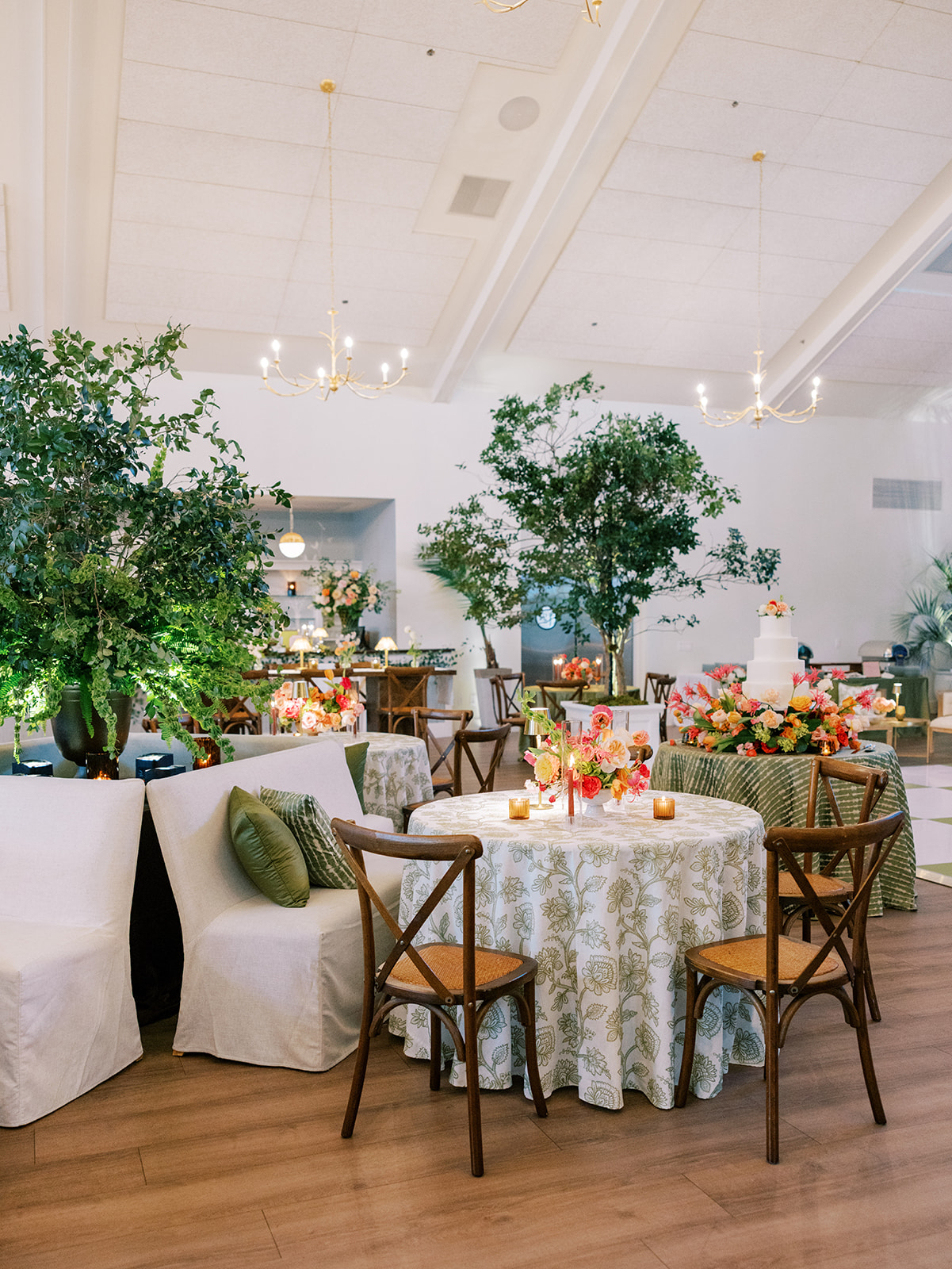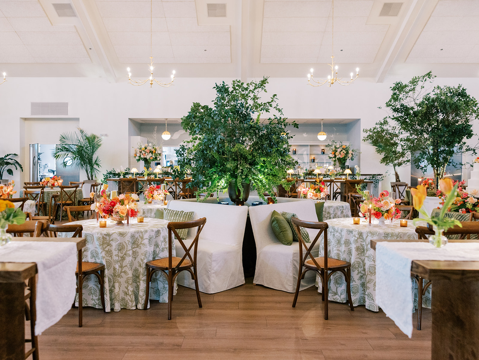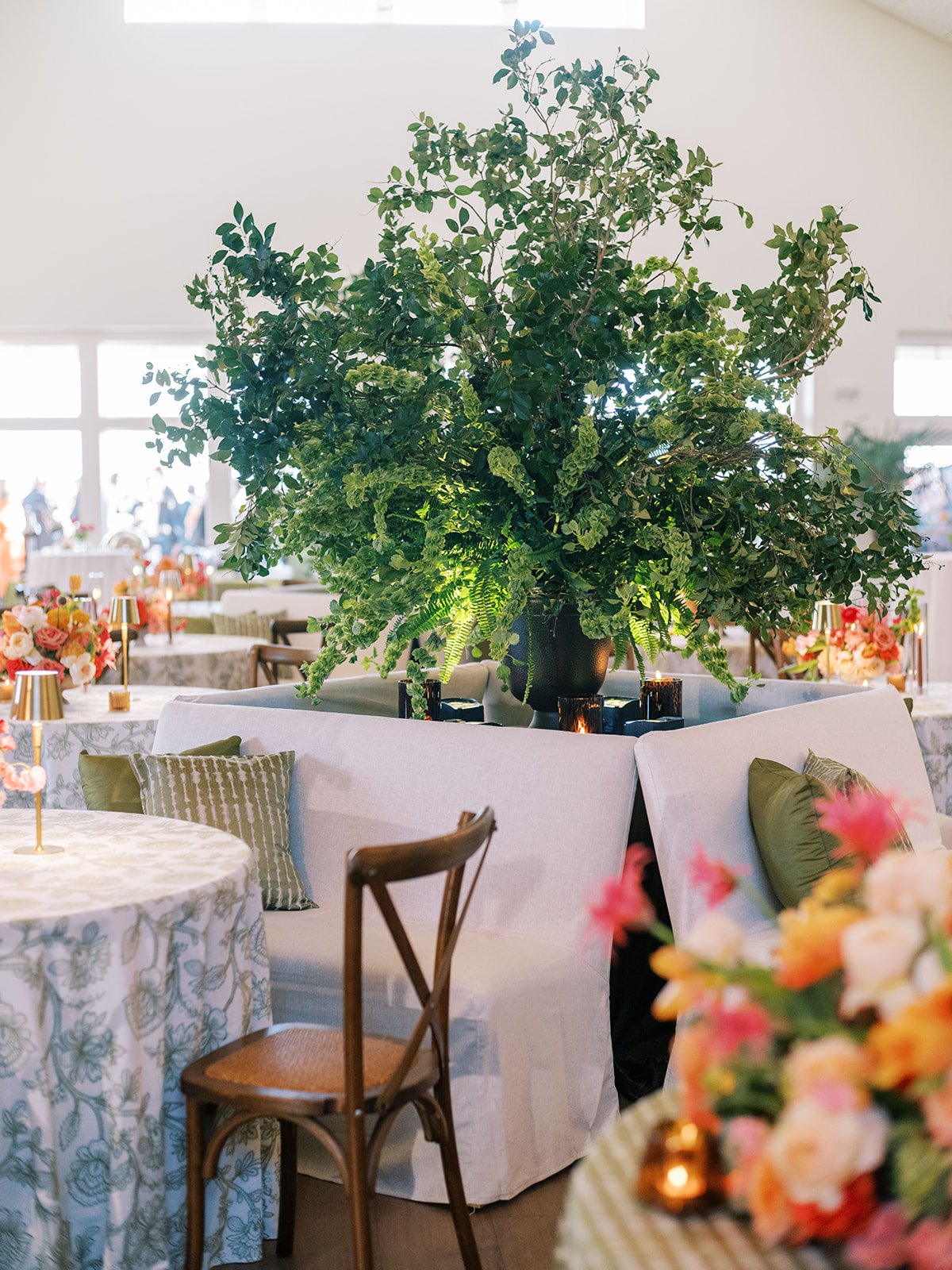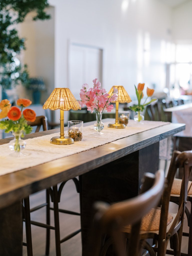 Shields loves soft, romantic lighting (as do I!), and there was a big focus on candlelight, tabletop lamps, and pin lighting in the potted trees and urns. We brought in so many olive green and brown taper candles, loads of thoughtfully placed rattan table lamps and mini gold table lamps, and enlisted the best lighting team from High Performance Lighting to ensure those statement trees stood out once the sun went down and dancing really ramped up.