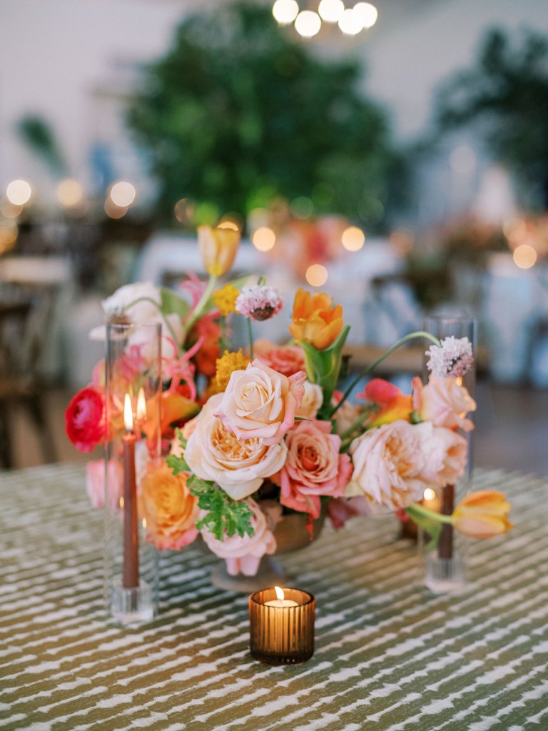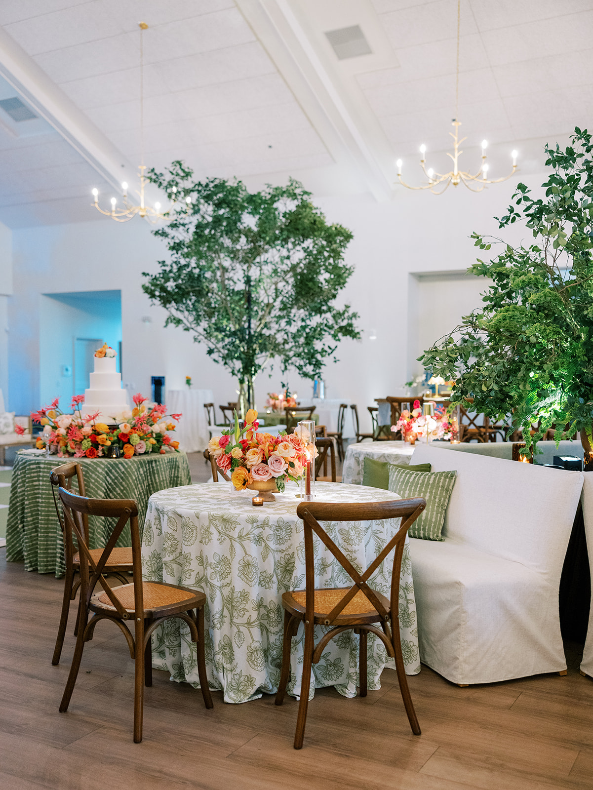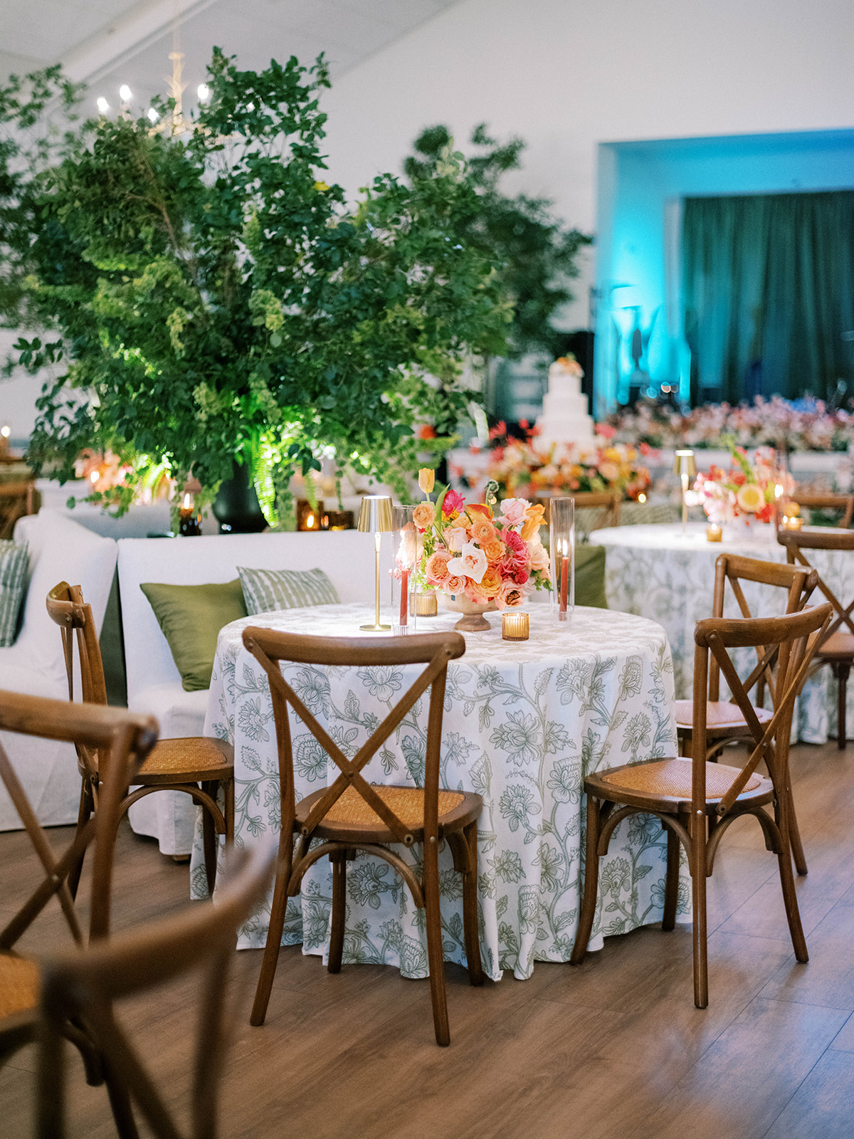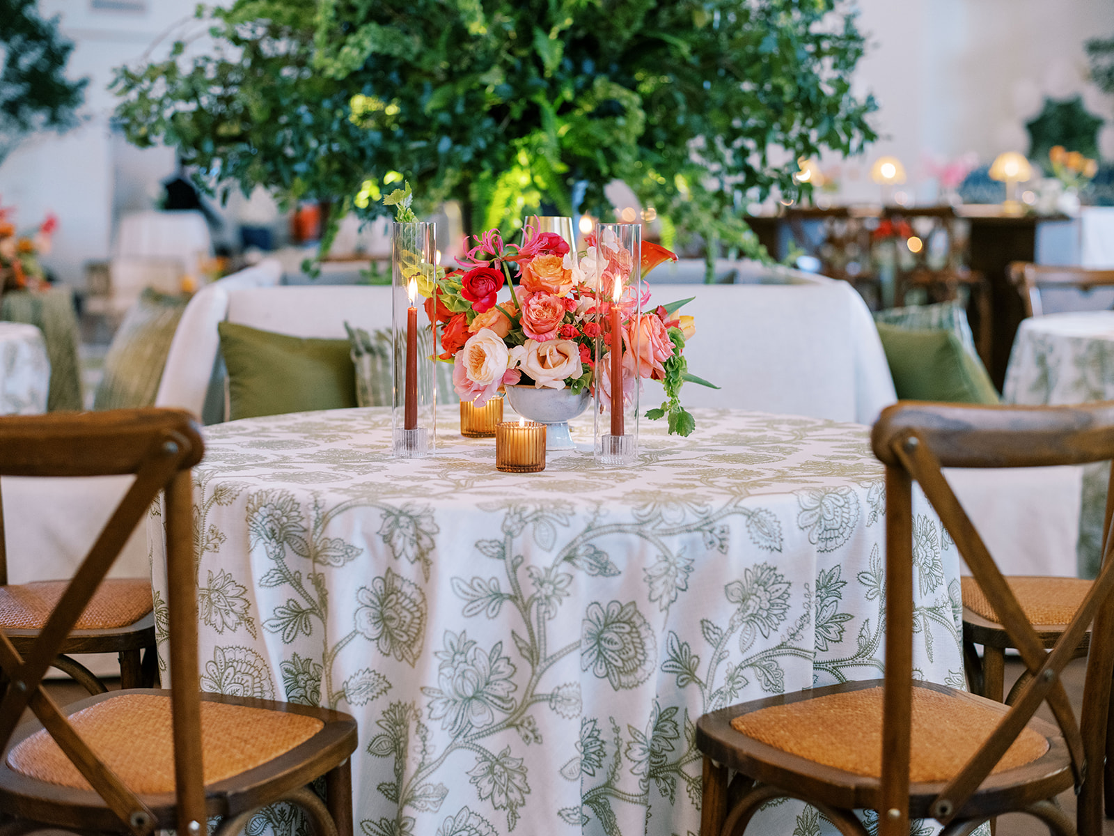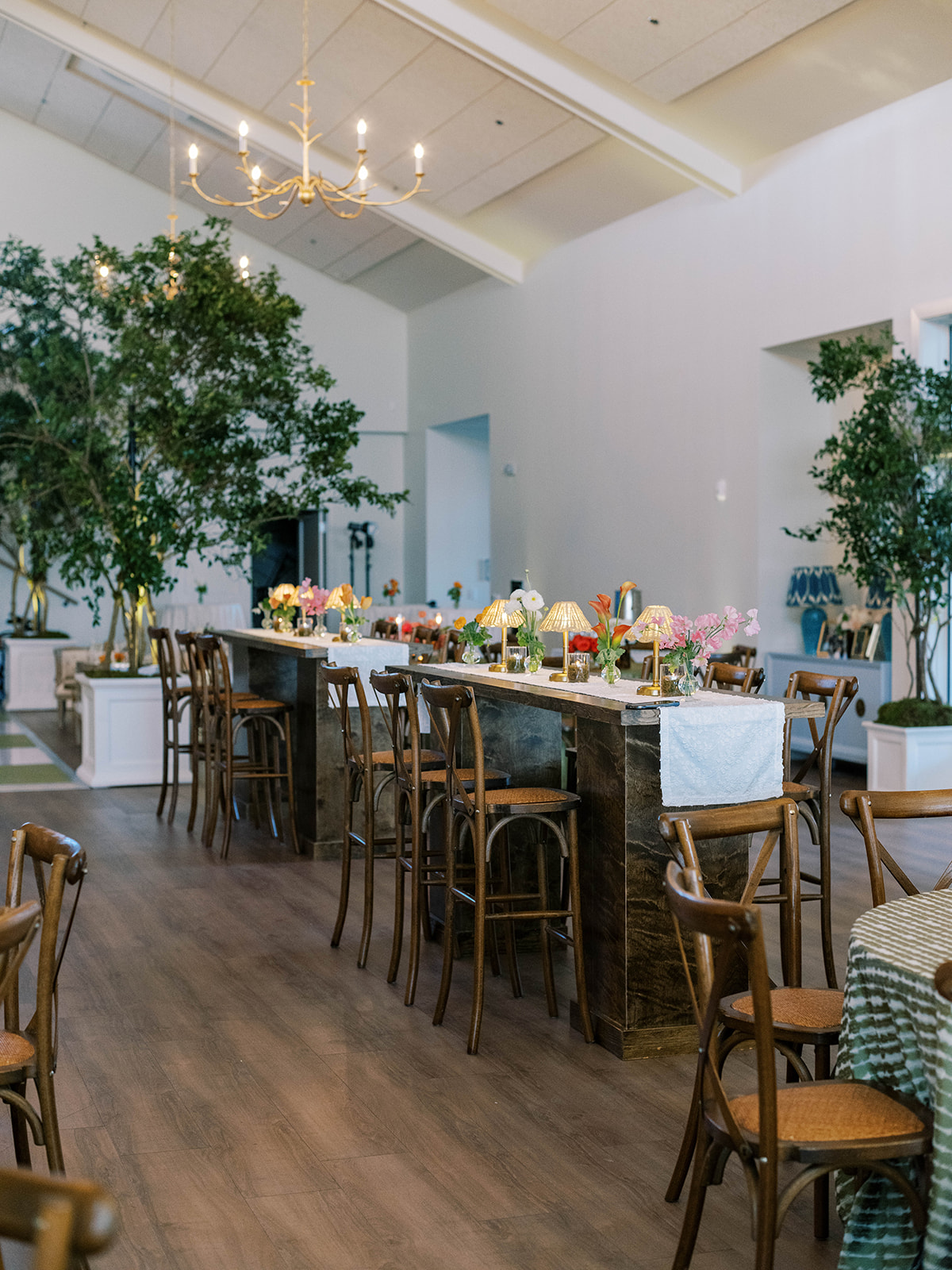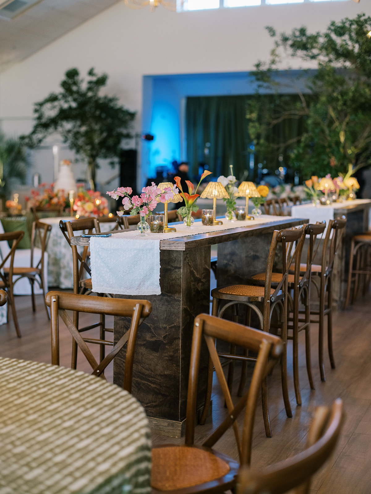 Shields loves soft, romantic lighting (as do I!), and there was a big focus on candlelight, tabletop lamps, and pin lighting in the potted trees and urns. We brought in so many olive green and brown taper candles, loads of thoughtfully placed rattan table lamps and mini gold table lamps, and enlisted the best lighting team from High Performance Lighting to ensure those statement trees stood out once the sun went down and dancing really ramped up.
