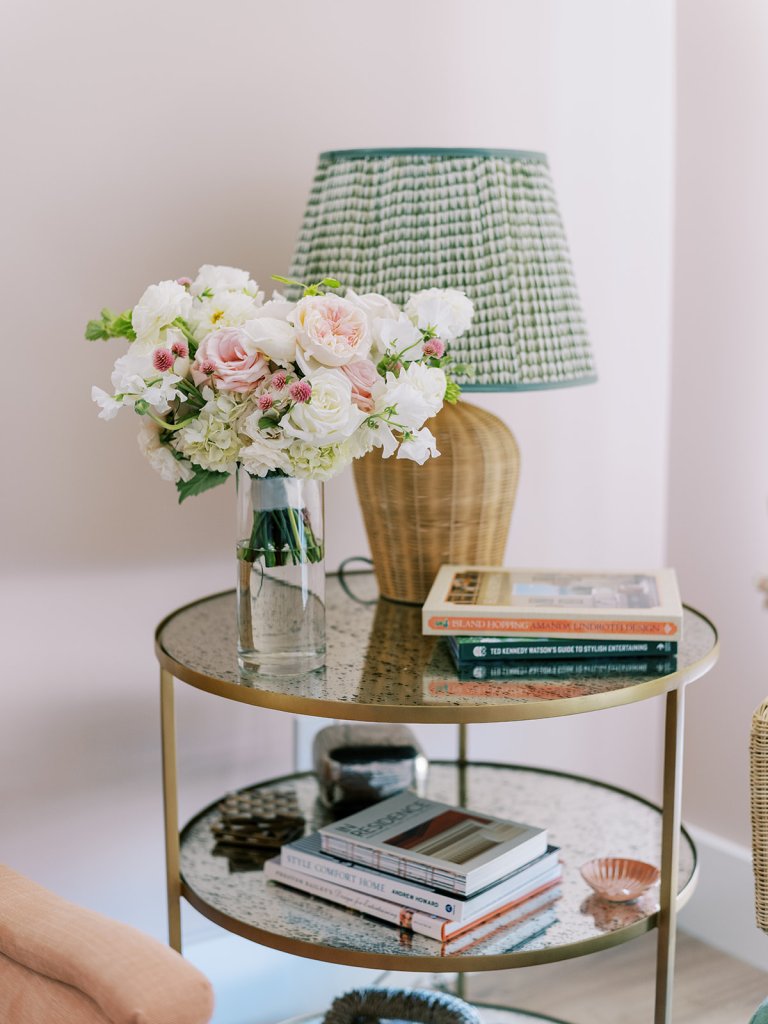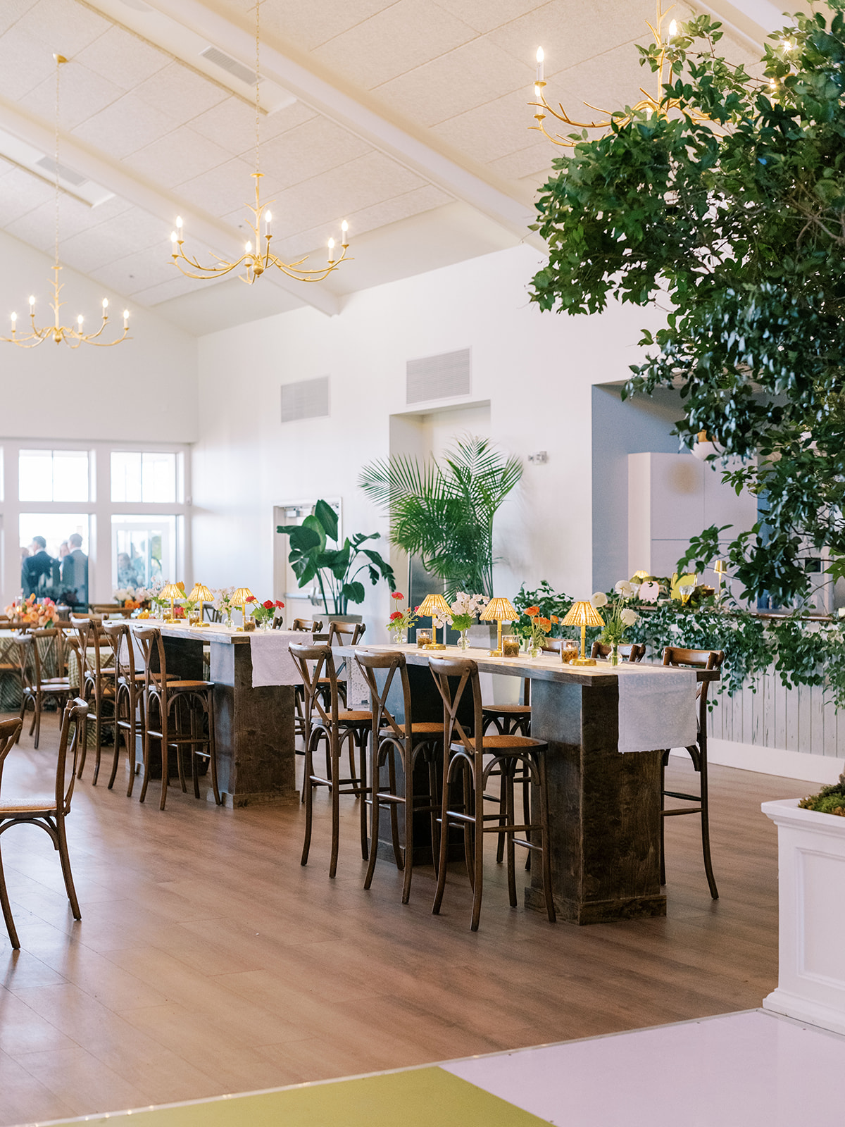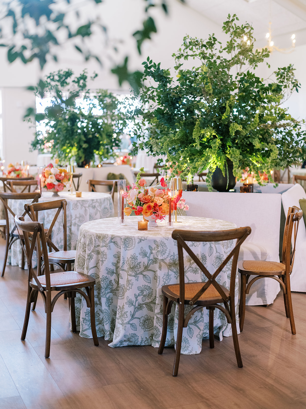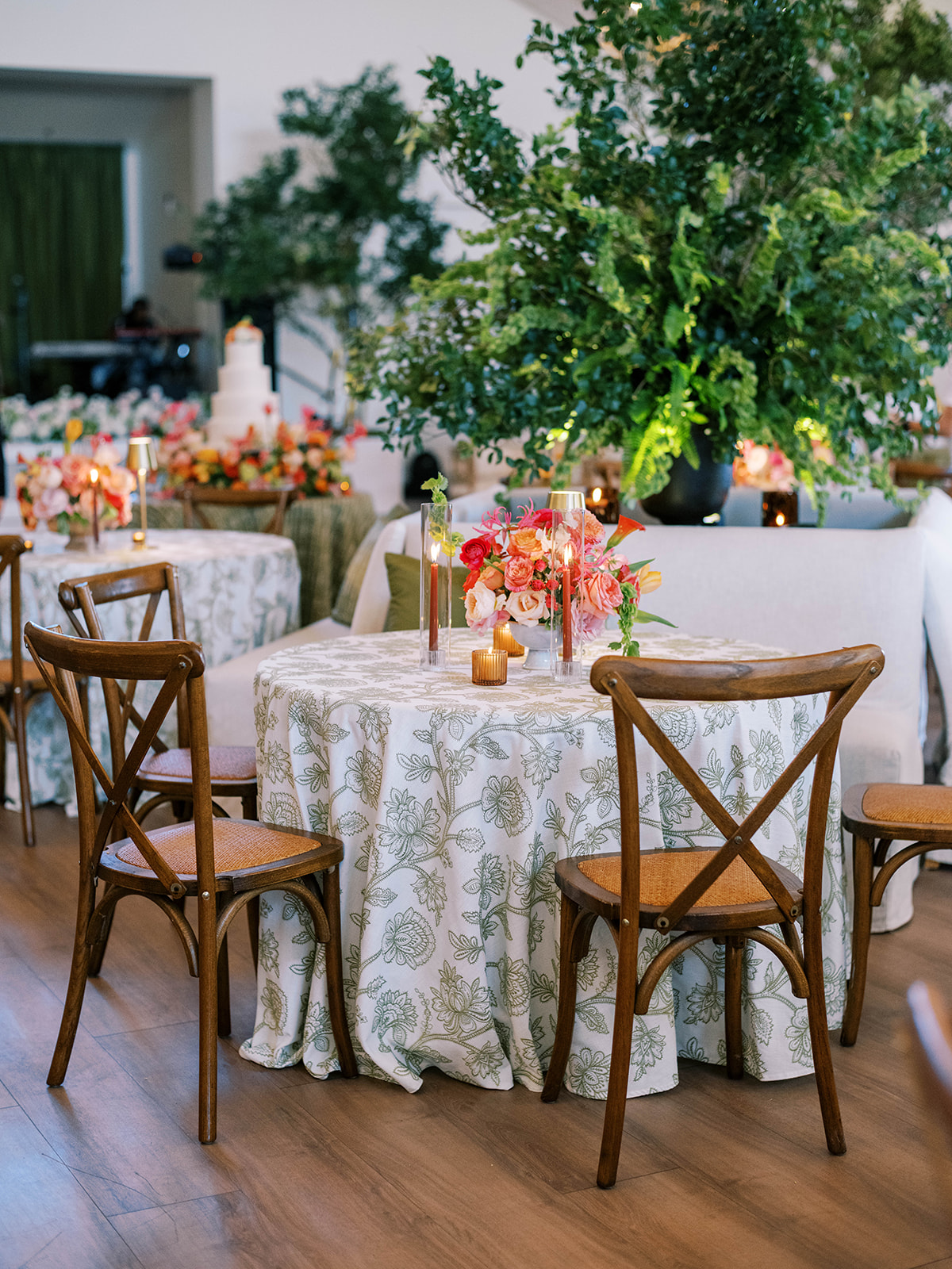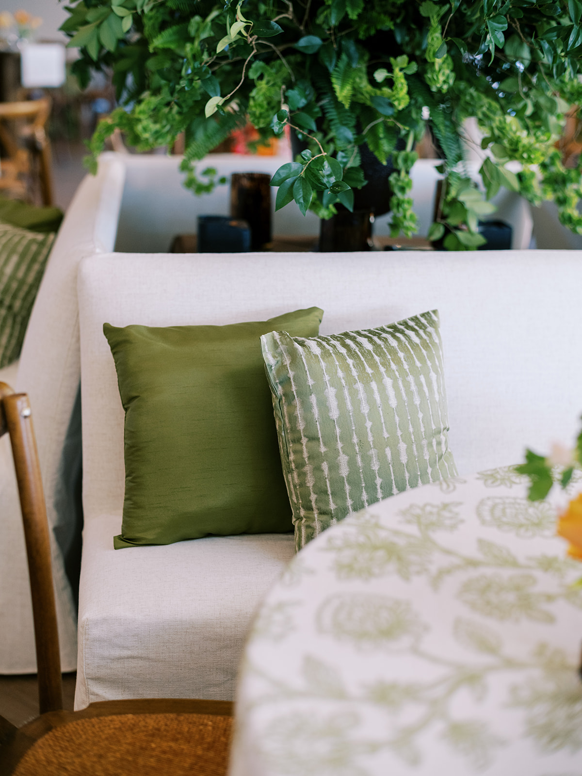 Shields loves soft, romantic lighting (as do I!), and there was a big focus on candlelight, tabletop lamps, and pin lighting in the potted trees and urns. We brought in so many olive green and brown taper candles, loads of thoughtfully placed rattan table lamps and mini gold table lamps, and enlisted the best lighting team from High Performance Lighting to ensure those statement trees stood out once the sun went down and dancing really ramped up.