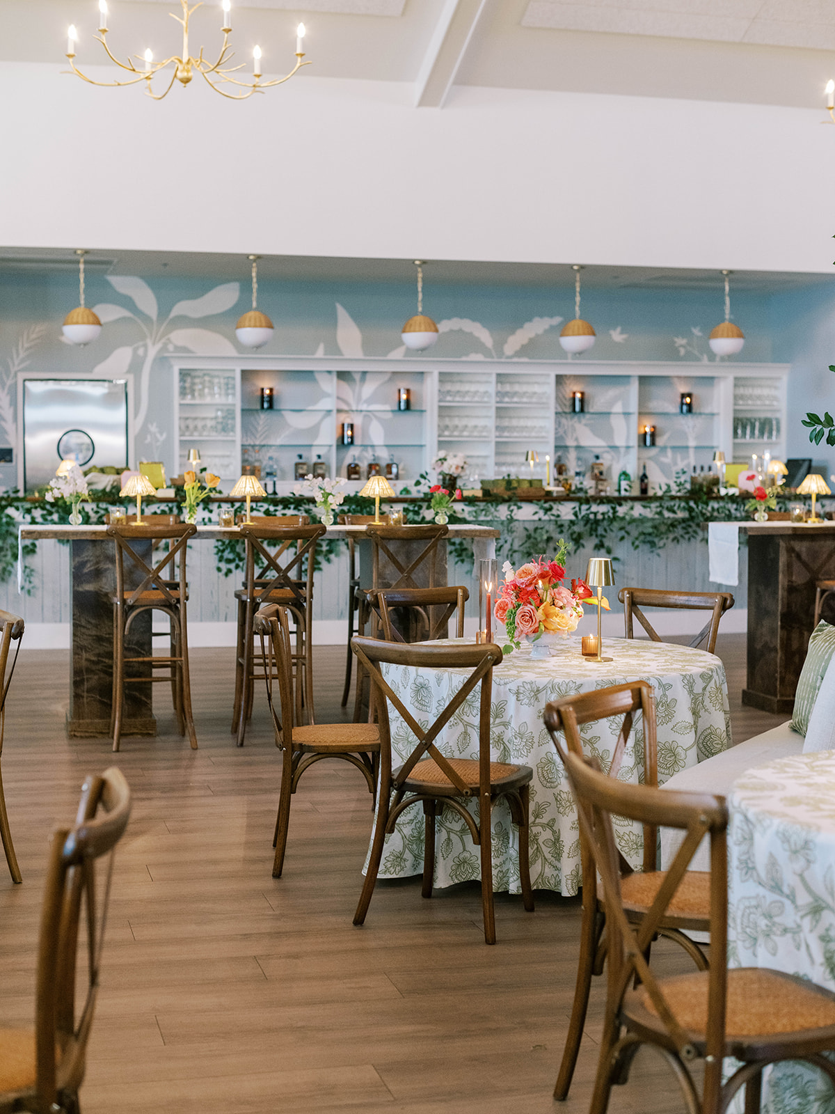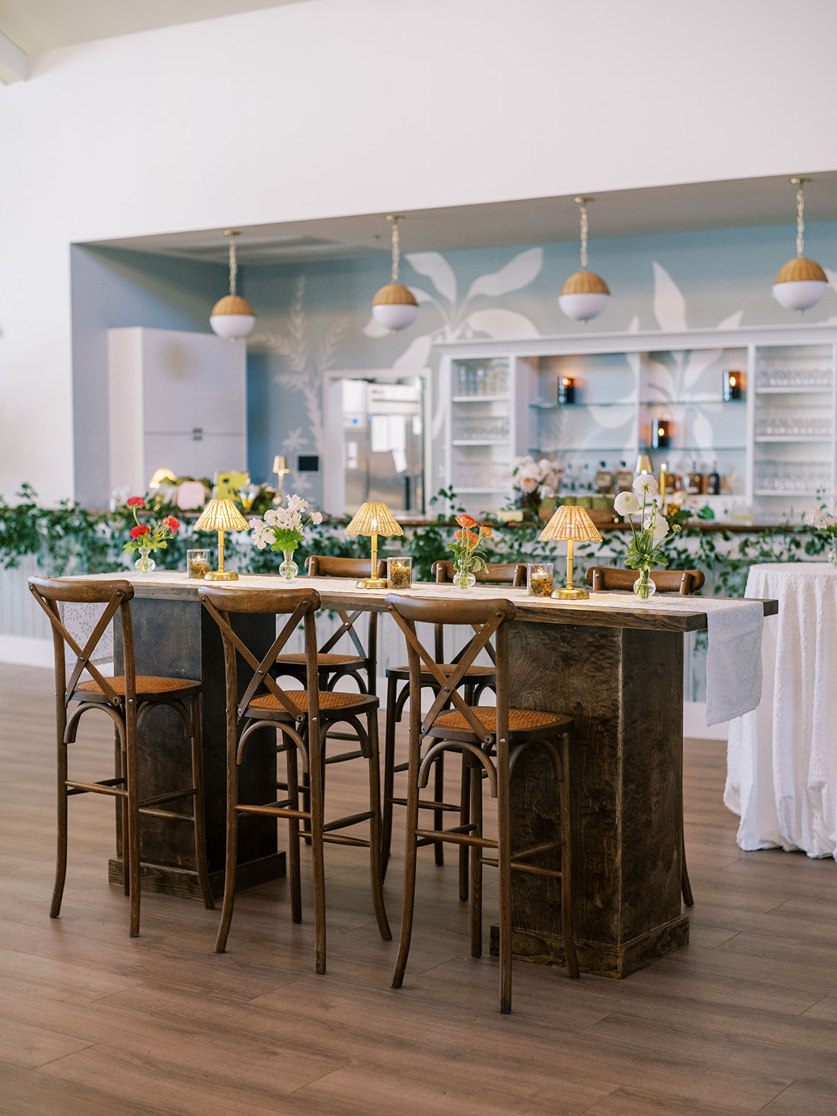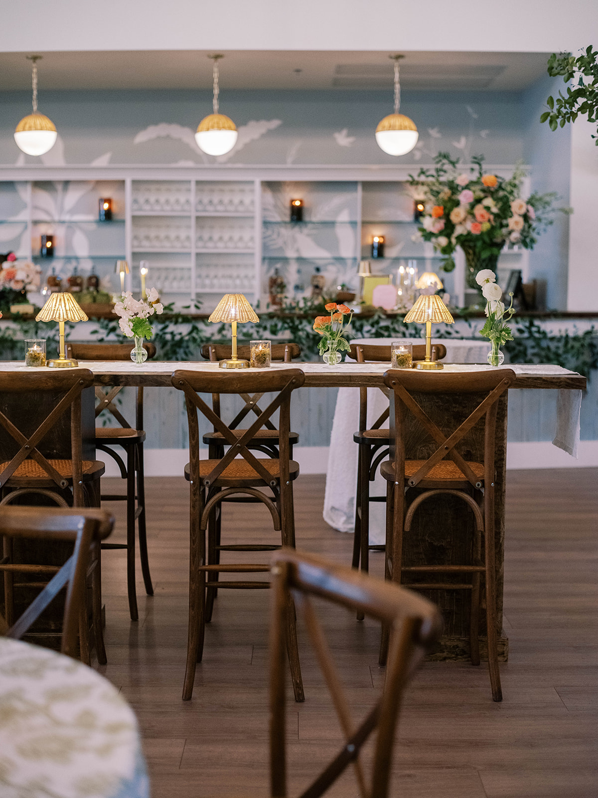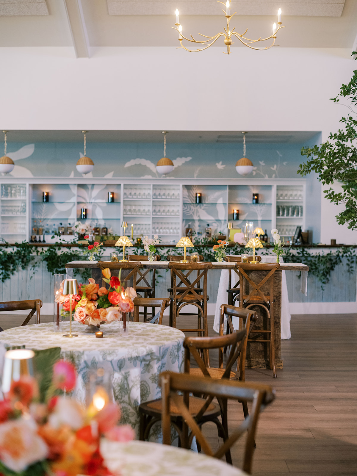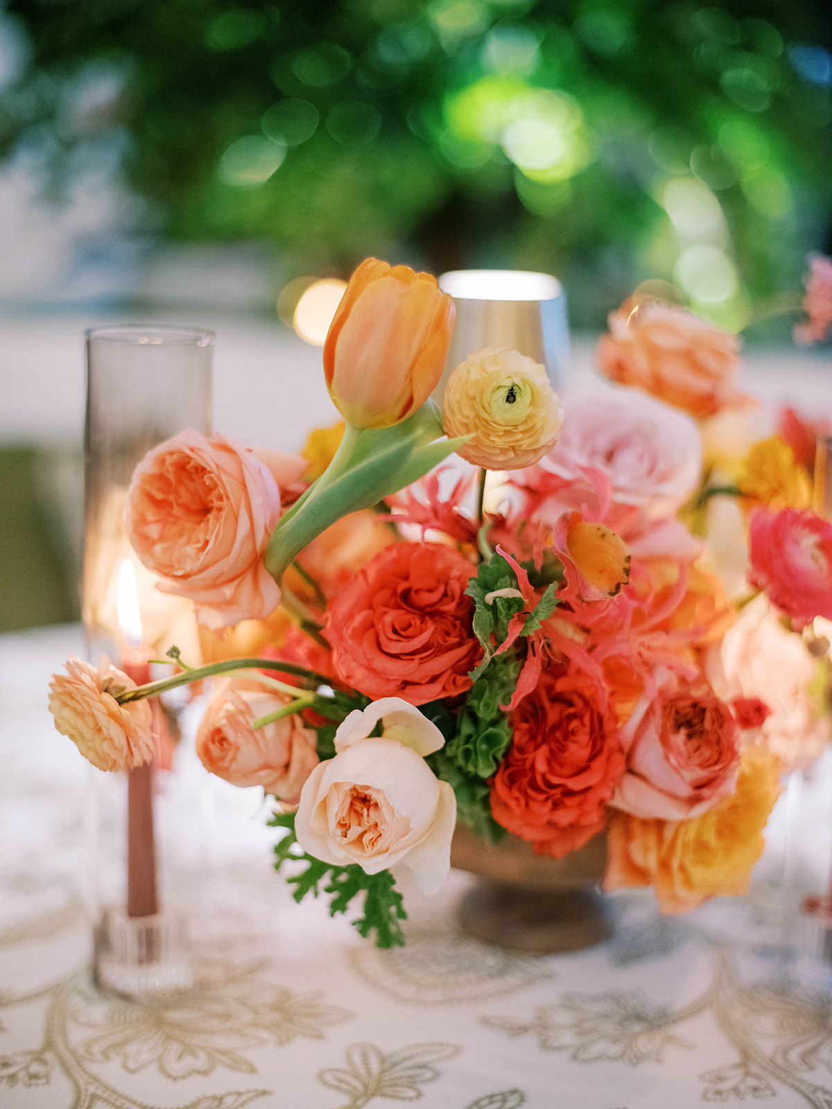 Shields loves soft, romantic lighting (as do I!), and there was a big focus on candlelight, tabletop lamps, and pin lighting in the potted trees and urns. We brought in so many olive green and brown taper candles, loads of thoughtfully placed rattan table lamps and mini gold table lamps, and enlisted the best lighting team from High Performance Lighting to ensure those statement trees stood out once the sun went down and dancing really ramped up.