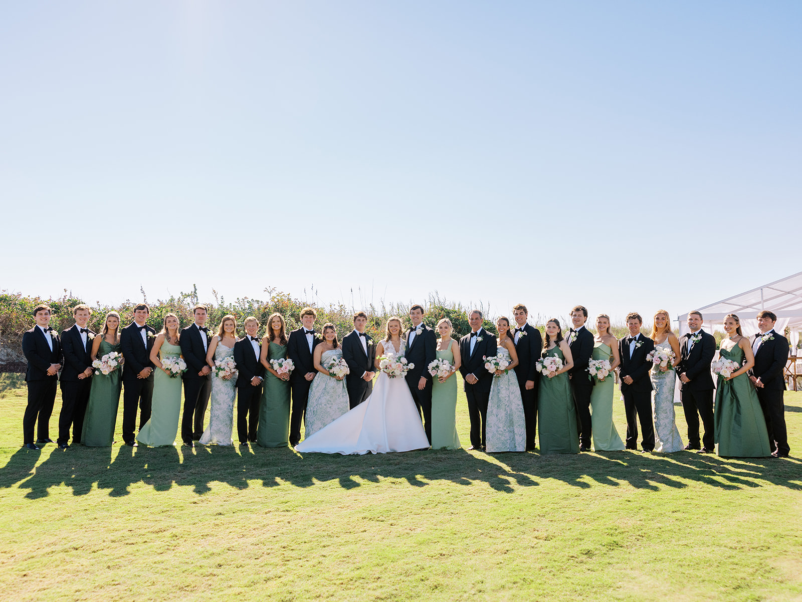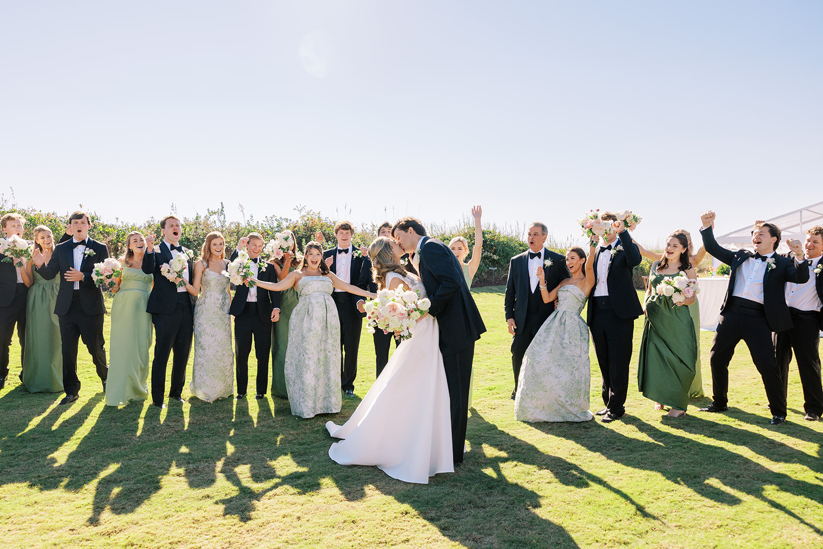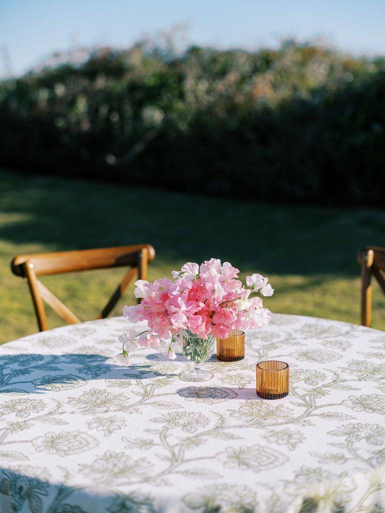 Shields and David wanted their wedding to be timeless, classic, and elevated yet with a polished, fresh, and fun twist, and I think we achieved just that! From the clear top ceremony tent overlooking the ocean to the lush colorful florals and six towering potted trees to the statement olive draping and banquette seating with magnificent greenery urns to a bold olive and white checkered dance floor to romantic candles and lighting with gorgeous linens, layered vignettes to countless personalized details. Above all, there was a sincere focus on celebration, gathering, fun, and heartfelt hospitality that married a bold and memorable design with an understated elegance and celebratory touch.