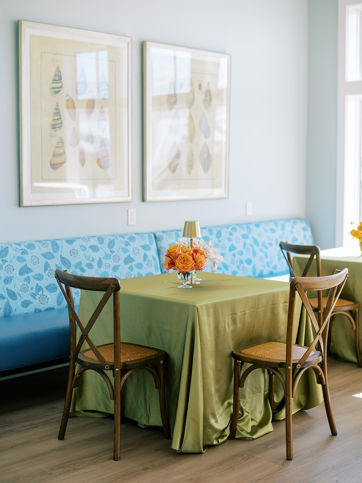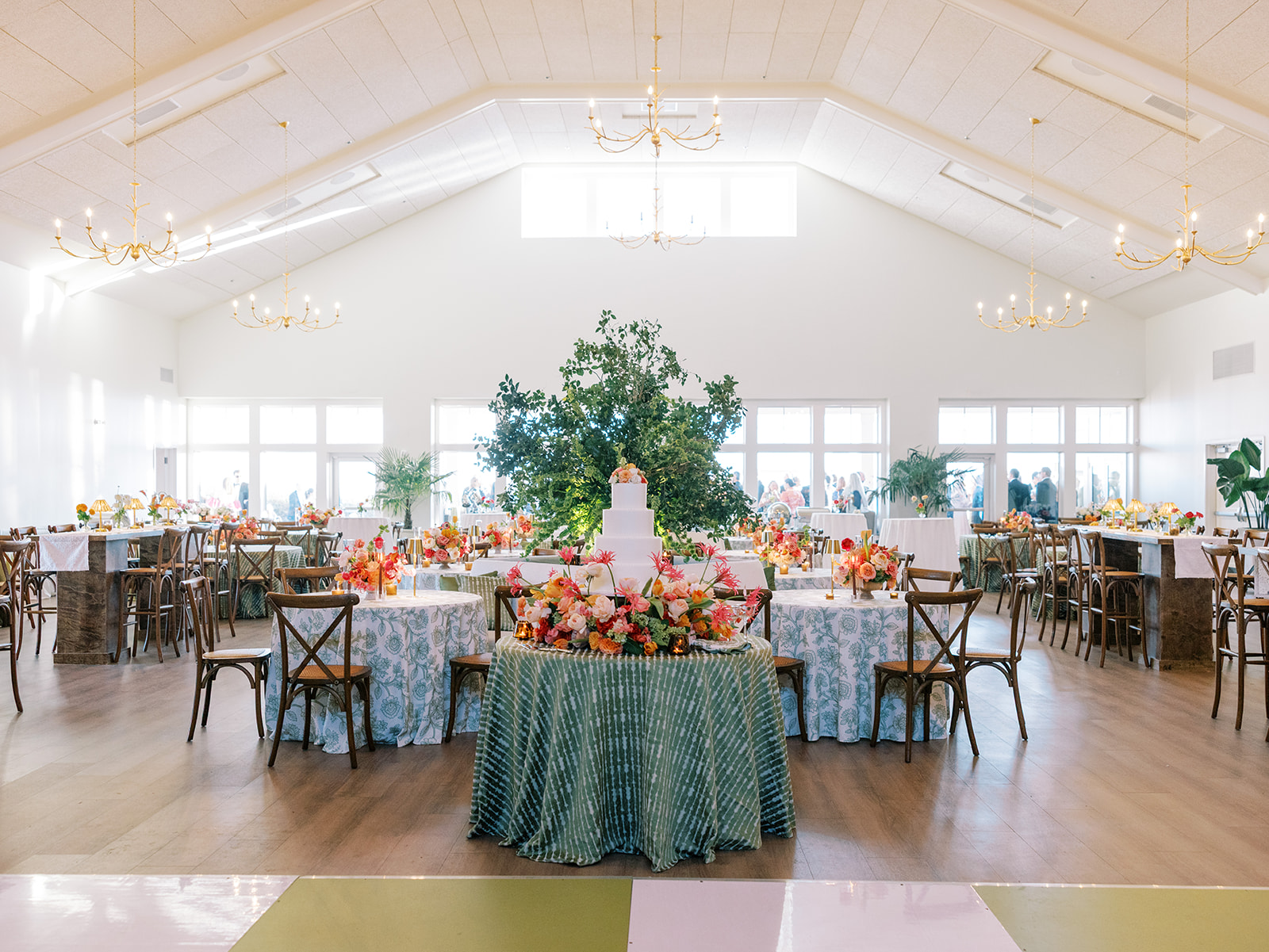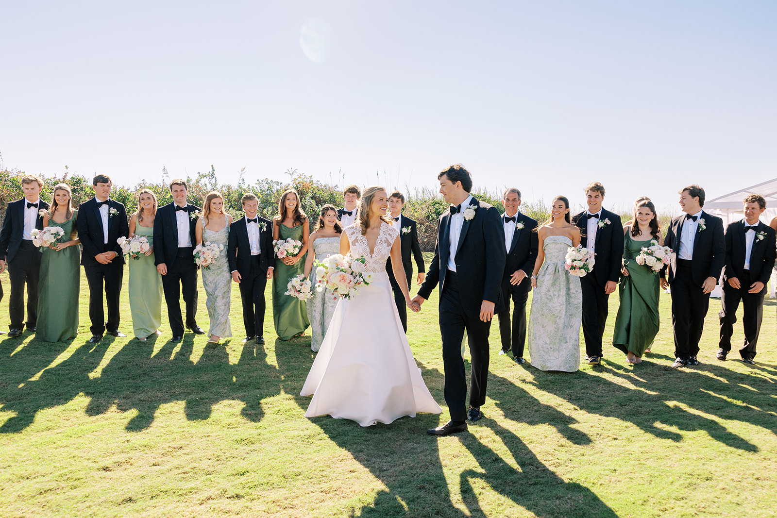Shields and David wanted their wedding to be timeless, classic, and elevated yet with a polished, fresh, and fun twist, and I think we achieved just that! From the clear top ceremony tent overlooking the ocean to the lush colorful florals and six towering potted trees to the statement olive draping and banquette seating with magnificent greenery urns to a bold olive and white checkered dance floor to romantic candles and lighting with gorgeous linens, layered vignettes to countless personalized details. Above all, there was a sincere focus on celebration, gathering, fun, and heartfelt hospitality that married a bold and memorable design with an understated elegance and celebratory touch.