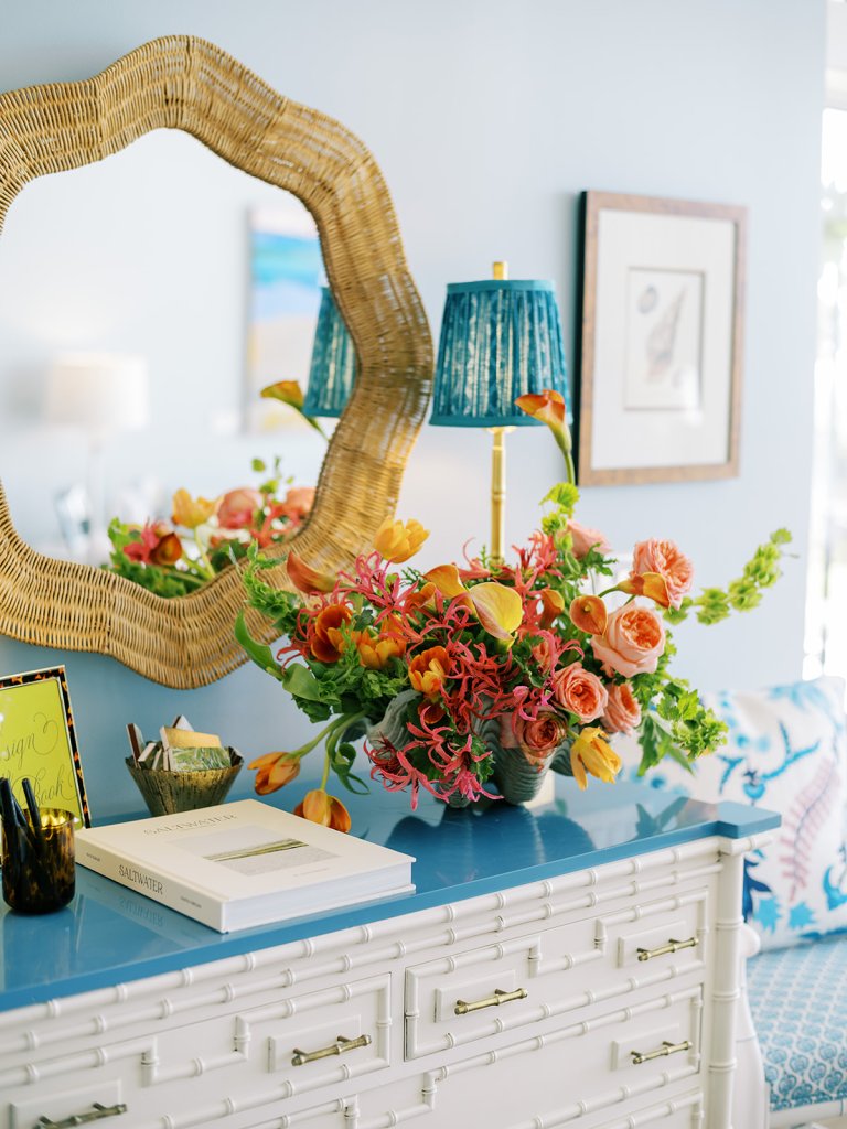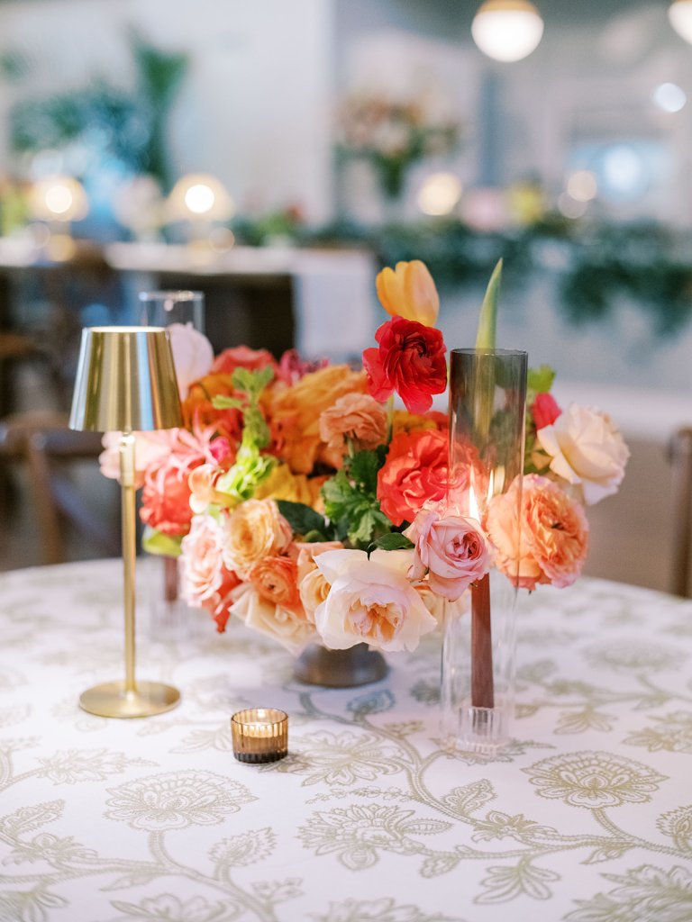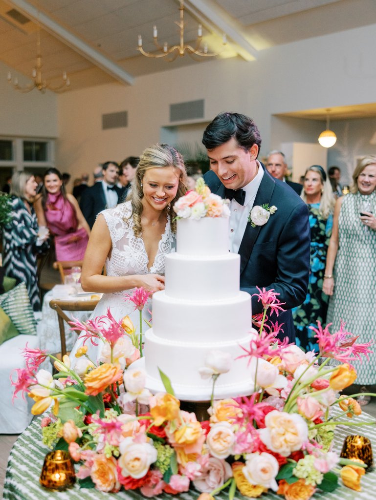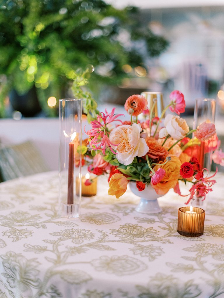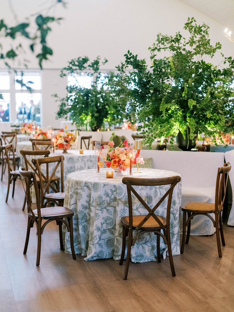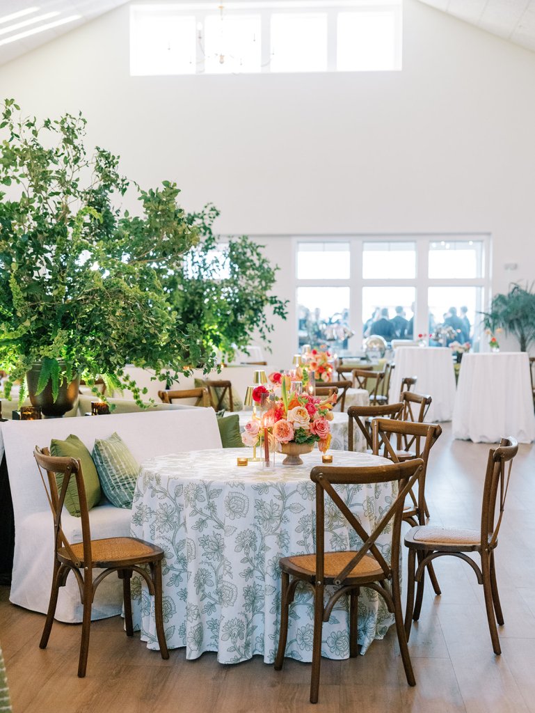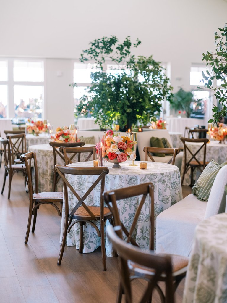 Cocktail hour took place on the open lawn overlooking the ocean, the covered terrace adjacent to the lawn, and the adjoining Ocean Room with a wall of windows overlooking the ocean, custom Atlantic Beach-inspired Gracie wallpaper, and gorgeous statement rattan chandeliers. We turned up the color with vibrant hot pink, orange, chartreuse, and olive paired with tortoiseshell accents and dark rattan features. I really wanted to make both the cocktail hour and reception design feel like “home” with gorgeous styled vignettes (with a purpose), welcoming seating arrangements, and ample details that really shone.