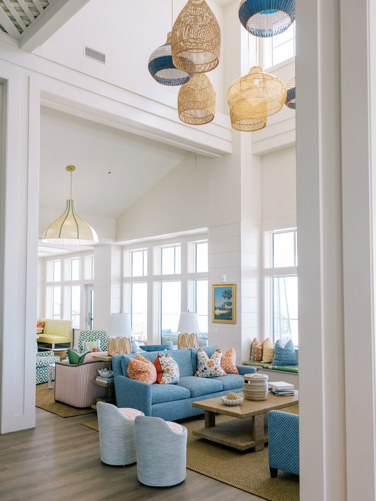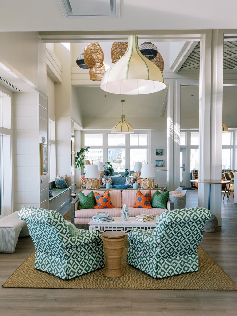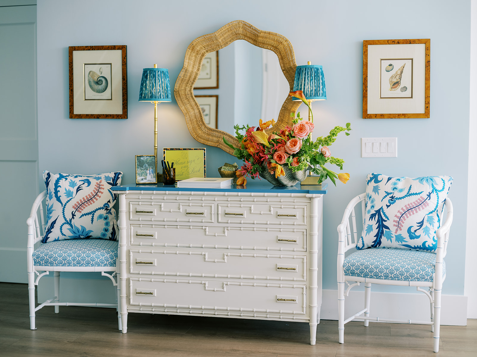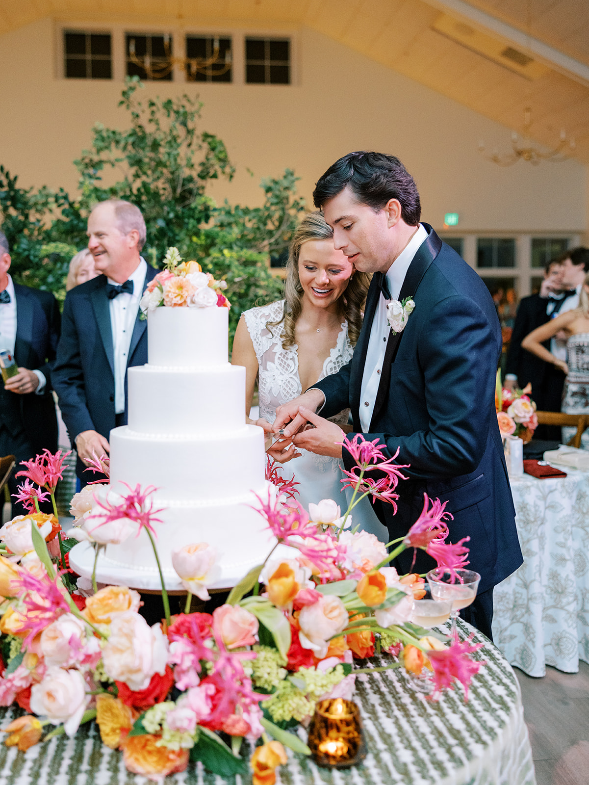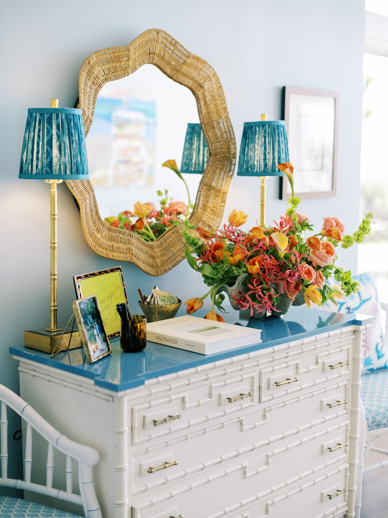 Cocktail hour took place on the open lawn overlooking the ocean, the covered terrace adjacent to the lawn, and the adjoining Ocean Room with a wall of windows overlooking the ocean, custom Atlantic Beach-inspired Gracie wallpaper, and gorgeous statement rattan chandeliers. We turned up the color with vibrant hot pink, orange, chartreuse, and olive paired with tortoiseshell accents and dark rattan features. I really wanted to make both the cocktail hour and reception design feel like “home” with gorgeous styled vignettes (with a purpose), welcoming seating arrangements, and ample details that really shone.